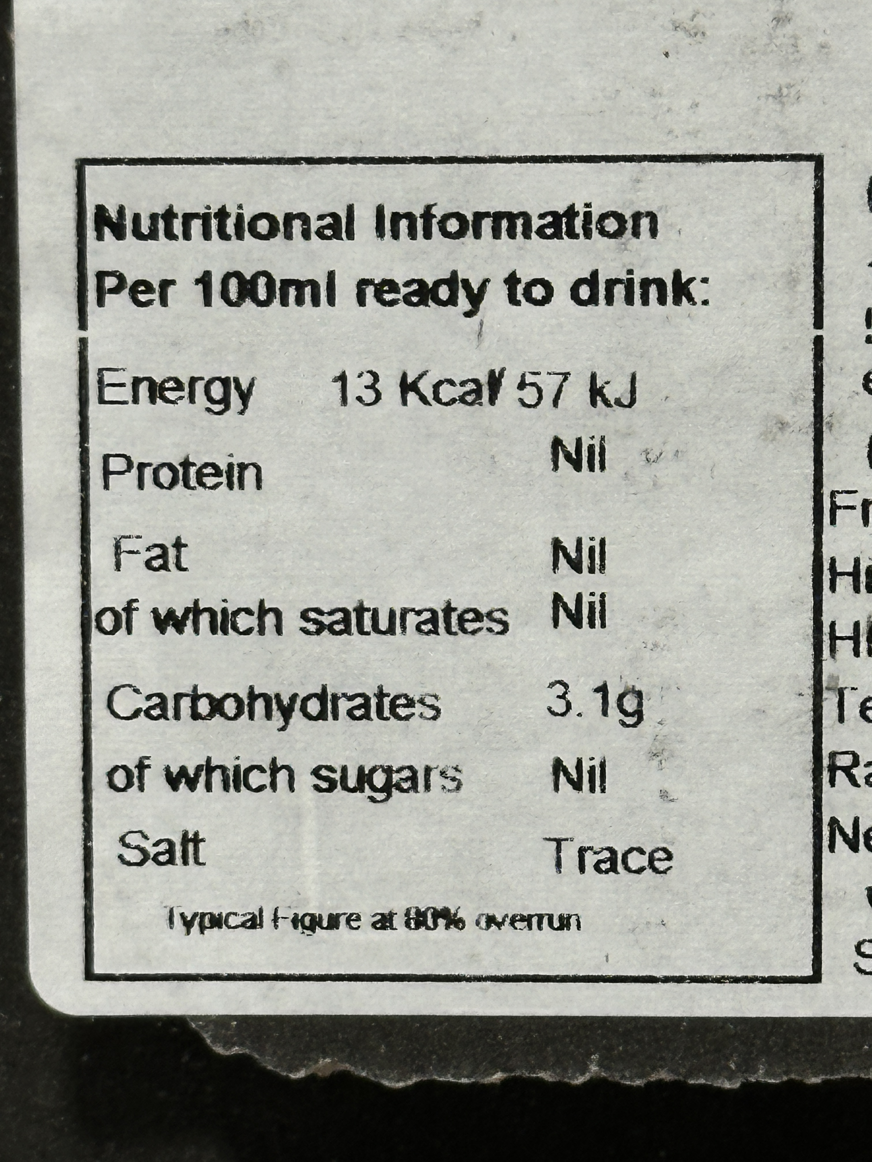 Ingredients: Water, Acids (Citric Acid, Malic Acid), Flavourings, Sweeteners (Acesulfame K, Sucralose), Preservatives (Potassium Sorbate), Colours (Caramel E150d, Anthocyanins).