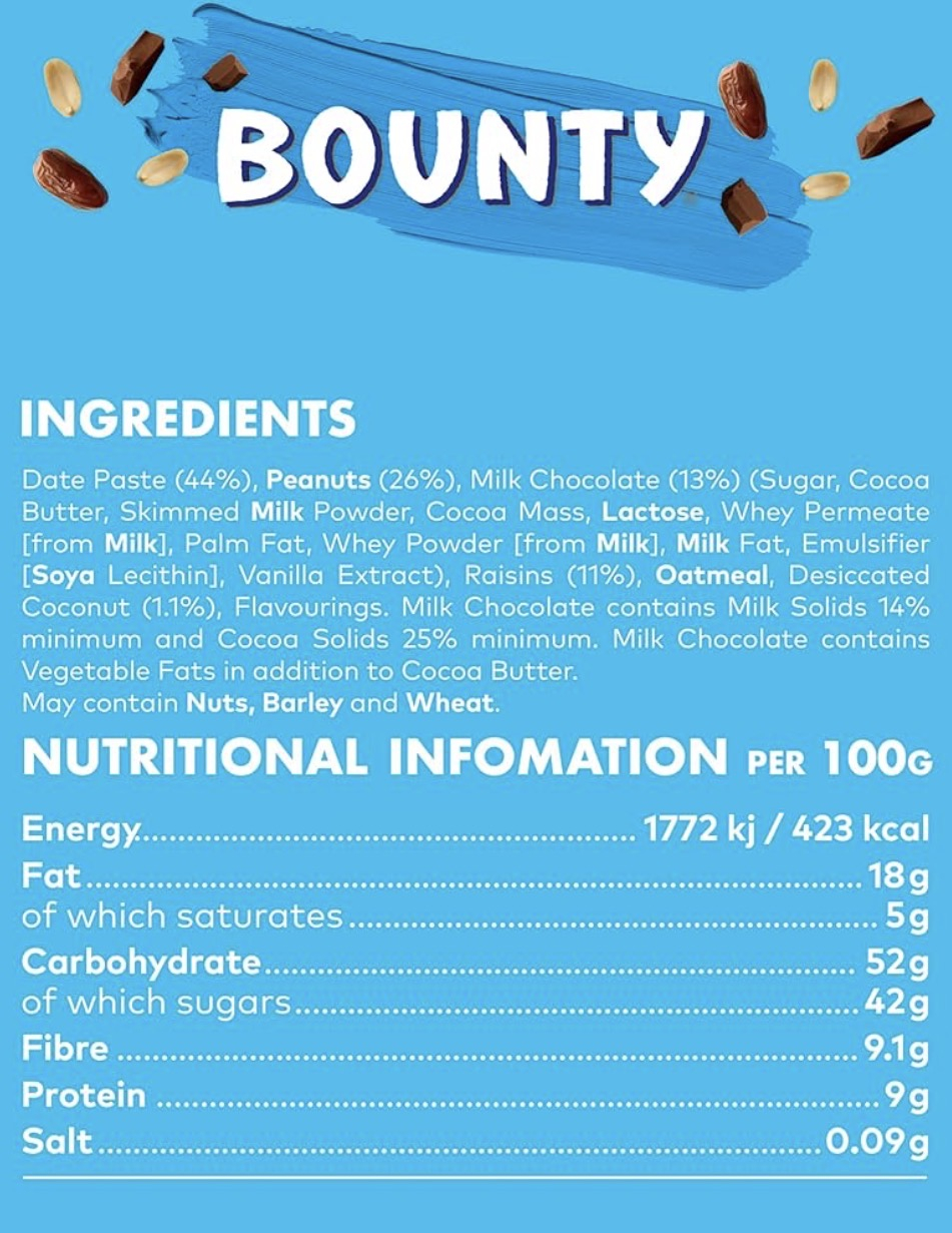 Date Paste (44%), Peanuts (26%), Milk Chocolate (13%) (Sugar, Cocoa Butter, Skimmed Milk Powder, Cocoa Mass, Lactose, Whey Permeate [from Milk], Palm Fat, Whey Powder [from Milk], Milk Fat, Emulsifier [Soya Lecithin], Vanilla Extract), Raisins (11%), Oatmeal, Desiccated Coconut (1.1%), Flavourings.