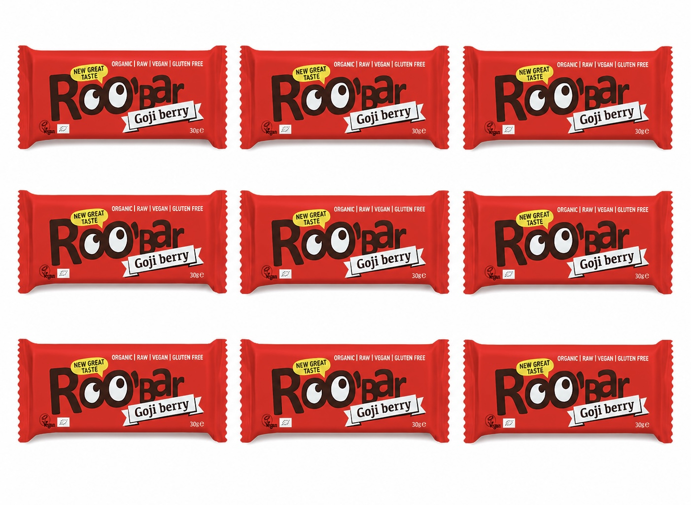 Roobar Goji Berry Raw Bar - Dairy & Gluten Free. 100% Organic, Vegan with Superfoods 9 X 30g Bars