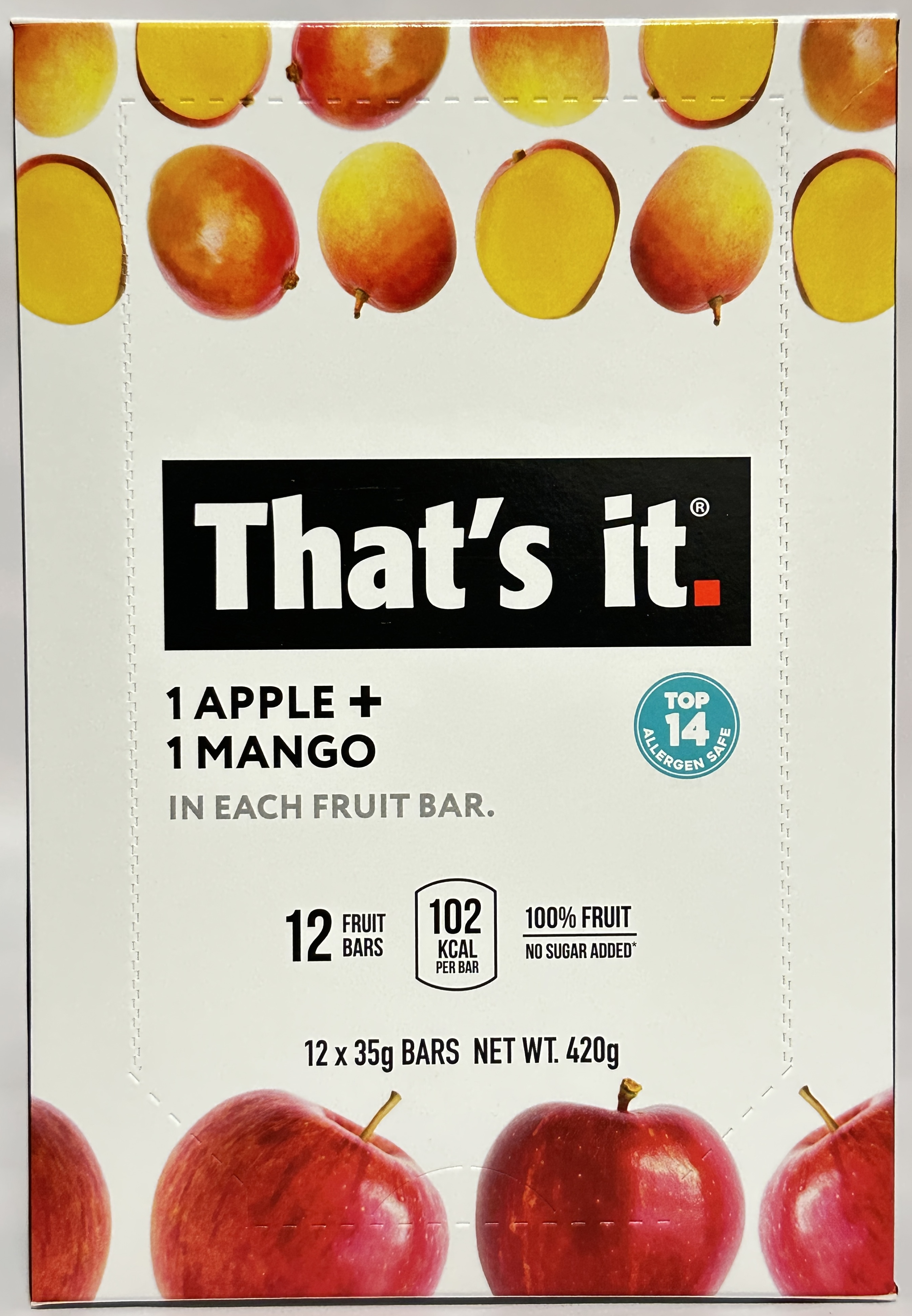 These That’s it. Apple & Mango Fruit Bars are made using only two ingredients — 1 whole apple and 1 whole mango per bar. With no added sugar, preservatives, or artificial ingredients, each bar is a clean, natural source of fruit energy.