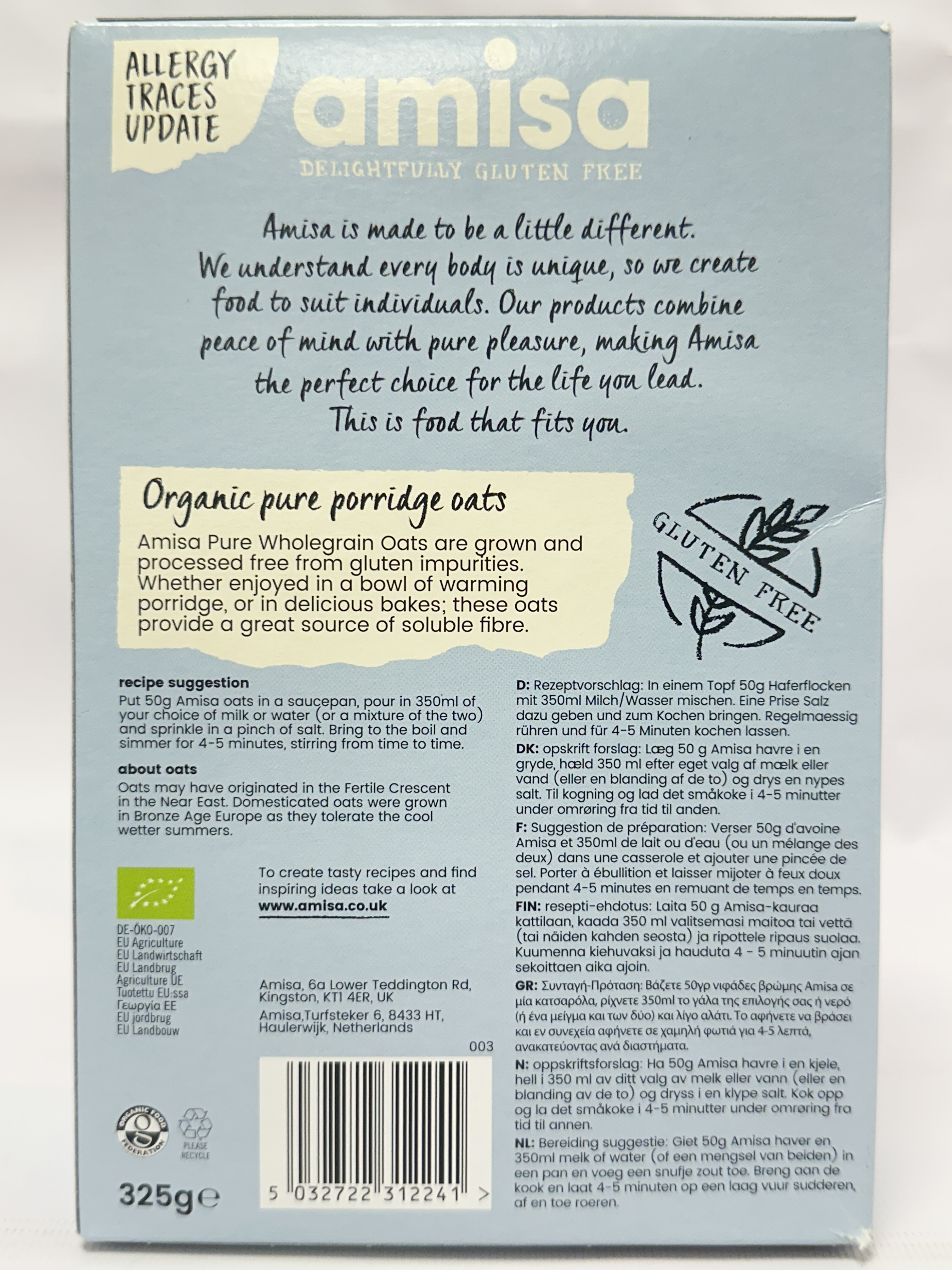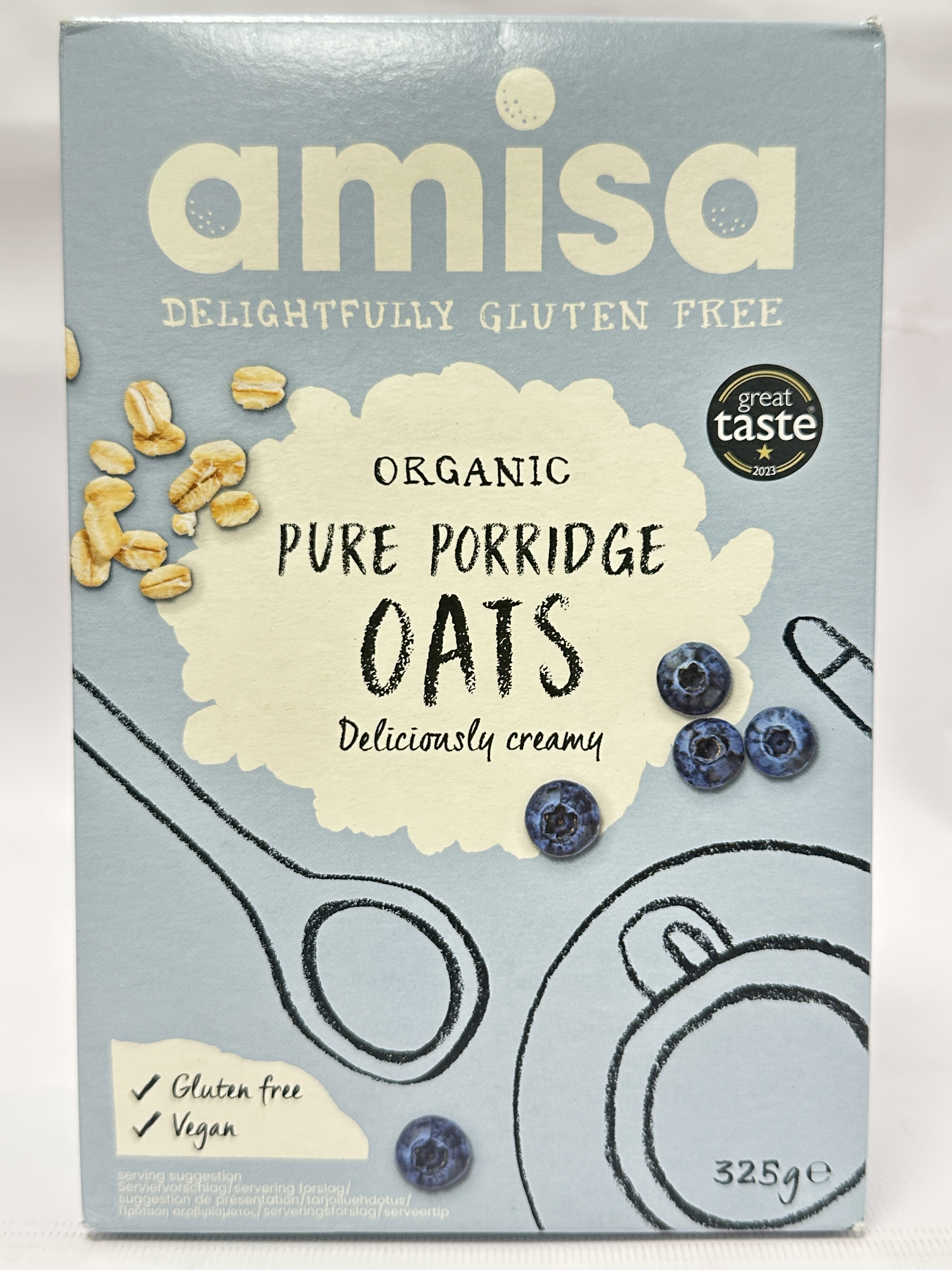 Amisa Organic Gluten Free Pure Porridge Oats – 325g Wholegrain Oats