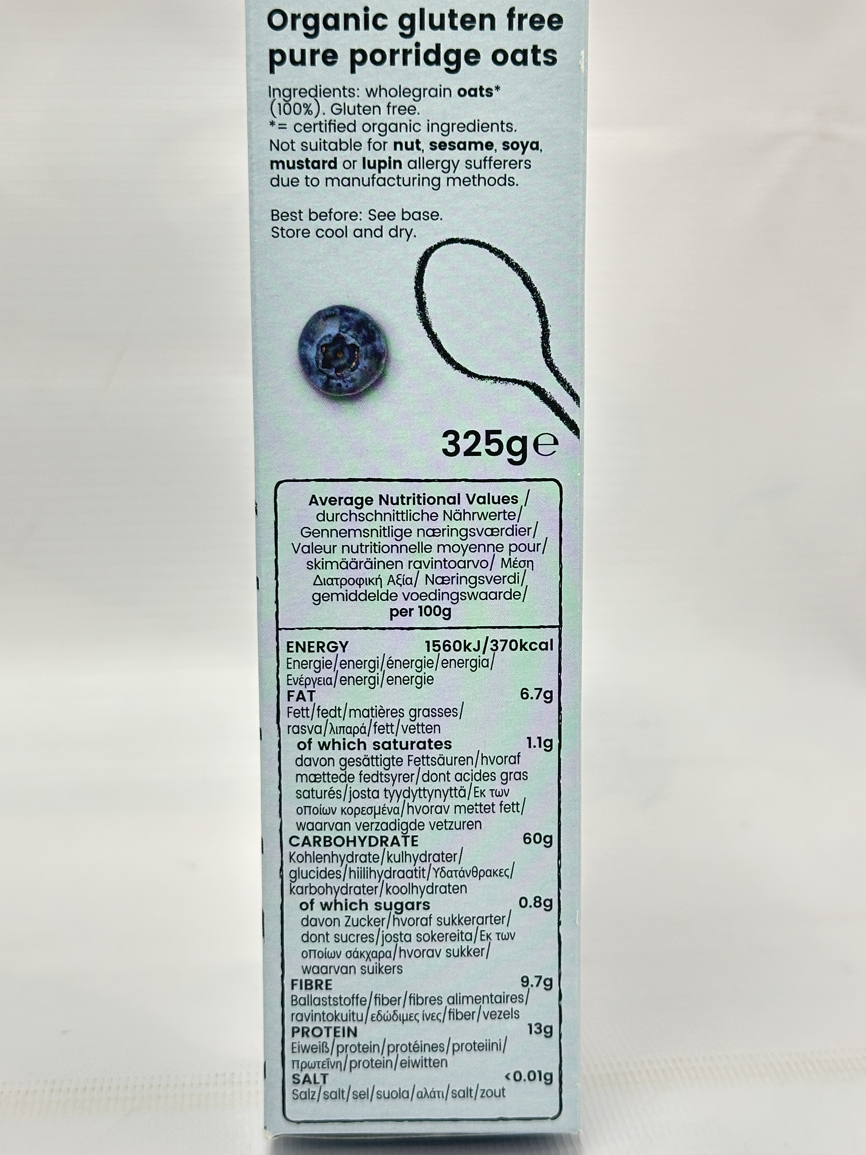 This pack contains 325g of organic gluten free oats, suitable for vegan diets and ideal for anyone looking for simple wholegrain ingredients.