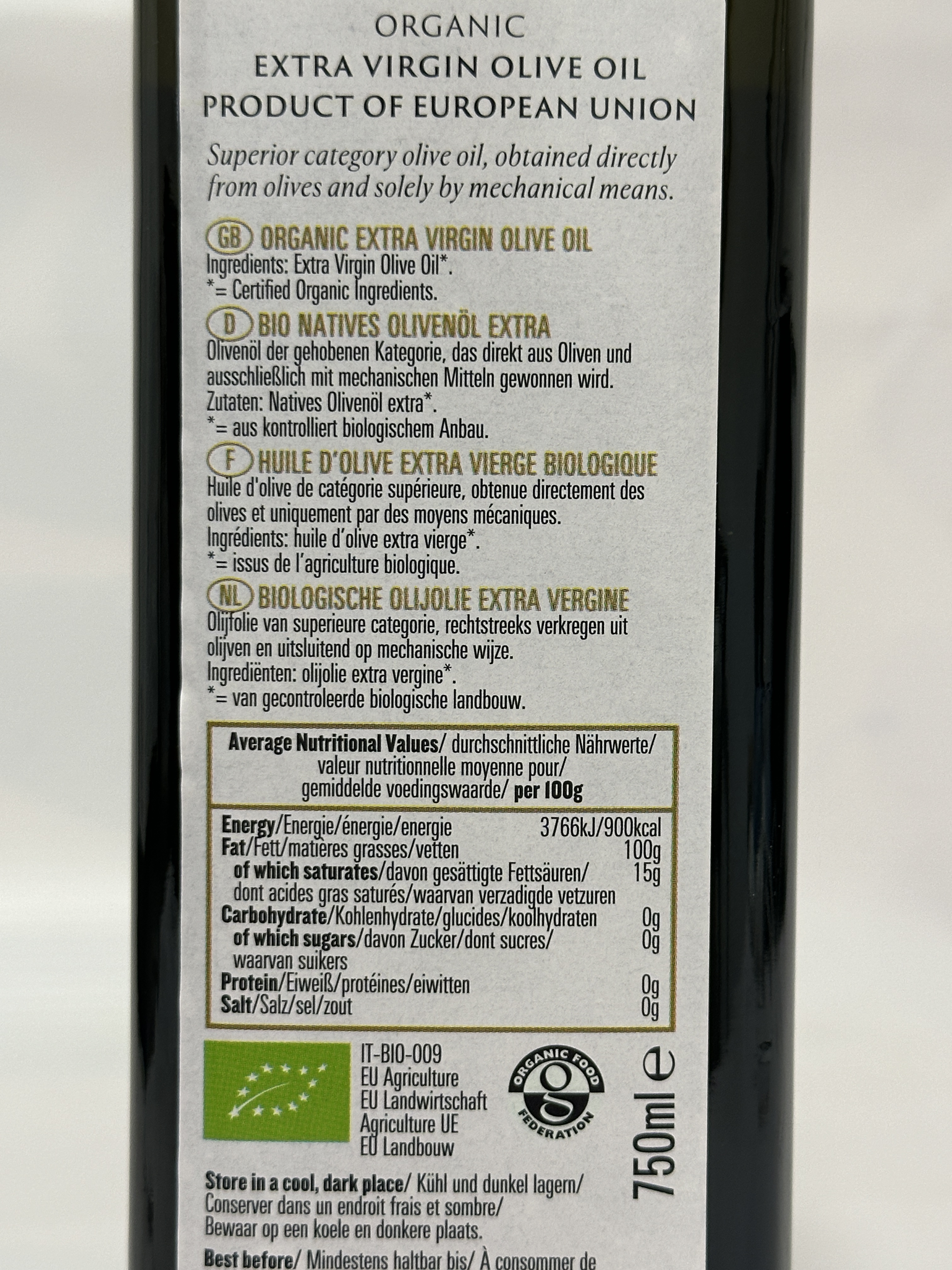 • 100% organic extra virgin olive oil – cold-pressed and unrefined
