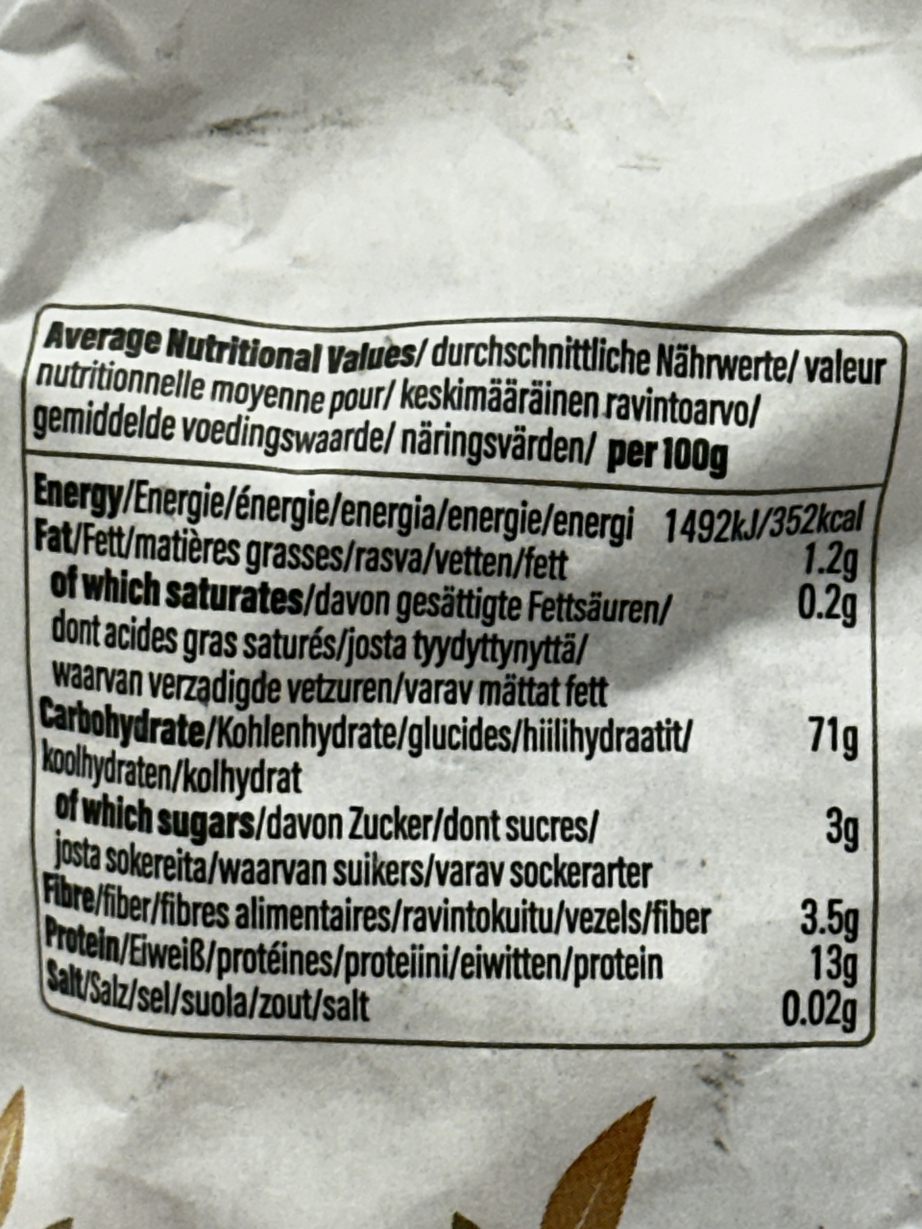 Per 100g: Energy 1492kJ / 352kcal, Fat 1.2g, of which saturates 0.2g, Carbohydrate 71g, of which sugars 3g, Fibre 3.5g, Protein 13g, Salt 0.02g.