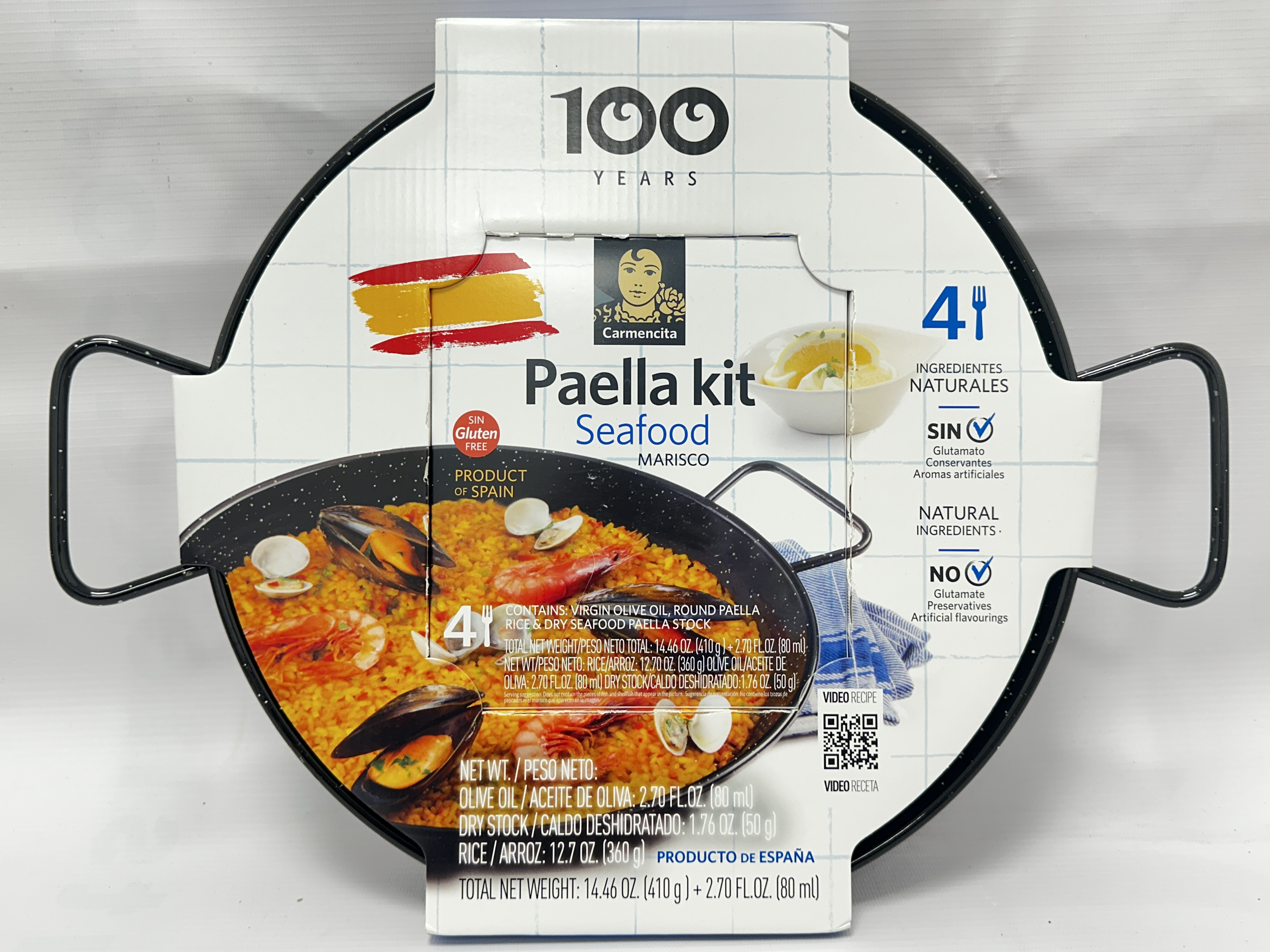 Carmencita Seafood Paella Kit is a complete Spanish cooking kit designed to help you make a traditional seafood paella at home. This ready-to-use set includes an enamelled pan, round paella rice, extra virgin olive oil and dehydrated broth, giving you a practical all-in-one option for preparing paella for 4 people.