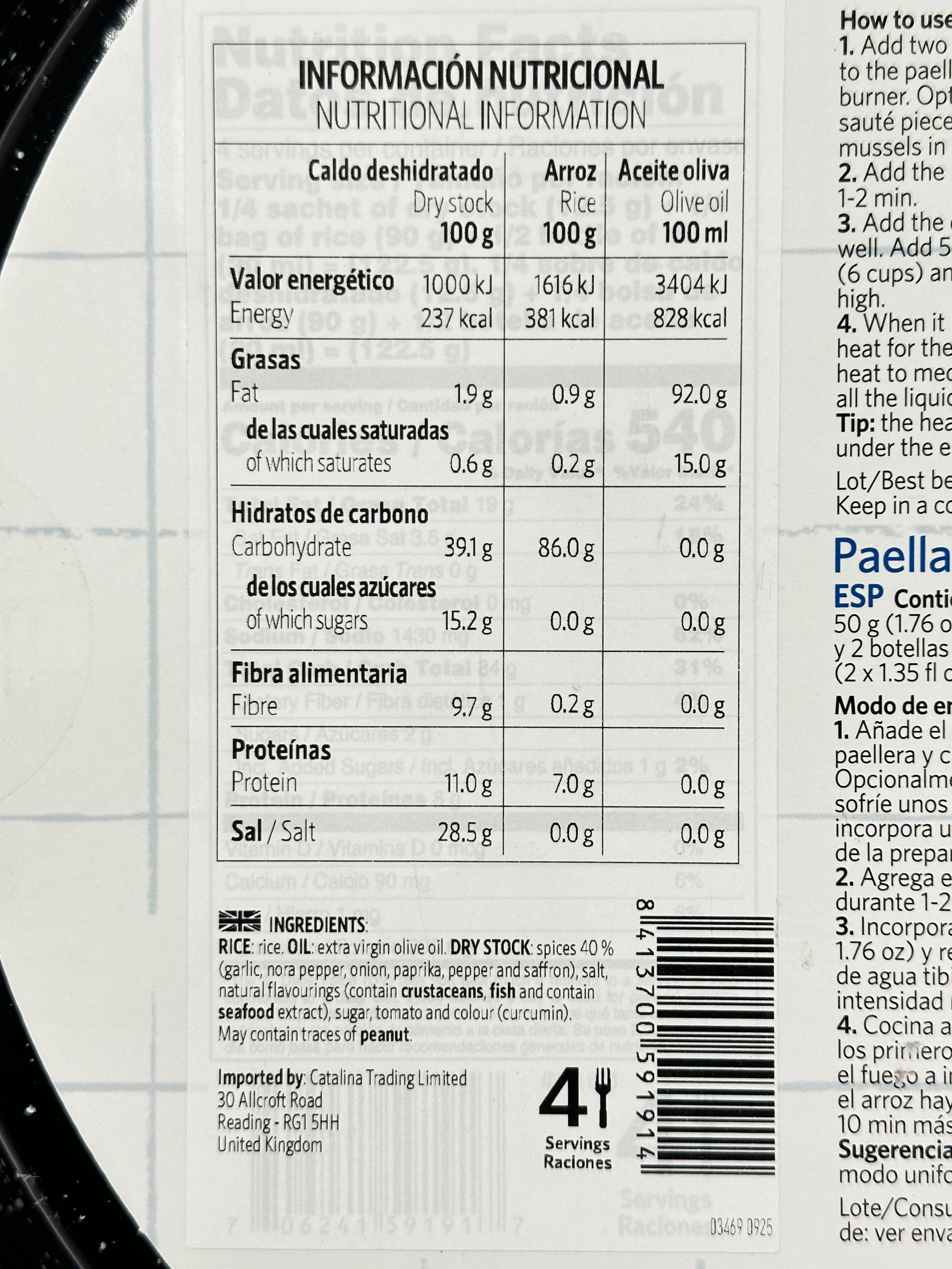 - Contains round paella rice, extra virgin olive oil and dehydrated broth