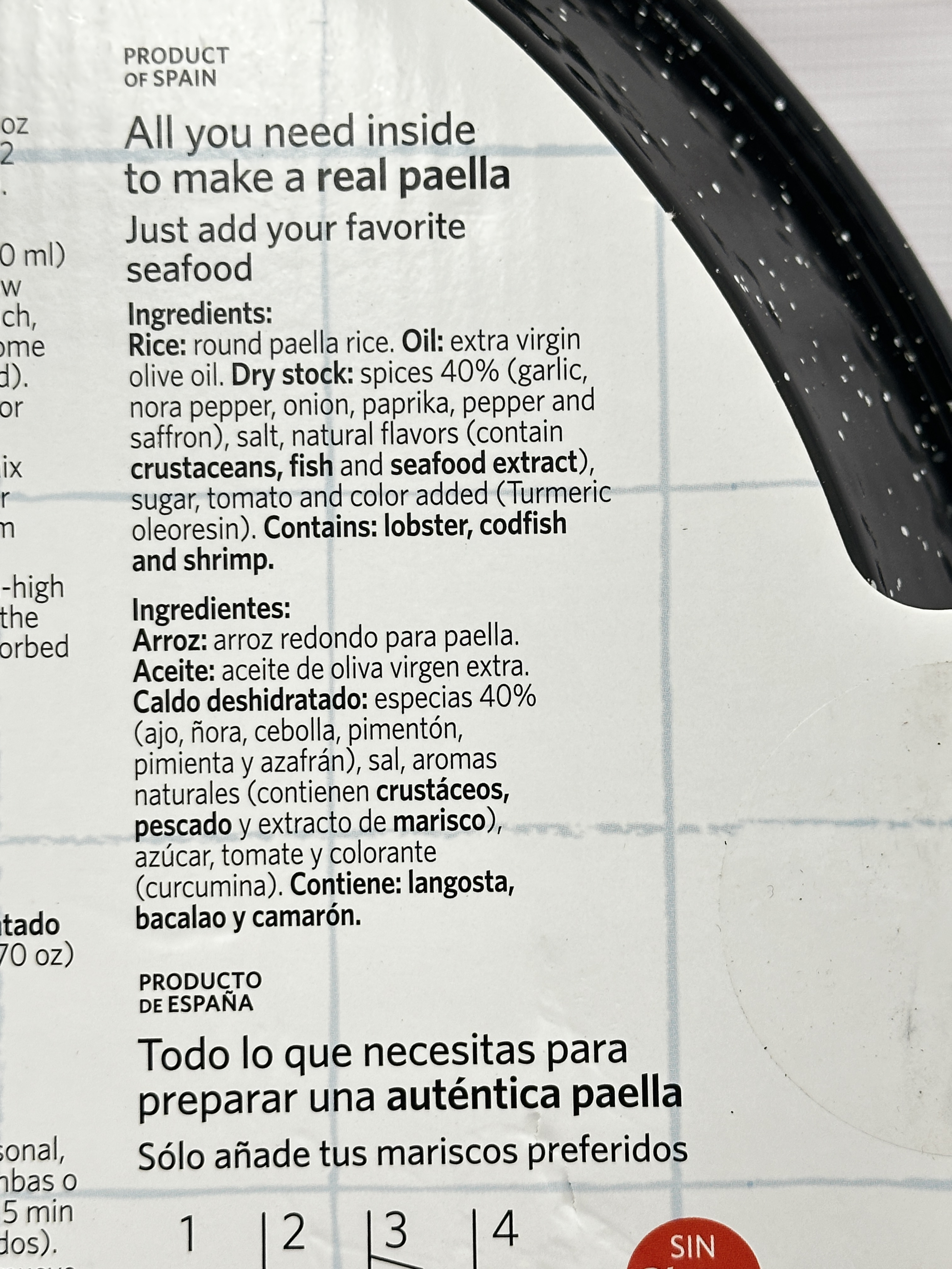 Dry stock: Spices 40% (garlic, nora pepper, onion, paprika, pepper and saffron), salt, natural flavors (contain crustaceans, fish and seafood extract), sugar, tomato and color added (Turmeric oleoresin).
