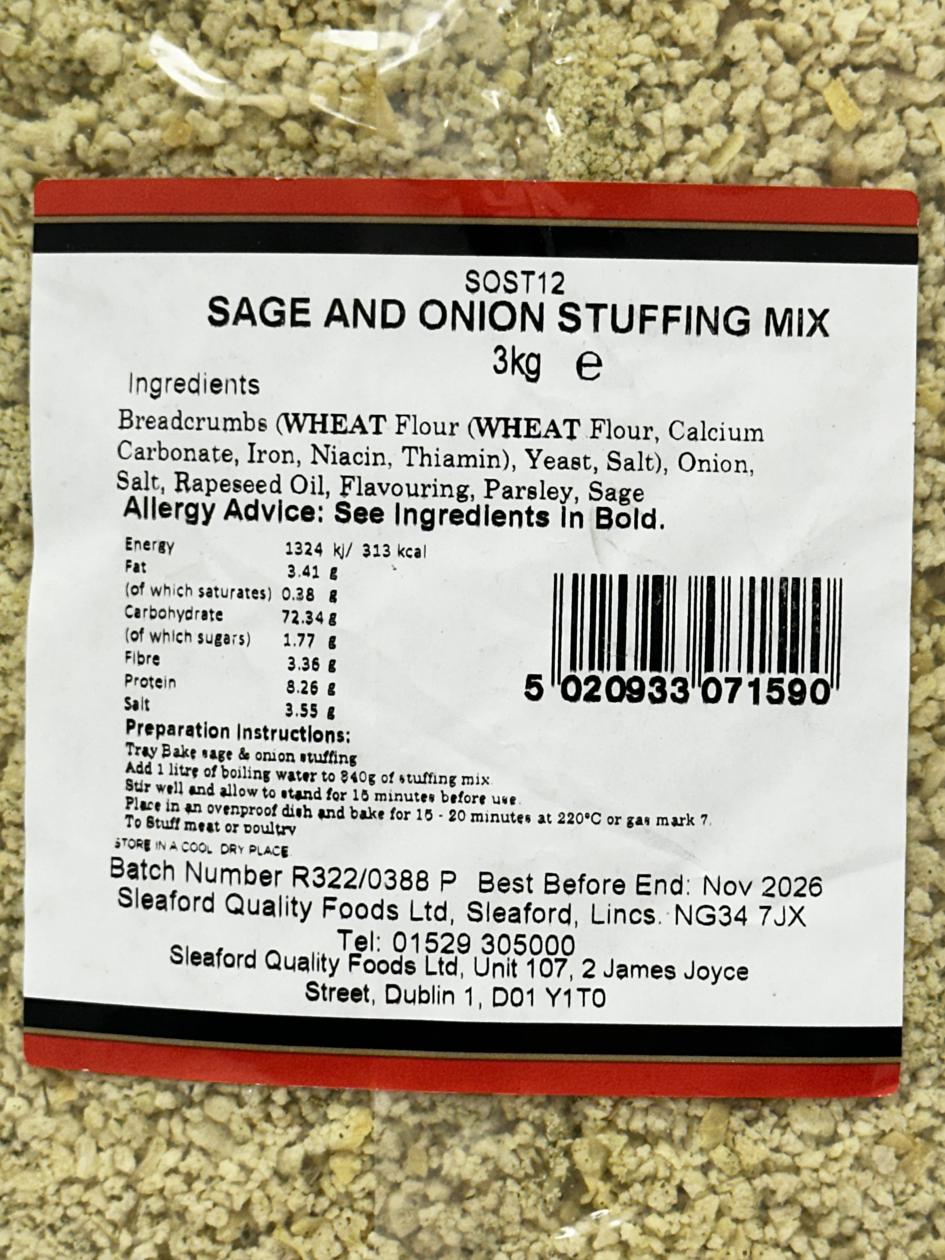 Designed for simple preparation, this mix can be stirred with boiling water, left to stand and then baked until golden. The larger pack format makes it a practical cupboard staple for caterers, busy kitchens and anyone wanting a bulk stuffing mix on hand.
