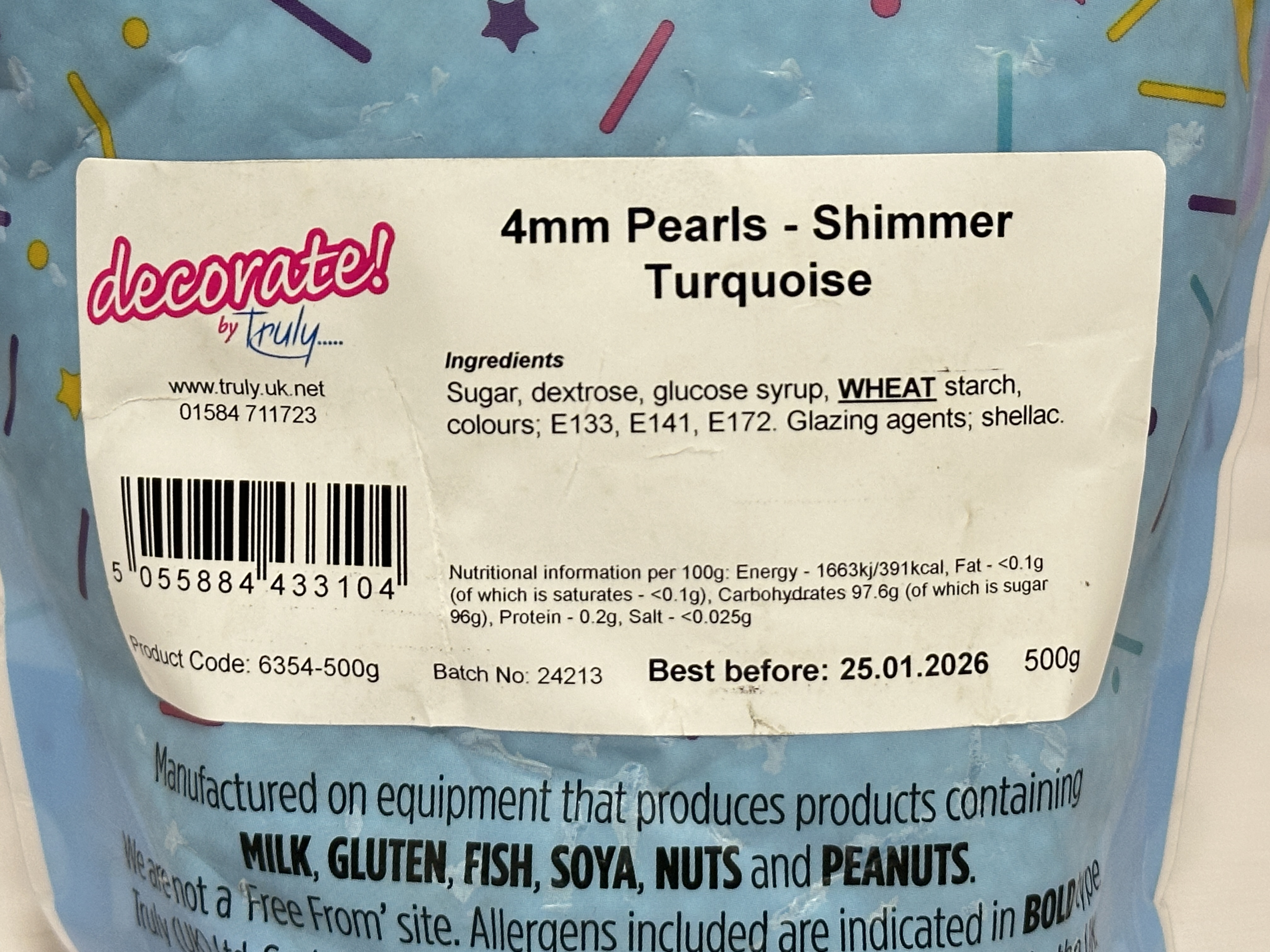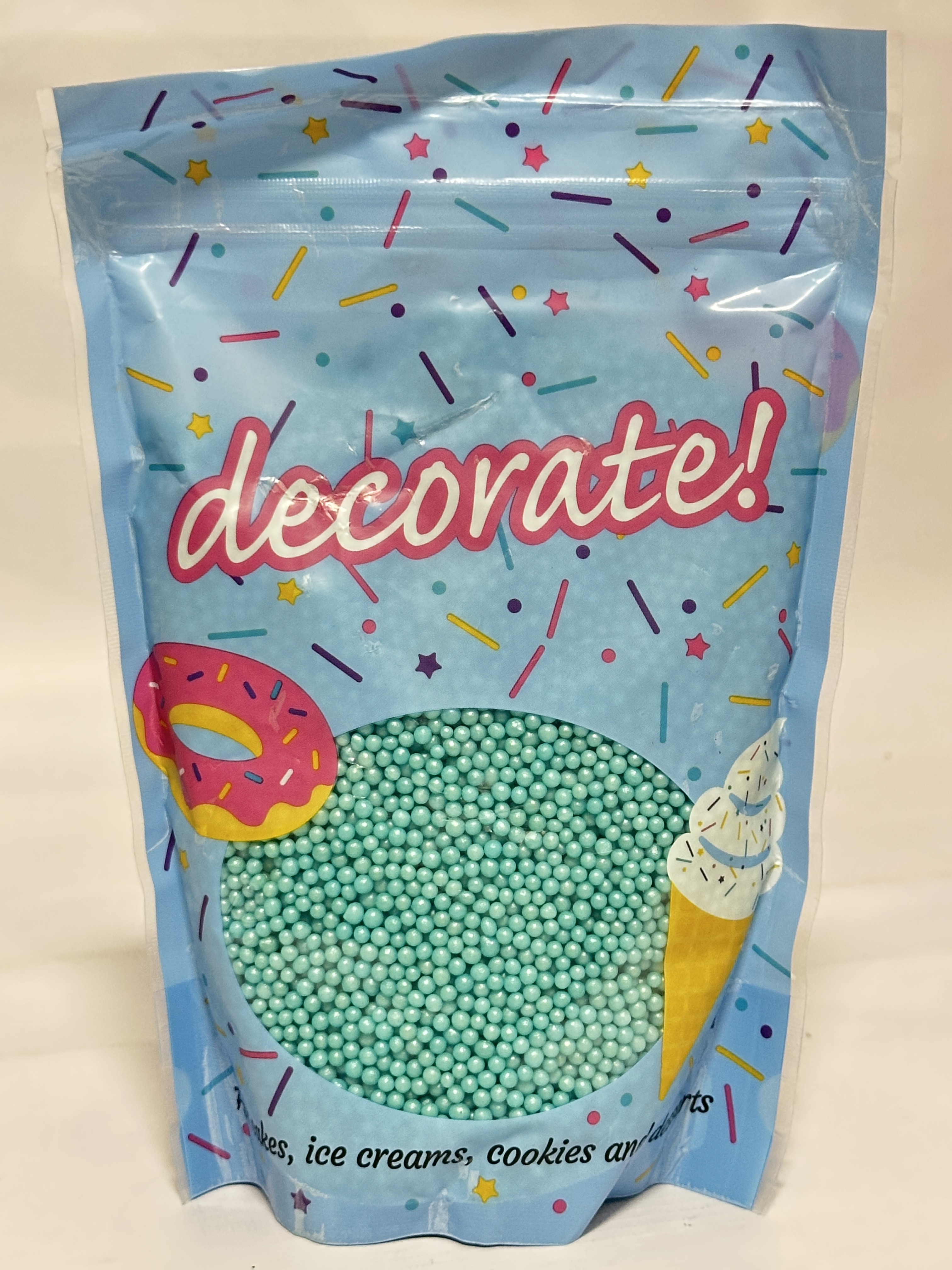 Decorate! Shimmer Turquoise Sugar Pearls are edible 4 mm sugar balls designed for decorating cakes, cupcakes, cookies, ice creams and desserts. Finished with a shimmering turquoise colour, these pearls are suitable for themed bakes including weddings, christenings, mermaid, Bluey and Stitch–inspired celebrations. Supplied in a 500 g resealable pouch for convenient storage and repeated use.