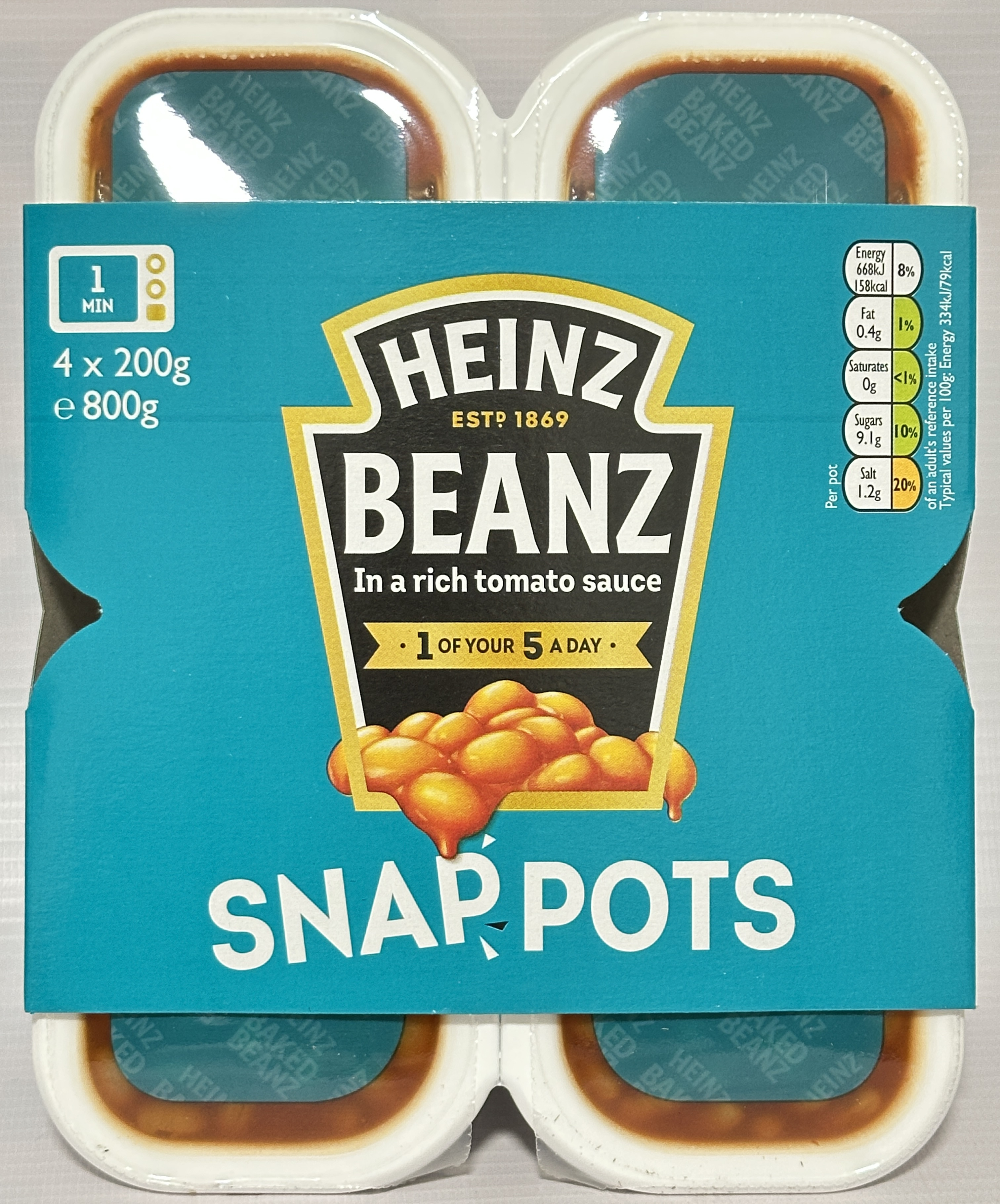 Enjoy the convenience of Heinz Beanz Snap Pots, the quick and mess-free way to enjoy Britain’s favourite baked beans. Each microwavable pot contains perfectly portioned Heinz Beanz in a rich tomato sauce — ready in just one minute.
