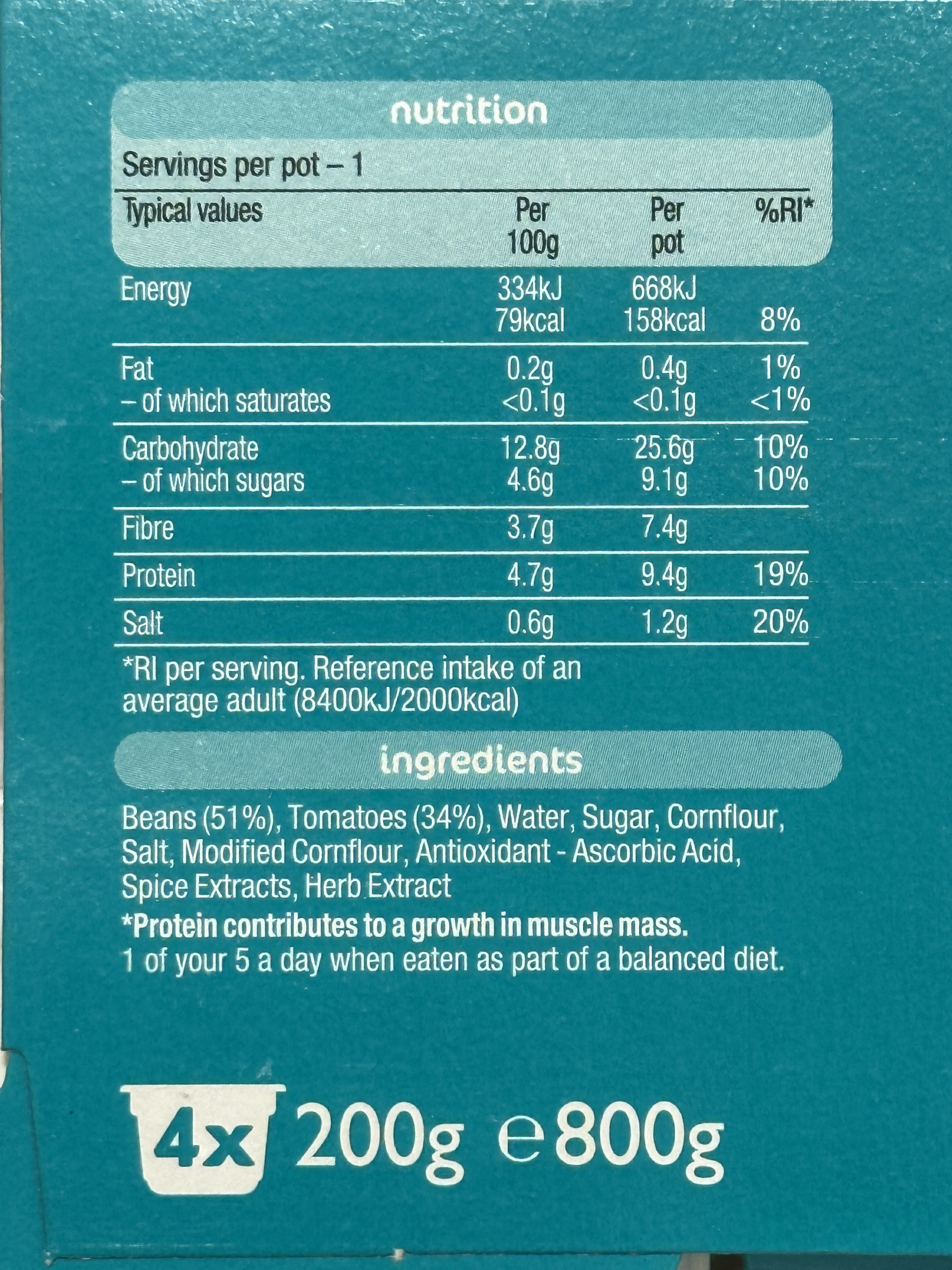 Beans (51%), Tomatoes (34%), Water, Sugar, Cornflour, Salt, Modified Cornflour, Antioxidant (Ascorbic Acid), Spice Extracts, Herb Extract.