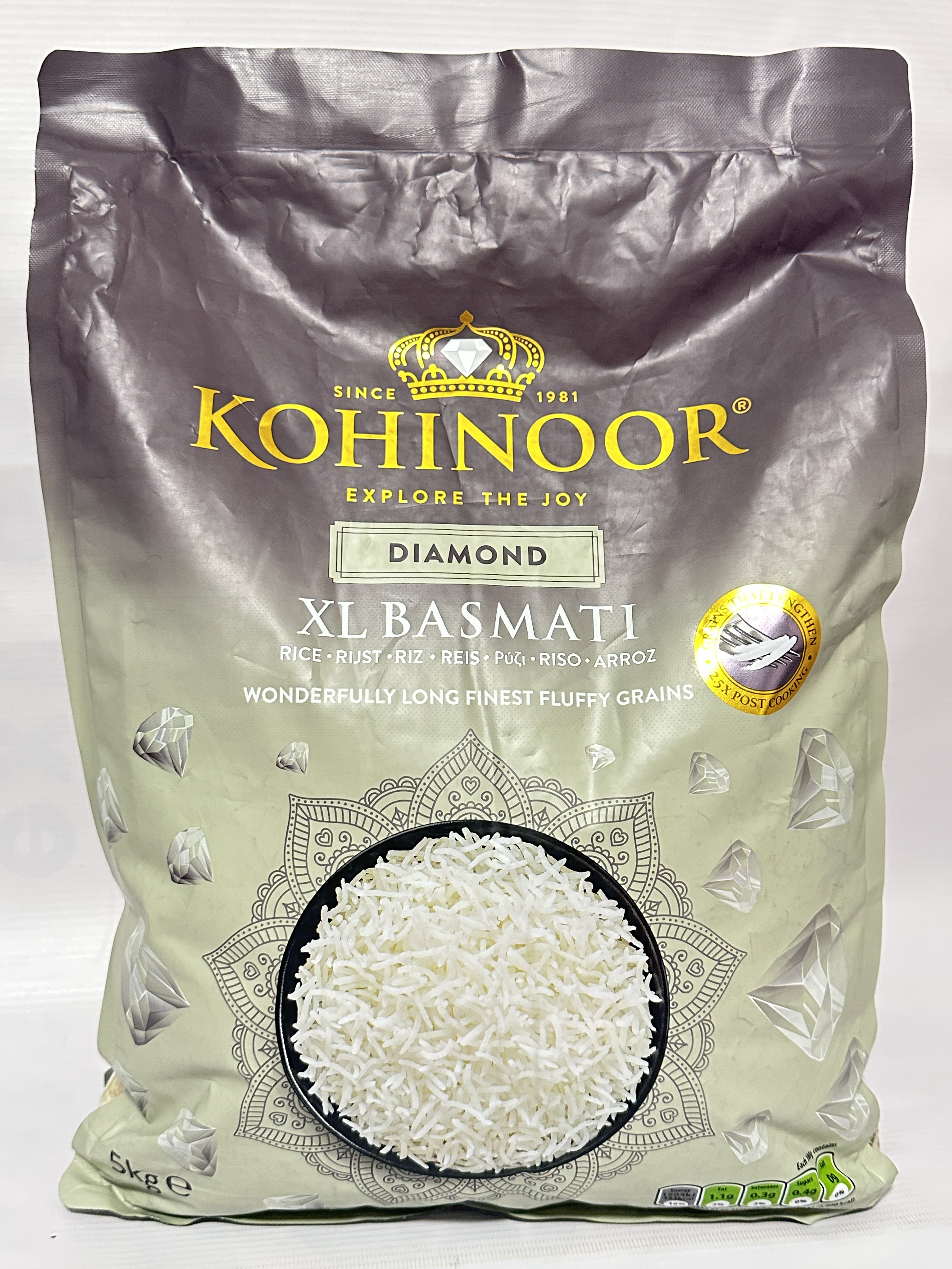 Kohinoor Diamond XL Basmati Rice is expertly selected from the foothills of the Himalayas to deliver extra-long, fluffy grains with a light, aromatic texture. Carefully milled for consistency, this premium basmati rice cooks evenly and separates beautifully, making it ideal for everyday meals as well as special dishes such as biryanis, pilafs, and curries.