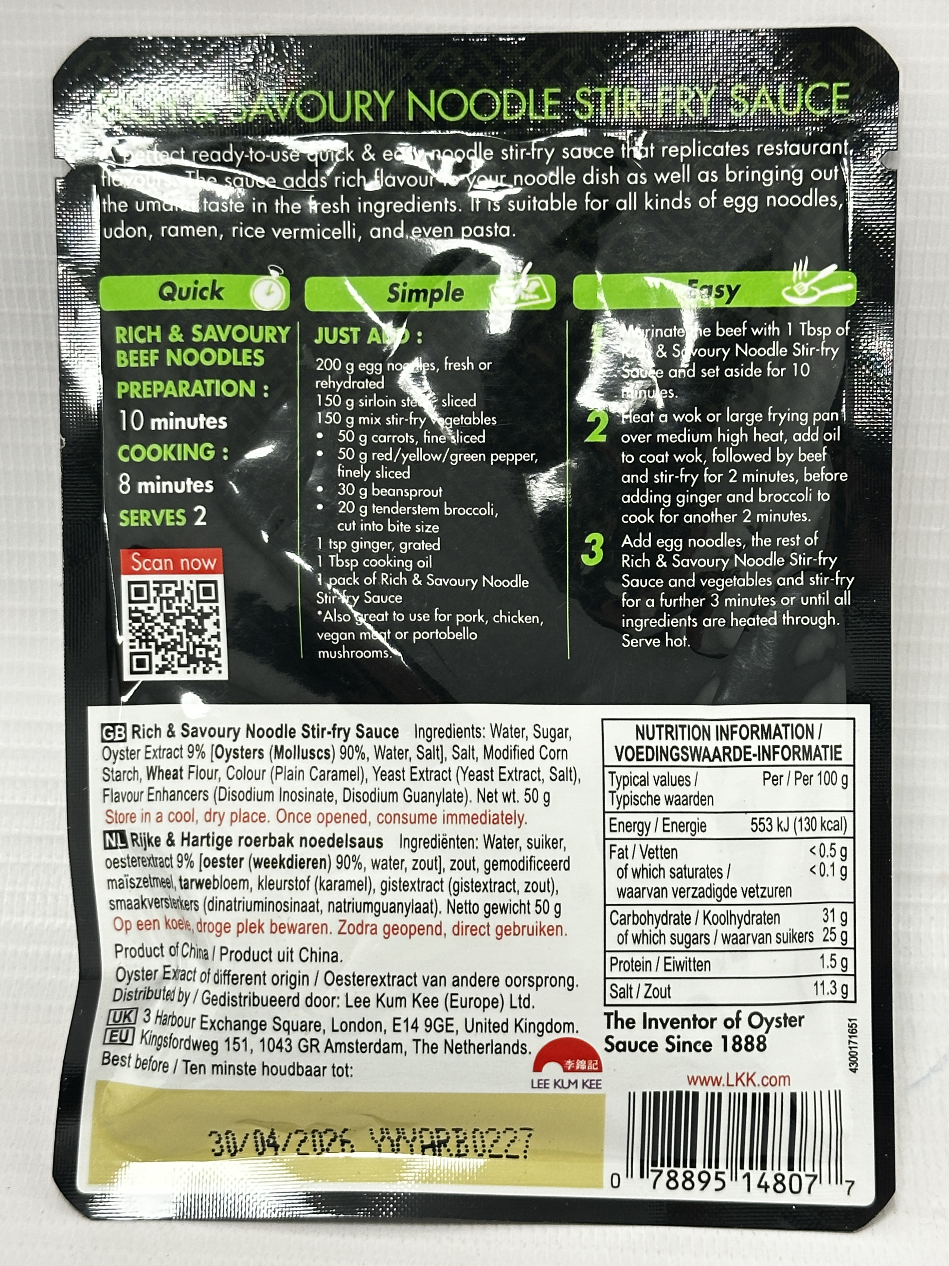 Made with premium oyster sauce, this stir-fry sauce is designed for use with egg noodles, udon, ramen, rice vermicelli and even pasta. It is a practical cupboard sachet for fast midweek meals and works well with beef, chicken, pork or vegetables.