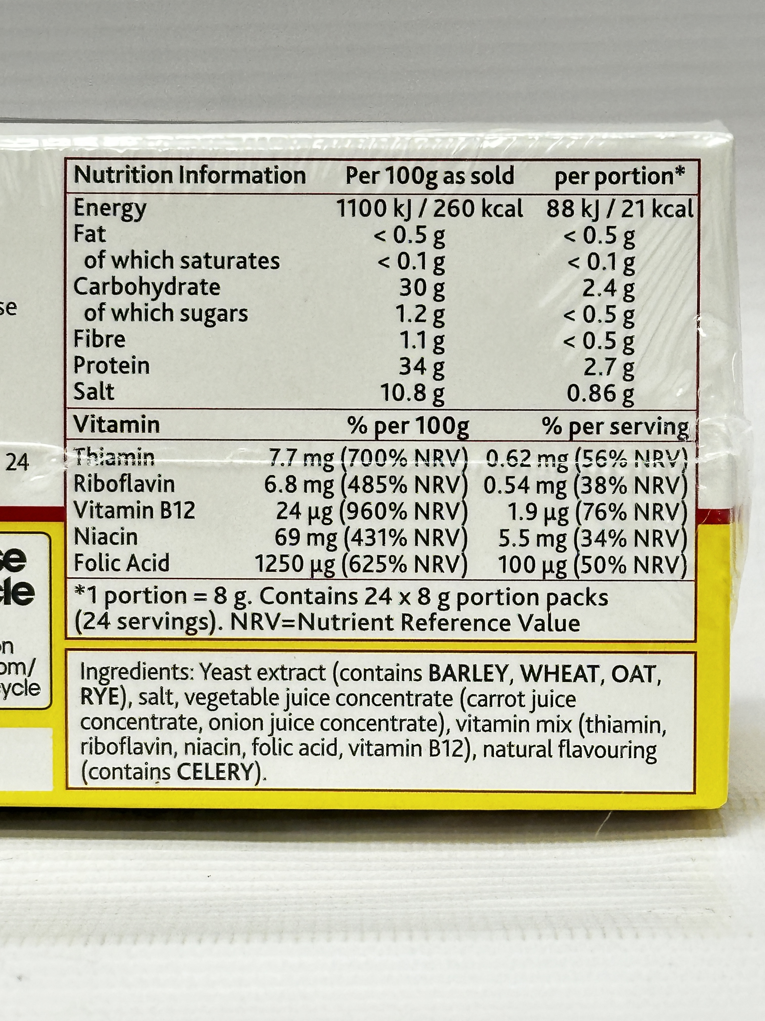 Yeast extract (contains BARLEY, WHEAT, OAT, RYE), salt, vegetable juice concentrate (carrot juice concentrate, onion juice concentrate), vitamin mix (thiamin, riboflavin, niacin, folic acid, vitamin B12), natural flavouring (contains CELERY)