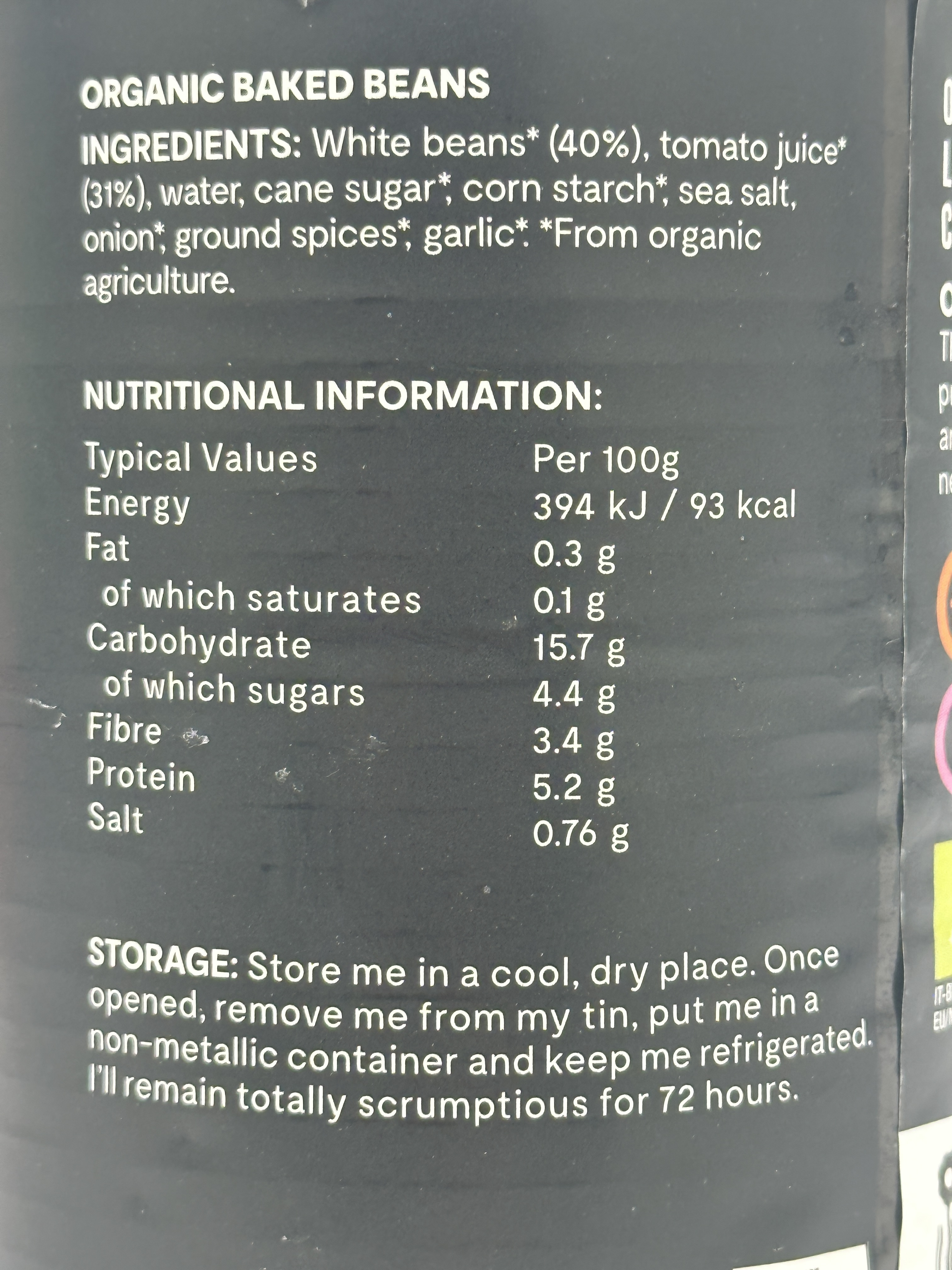Each tin contains white beans in a tomato-based sauce with organic spices, onion and garlic. The beans are ready to eat and can be heated for a quick meal or served as part of a variety of dishes. These baked beans are suitable for vegans and are packaged in BPA-free lined tins.