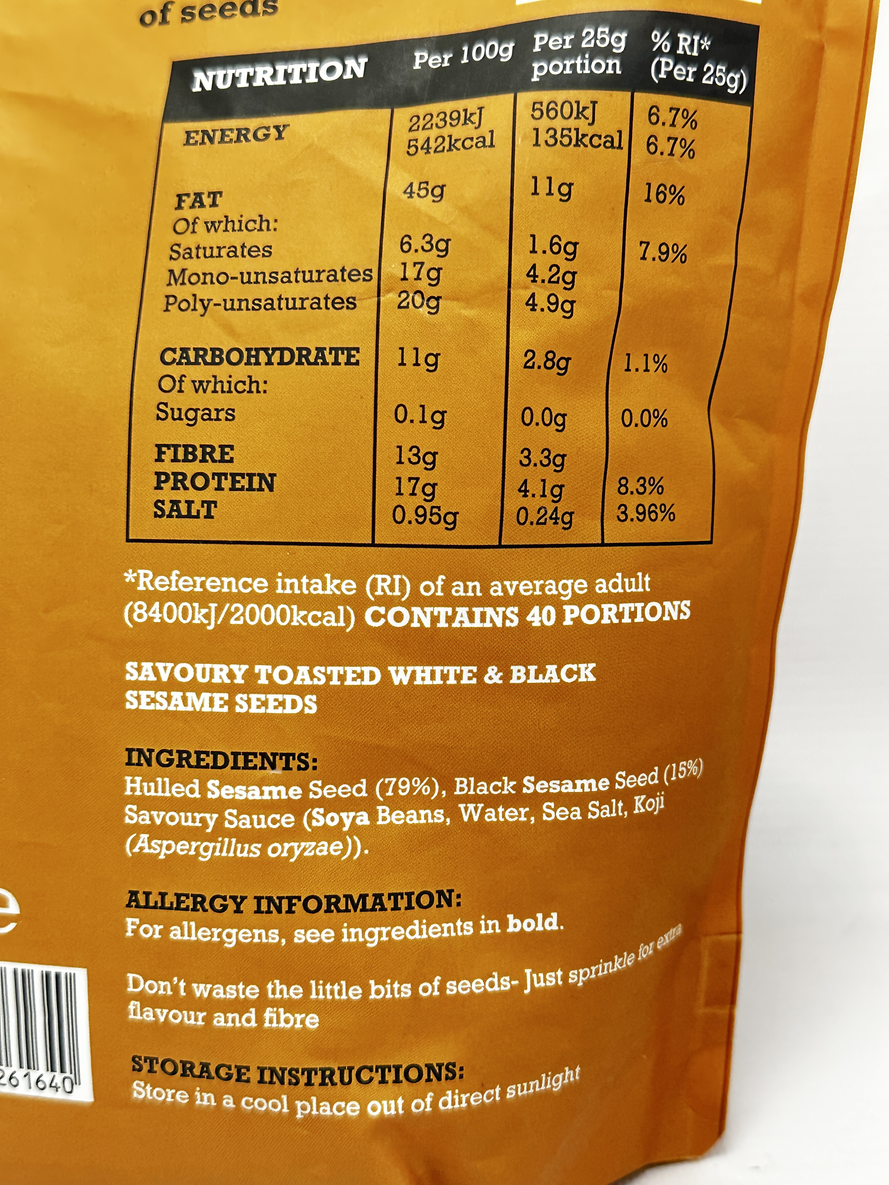 Hulled Sesame Seed (79%), Black Sesame Seed (15%), Savoury Sauce (Soya Beans, Water, Sea Salt, Koji (Aspergillus oryzae)).