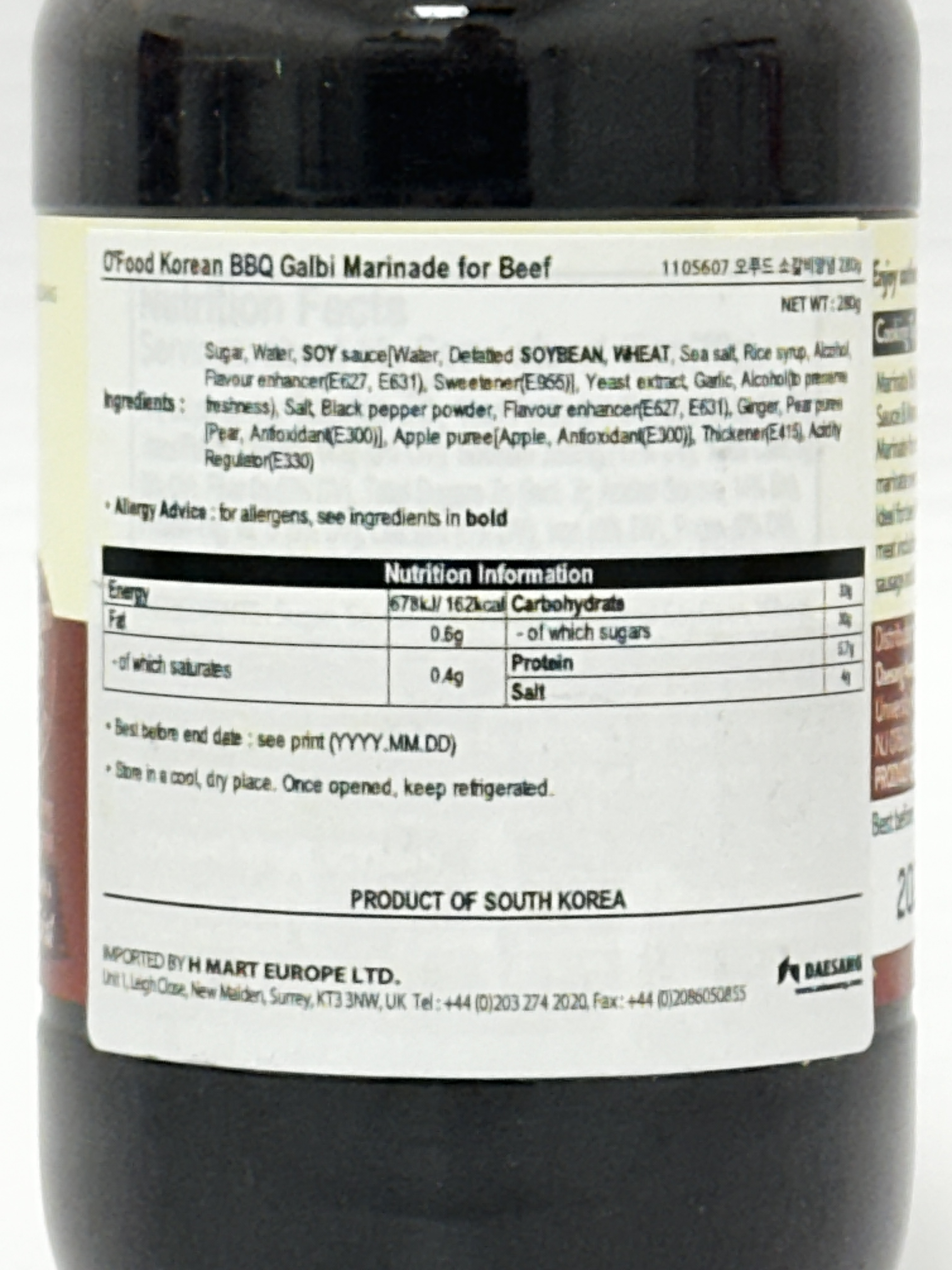 Sugar, Water, SOY sauce (Water, Defatted SOYBEAN, WHEAT, Sea salt, Rice syrup, Alcohol, Flavour enhancer (E627, E631), Sweetener (E955)), Yeast extract, Garlic, Alcohol to preserve freshness, Salt, Black pepper powder, Flavour enhancer (E627, E631), Ginger, Pear puree (Pear, Antioxidant (E300)), Apple puree (Apple, Antioxidant (E300)), Thickener (E415), Acidity Regulator (E330).