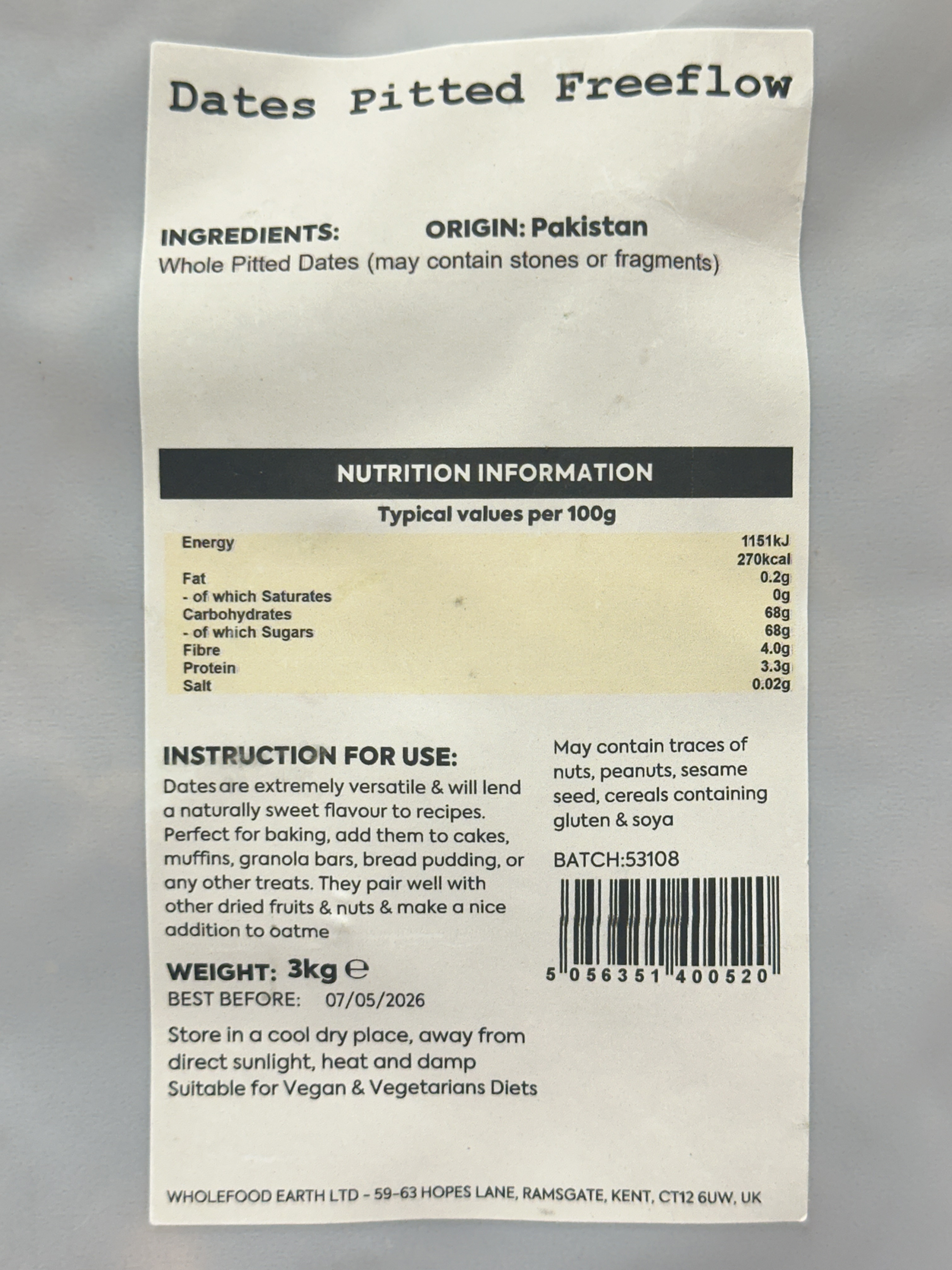 This batch of dates may appear slightly flaky and dry in texture. This is completely normal for dried fruit and the dates remain perfectly safe to consume. The drier texture makes them particularly suitable for baking, cooking, blending or chopping into recipes.