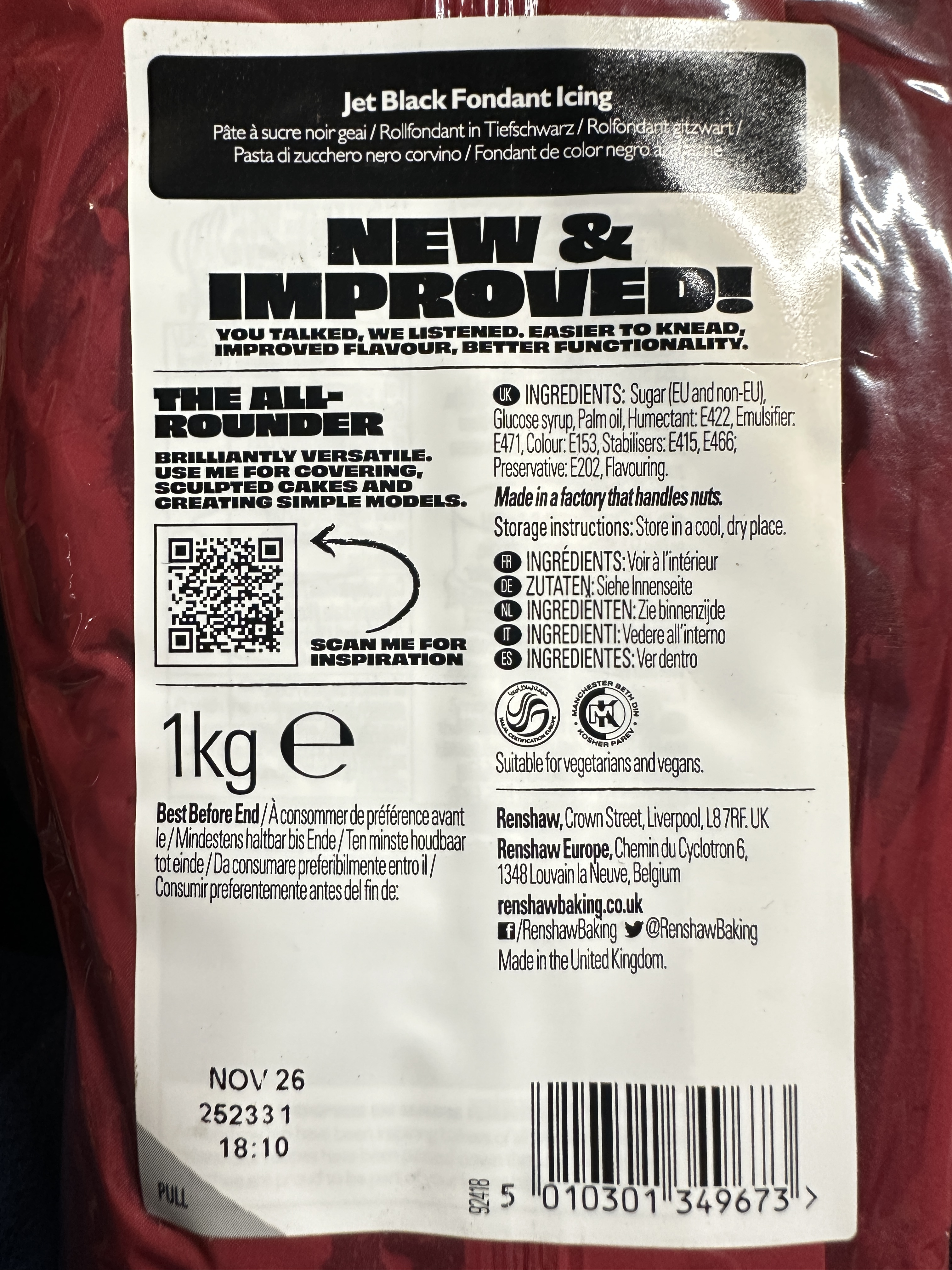 Renshaw Just Roll With It Jet Black Fondant Icing is a deep-colour, ready-to-roll sugar paste designed for bold cake designs, sharp detailing and professional finishes. This new and improved recipe is easier to knead and roll, with enhanced flavour and flexibility, making it ideal for cake covering, sculpted cakes and simple modelling. Perfect for celebration cakes, novelty bakes and dramatic decorative work.