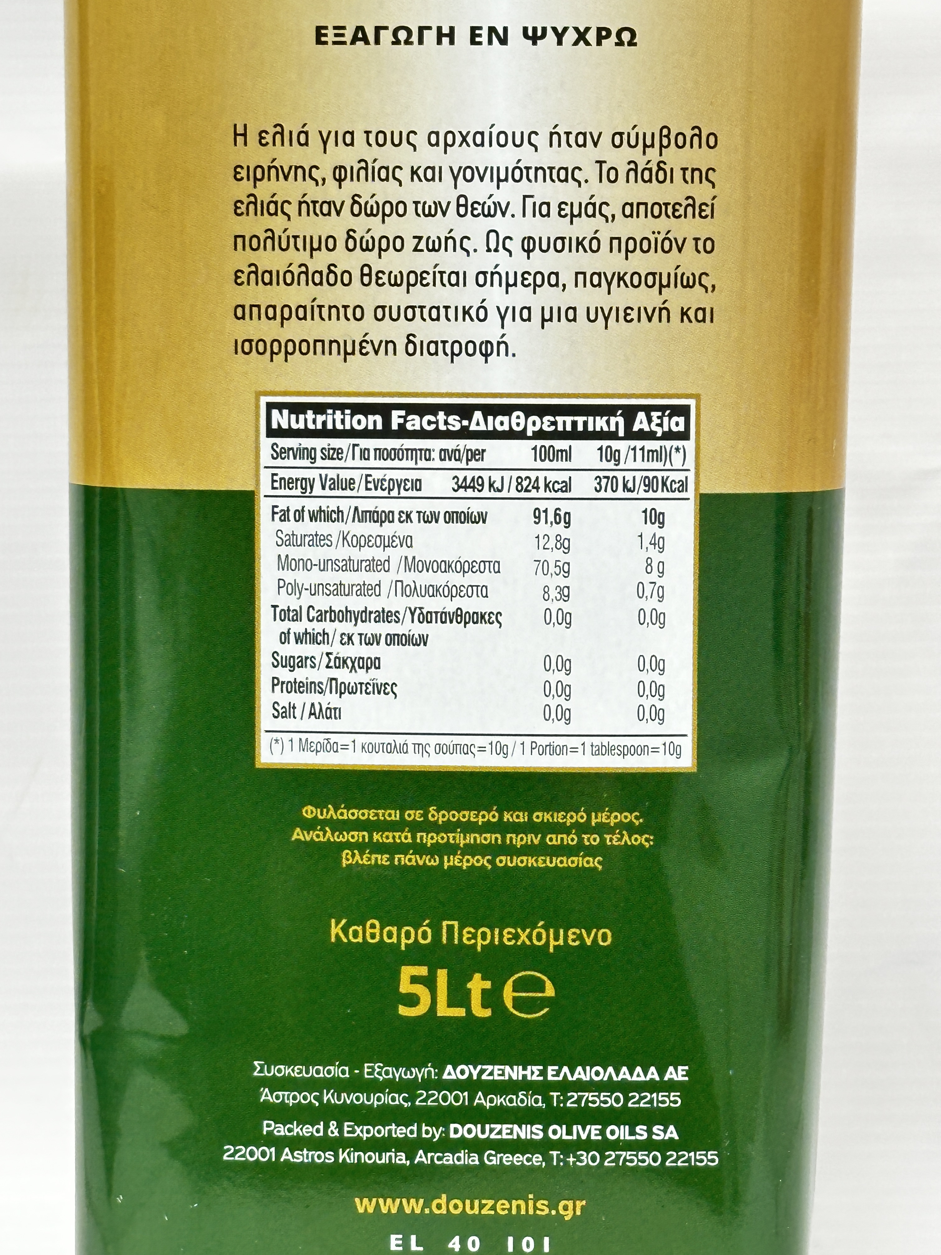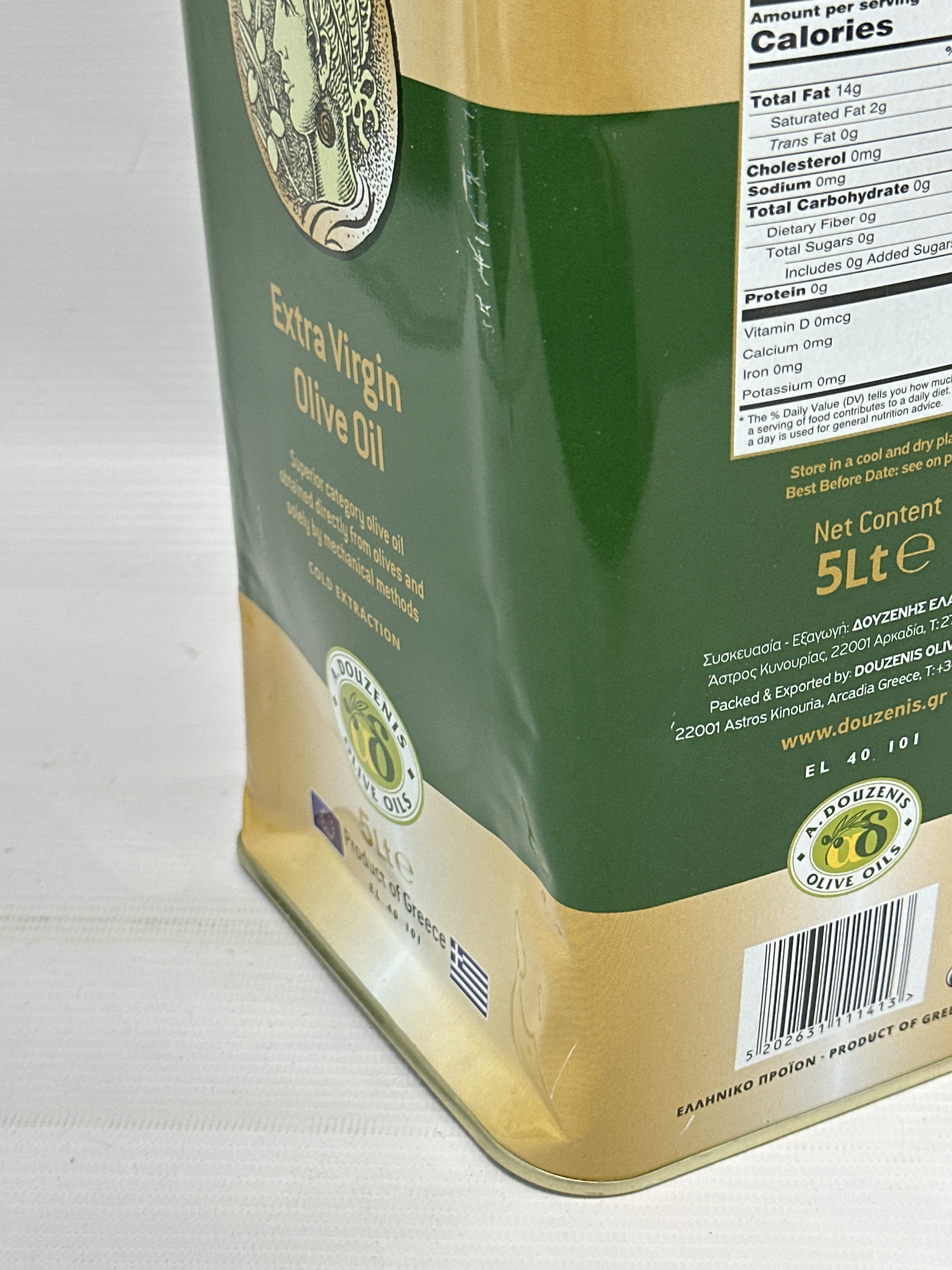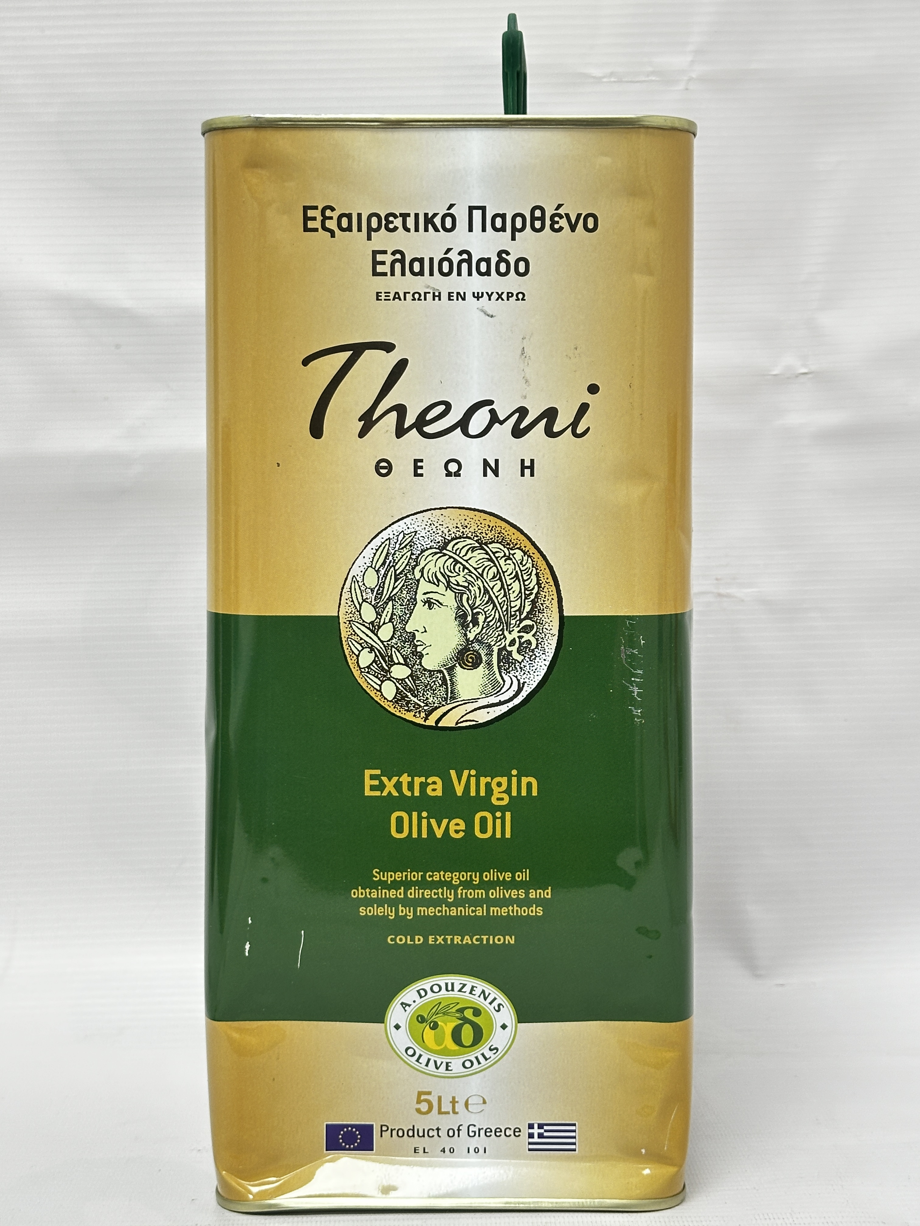 Theoni Extra Virgin Olive Oil is a 5 litre Greek olive oil in a practical tin, suitable for everyday cooking and kitchen use. This extra virgin olive oil is described on pack as a superior category olive oil obtained directly from olives and solely by mechanical methods.