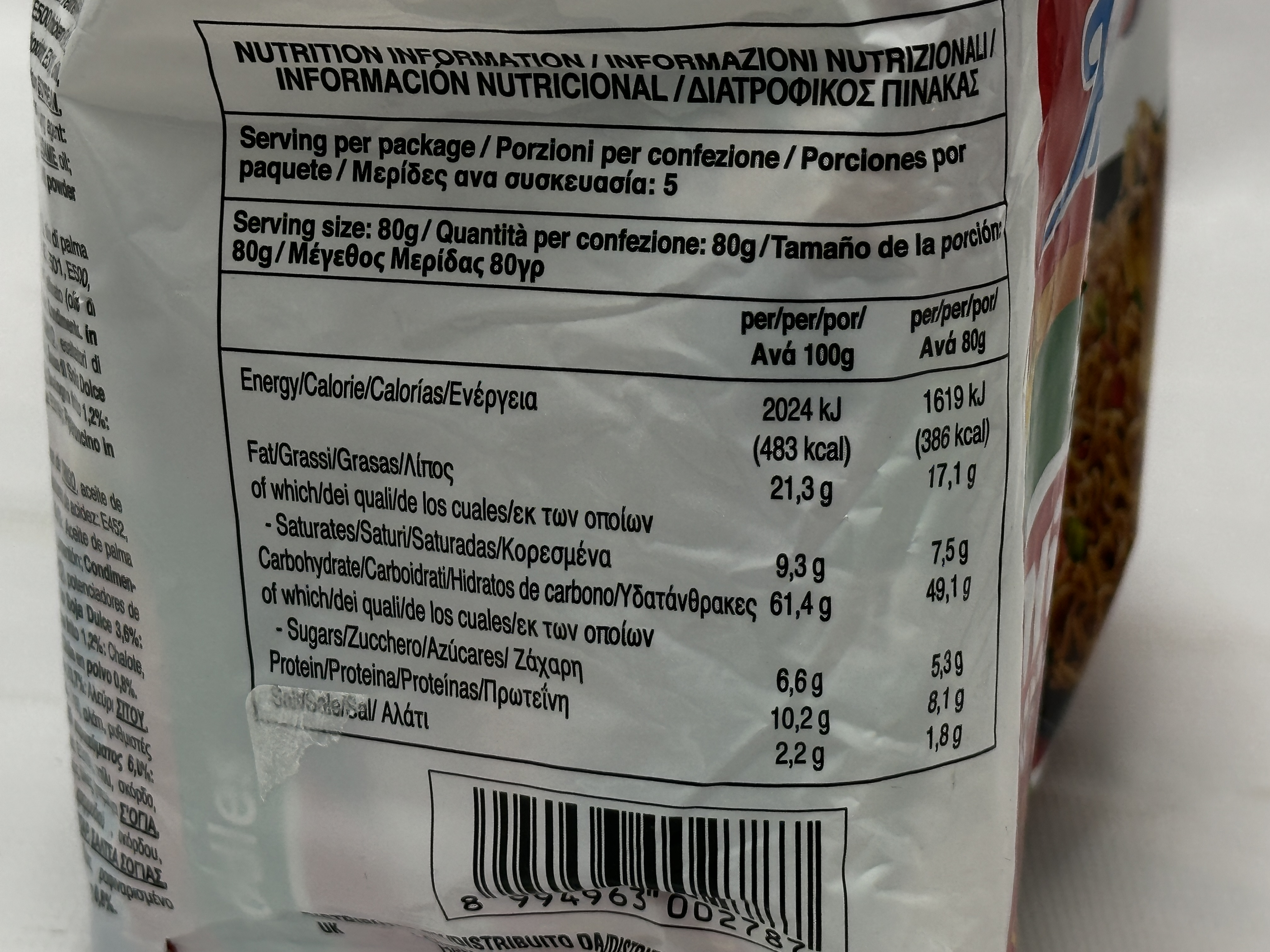 Noodles 83.7%: WHEAT flour, refined palm oil (refined palm oil, antioxidant E319), salt, acidity regulators: E452, E501, E500, thickener: E412, colour: E101.