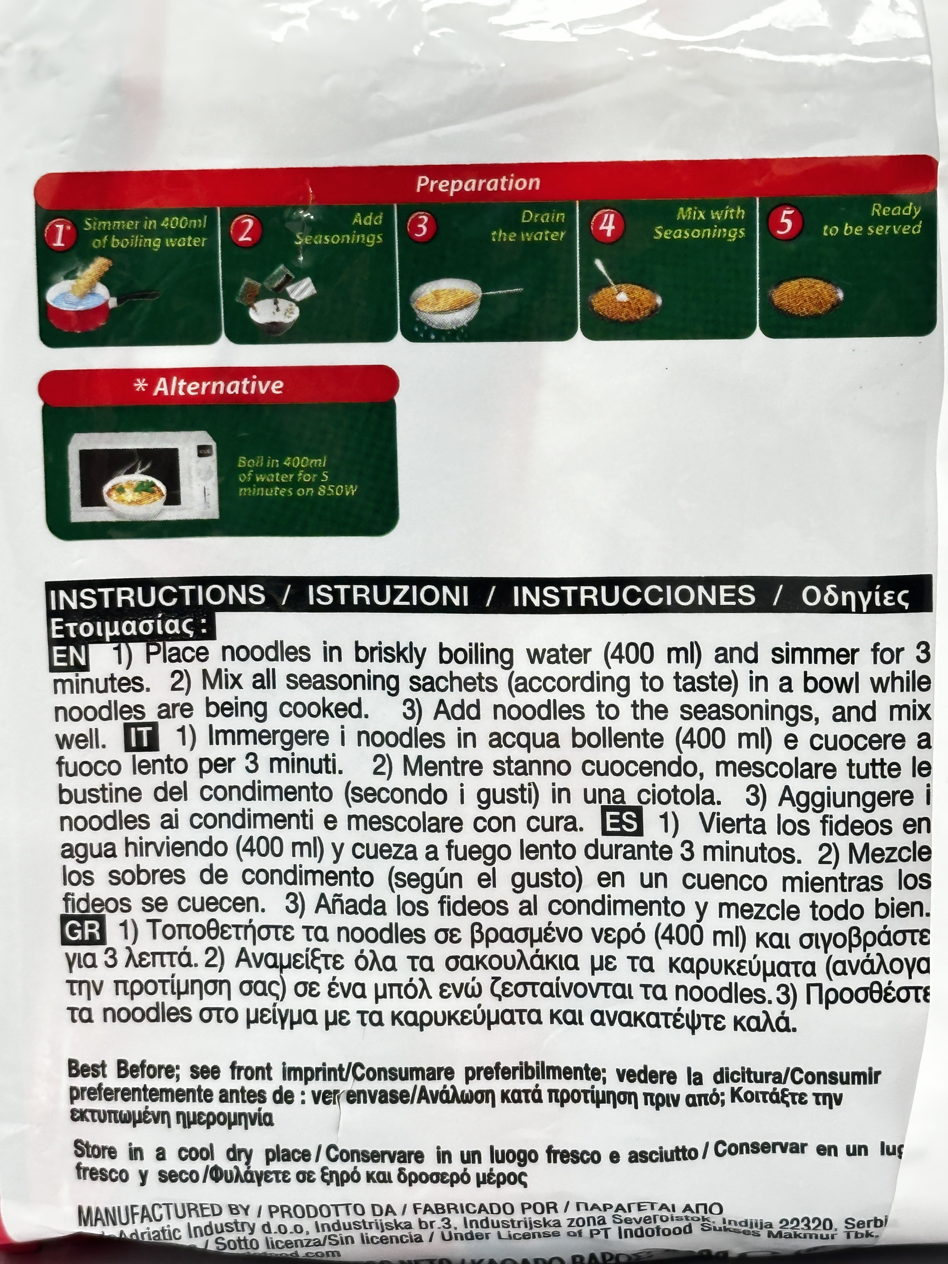 Indomie Mi Goreng Hot & Spicy is a quick stir fry noodle favourite in a handy value pack of 5. Each pack contains 80g, giving a total of 400g, and includes seasoning sachets to create the classic hot and spicy Indonesian-style noodle flavour at home.