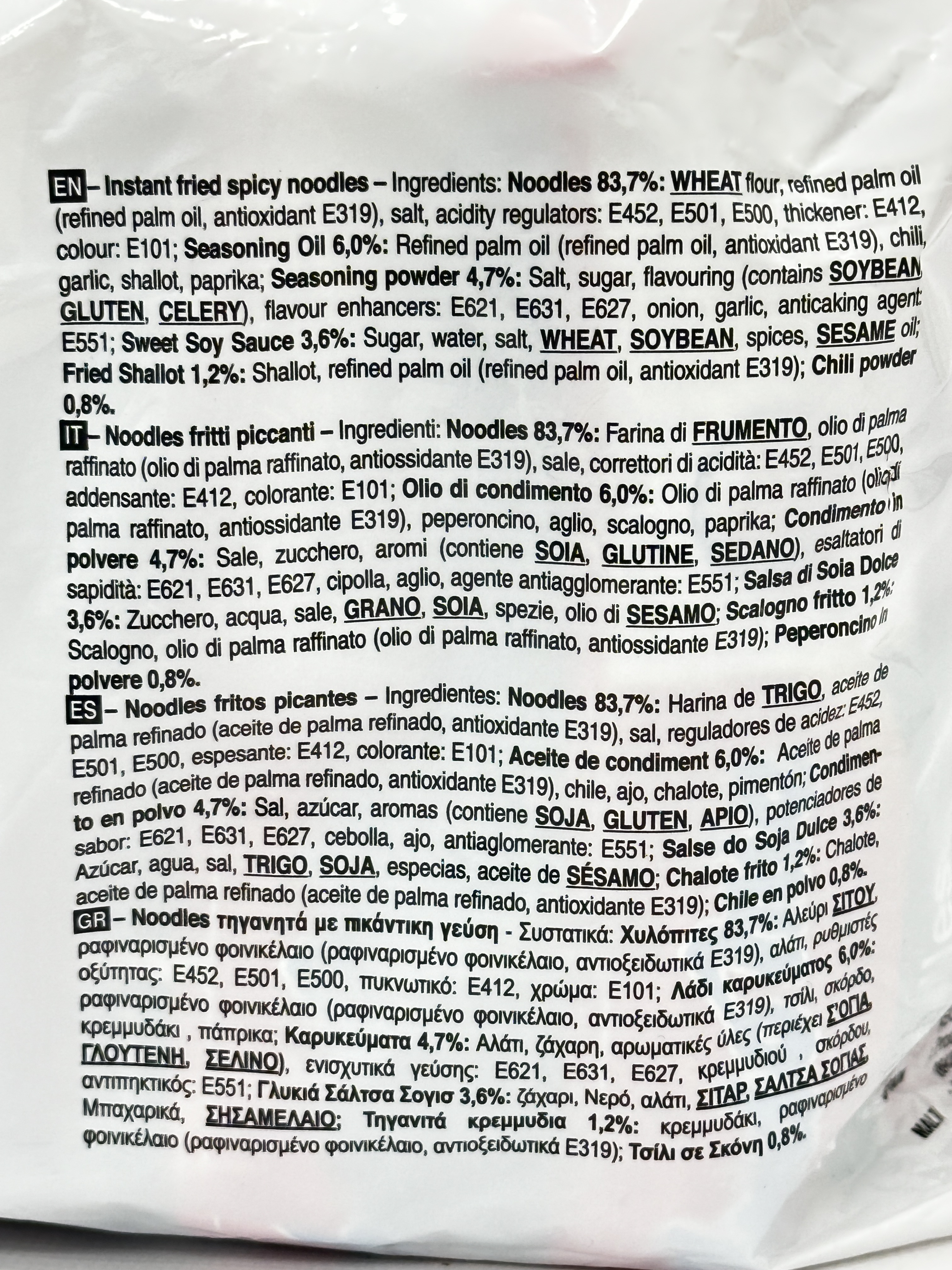Seasoning Oil 6.0%: Refined palm oil (refined palm oil, antioxidant E319), chili, garlic, shallot, paprika.