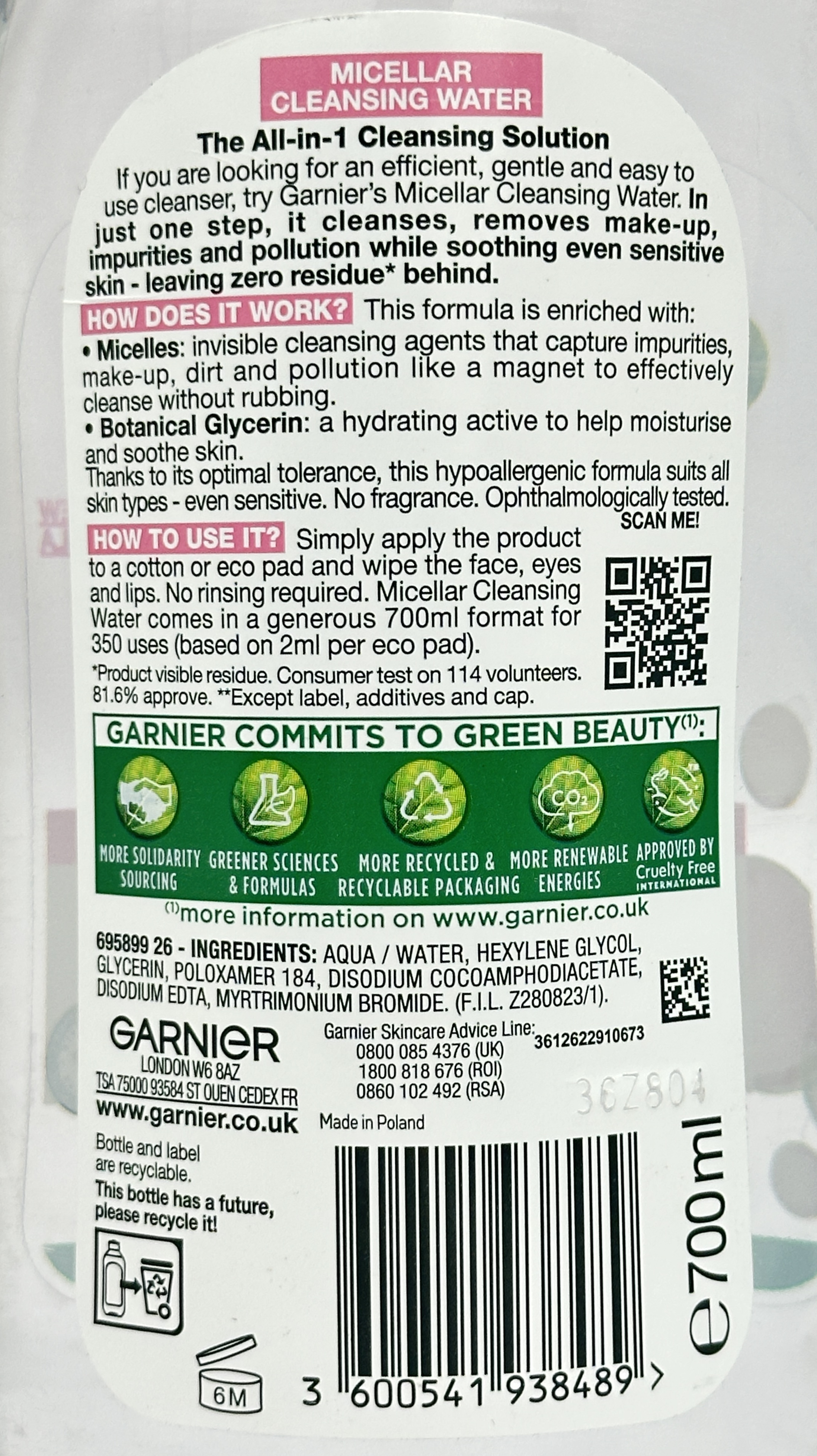 Garnier SkinActive Micellar Cleansing Water All-in-1 is a gentle cleansing solution designed to remove make-up, cleanse the skin and leave it feeling refreshed in one simple step. Suitable for sensitive skin, the lightweight formula helps lift away impurities, make-up and daily build-up from the face, eyes and lips without the need for rinsing.