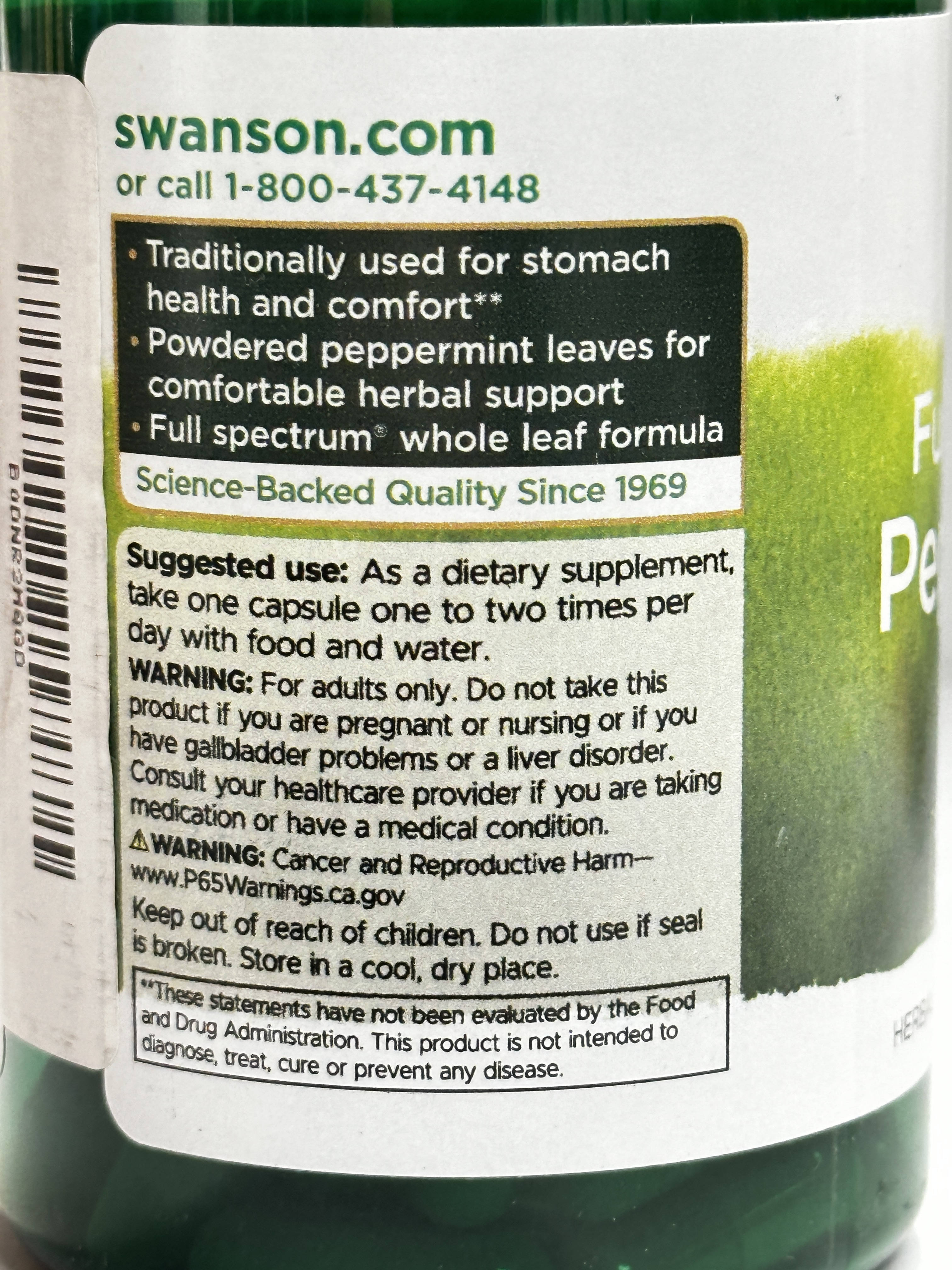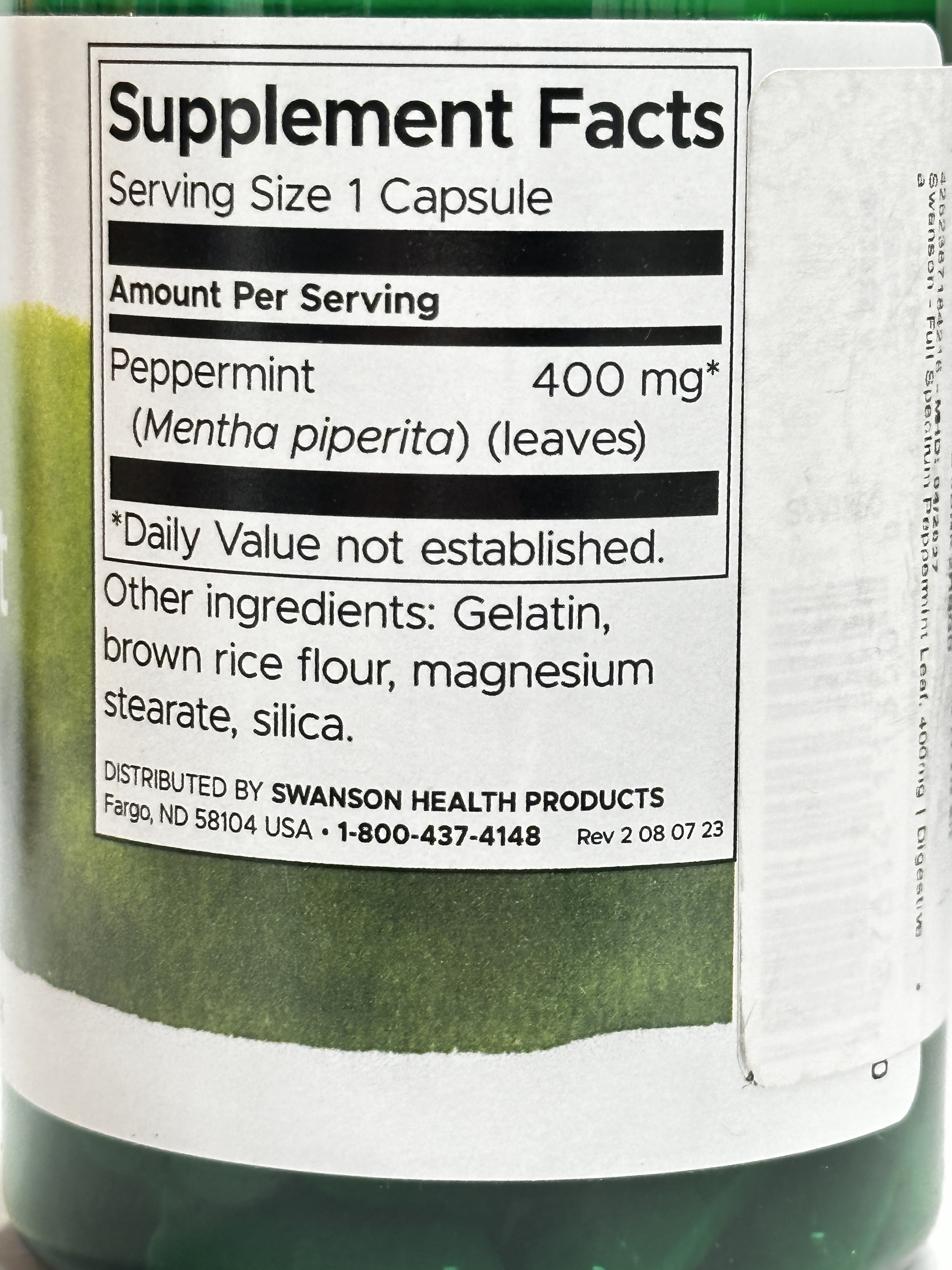 Nutritional information: Serving size 1 capsule. Peppermint (Mentha piperita) leaf 400mg. Daily value not established.