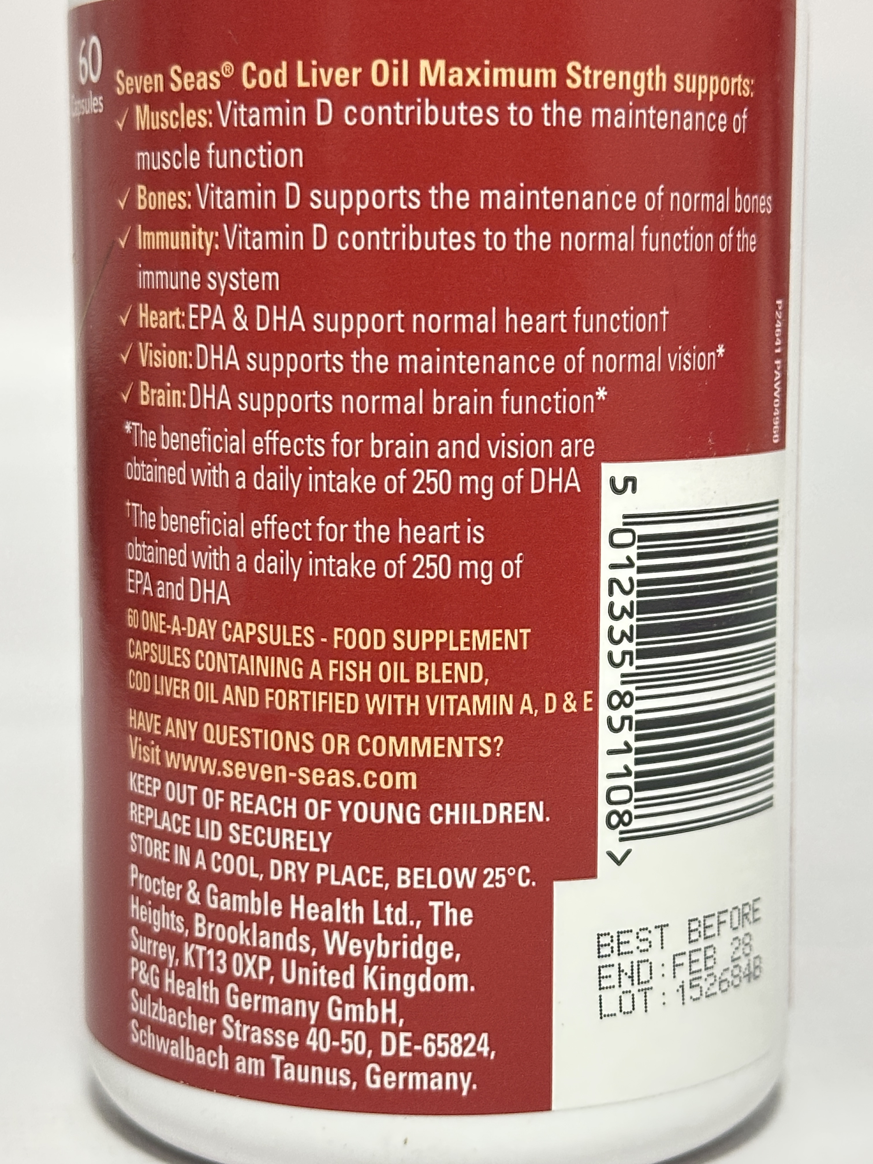 Seven Seas Cod Liver Oil Maximum Strength capsules provide a concentrated blend of cod liver oil and fish oil, fortified with vitamins A, D and E. This pack includes 3 bottles of 60 capsules, offering a total of 180 capsules for long-term daily use. Designed for adults and children over 12 years, these one-a-day capsules are easy to take and clearly labelled with nutritional values and dosage guidance.