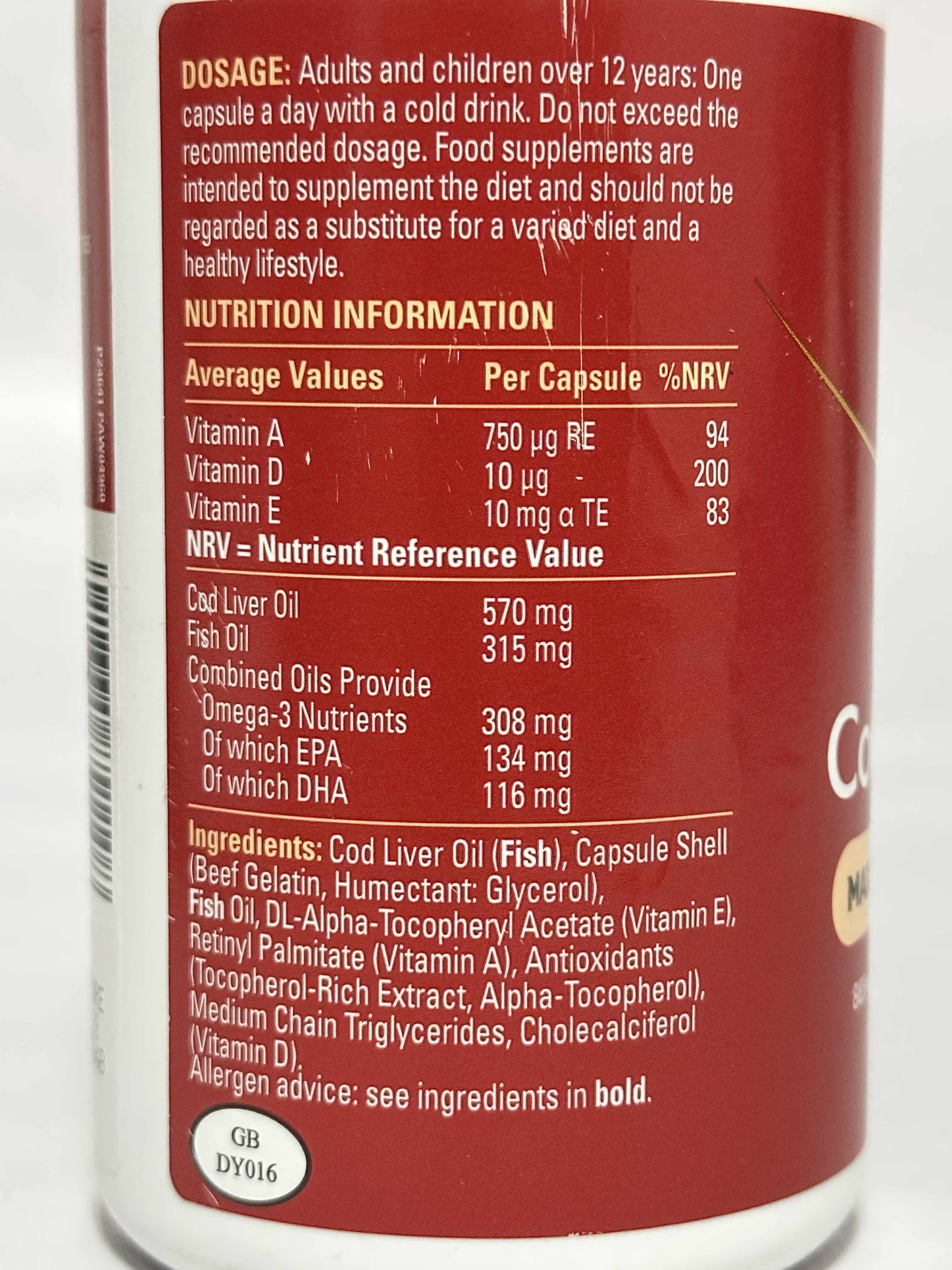 Cod Liver Oil (Fish), Fish Oil, Capsule Shell (Beef Gelatin, Humectant: Glycerol), DL-Alpha-Tocopheryl Acetate (Vitamin E), Retinyl Palmitate (Vitamin A), Antioxidants (Tocopherol-Rich Extract, Alpha-Tocopherol), Medium Chain Triglycerides, Cholecalciferol (Vitamin D).