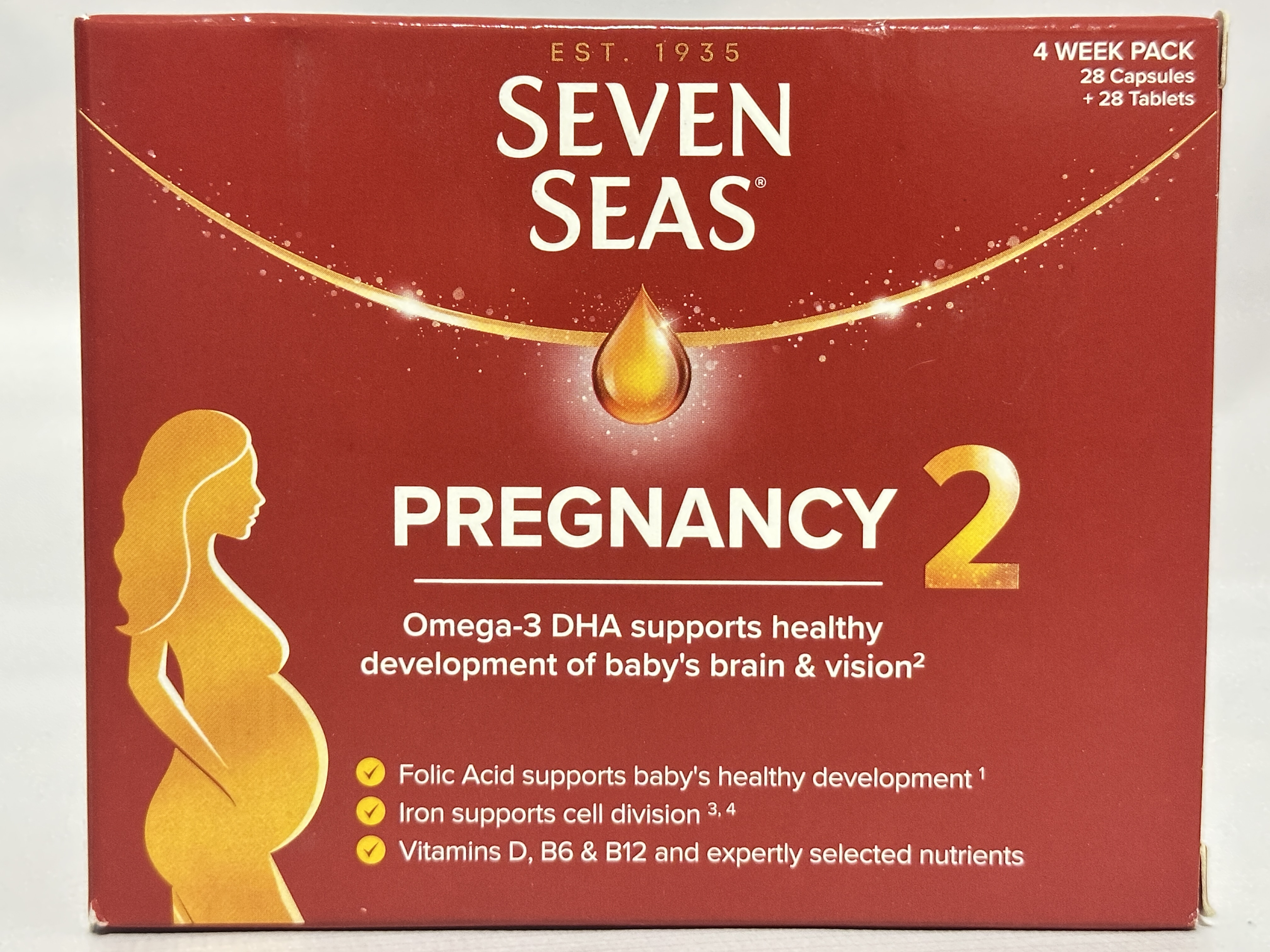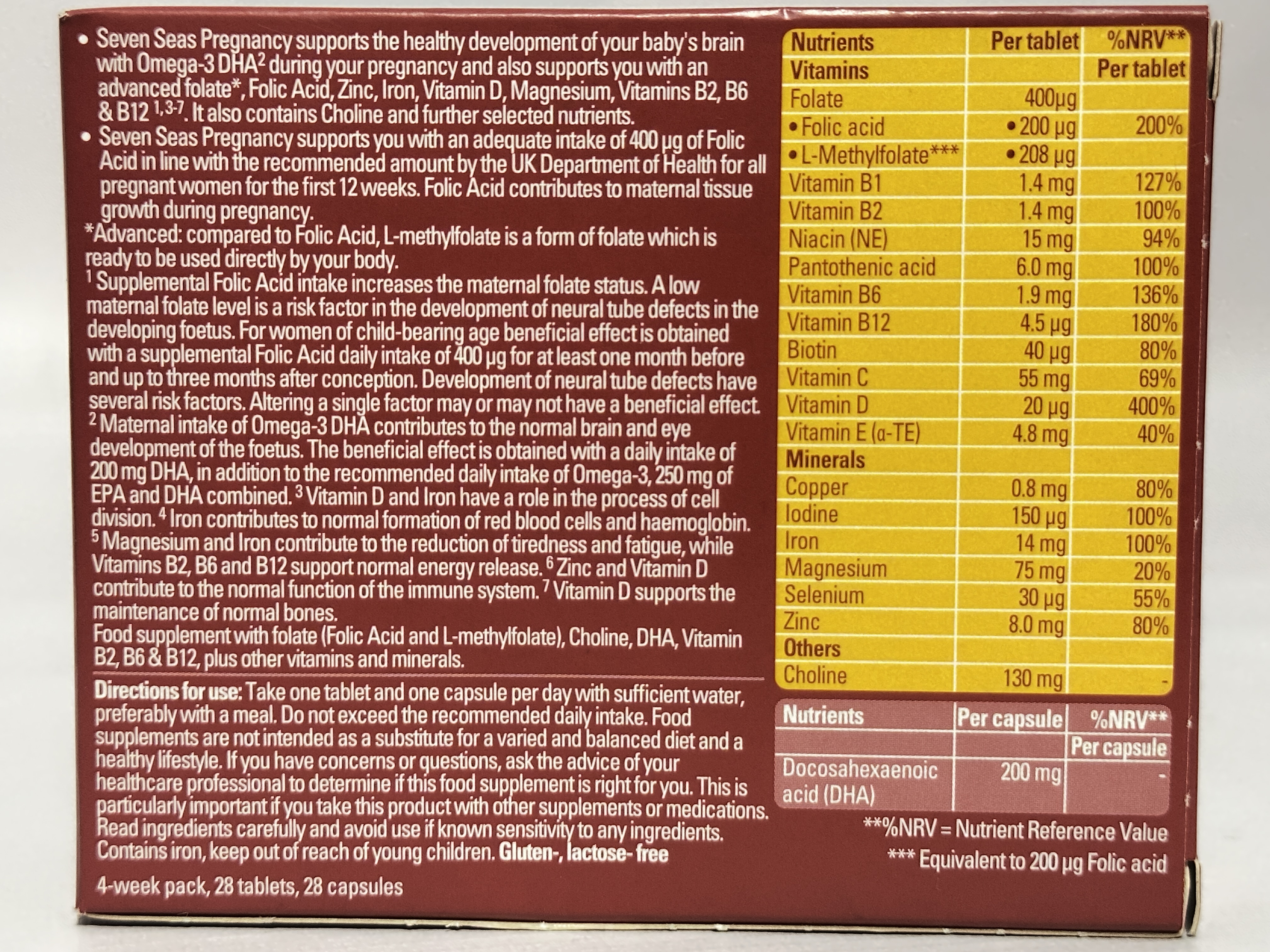 Seven Seas Pregnancy is a combined daily supplement designed for use during pregnancy. Each 4-week pack contains 28 tablets and 28 capsules, taken together once per day with water, preferably with a meal.