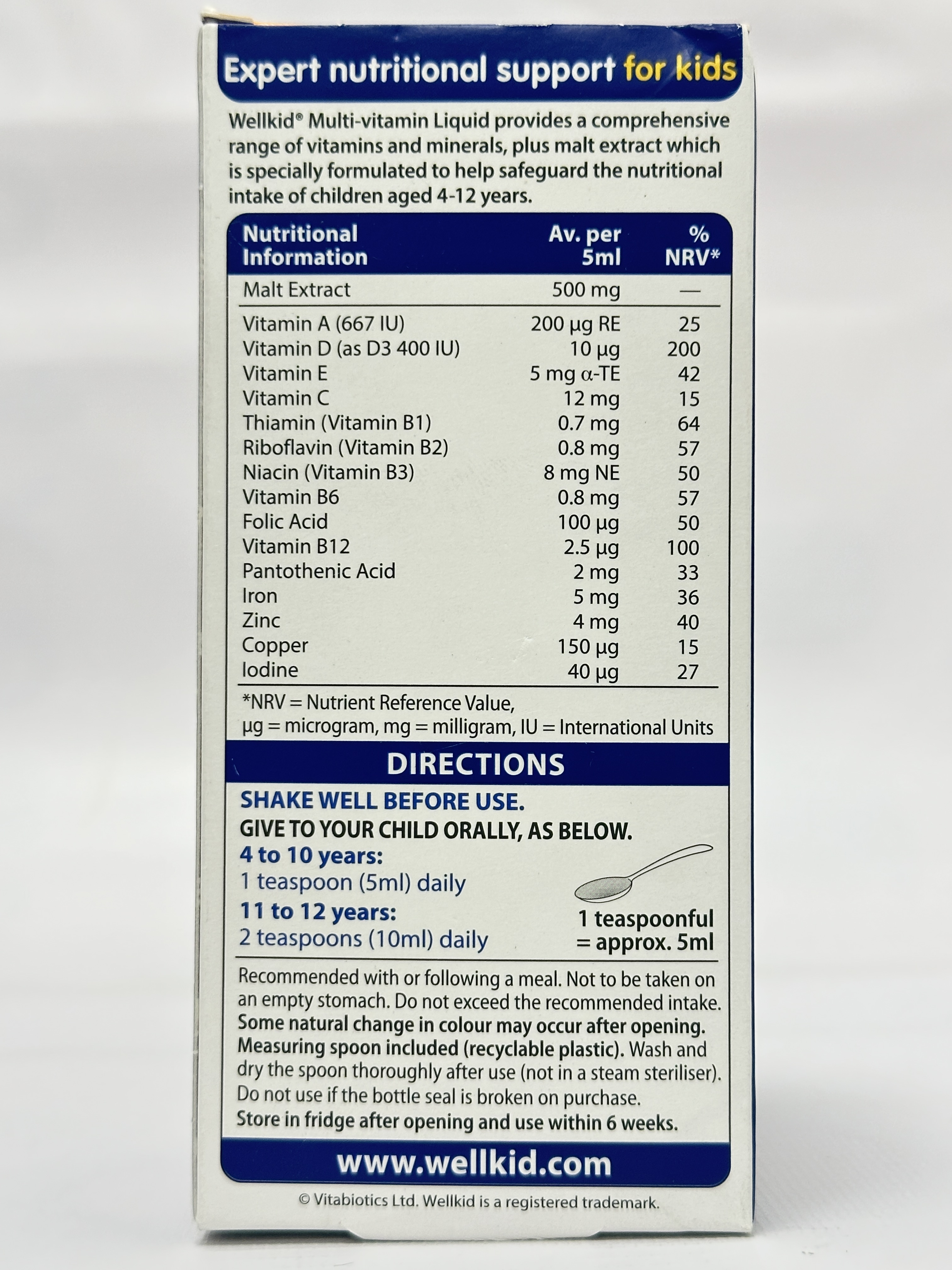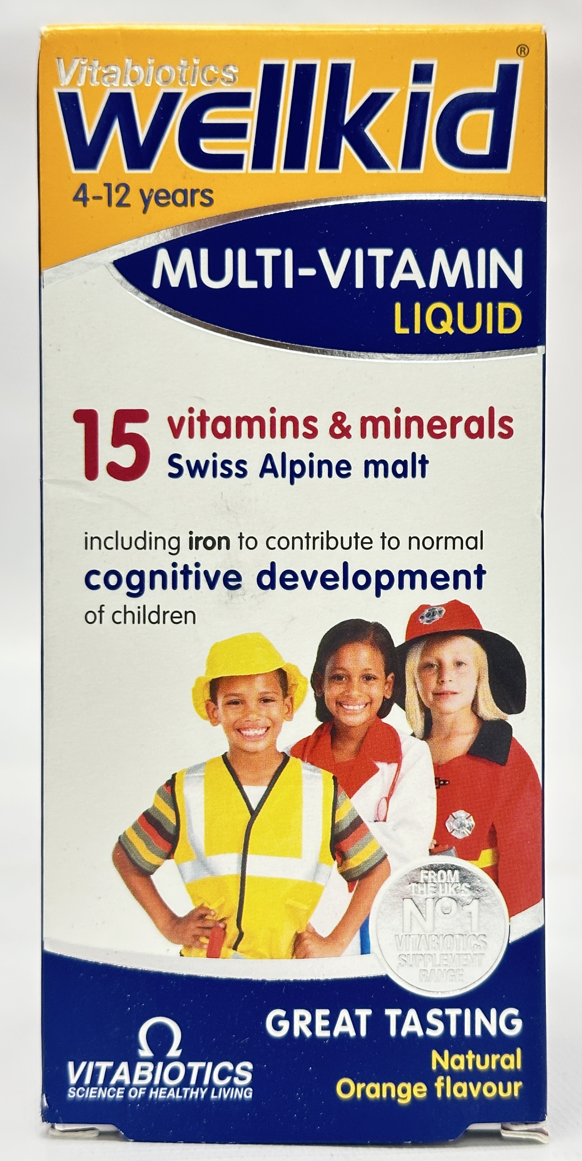 Vitabiotics Wellkid Multivitamin Liquid is a liquid food supplement designed for children aged 4–12 years, providing a carefully balanced combination of 15 vitamins and minerals together with Swiss Alpine malt extract.