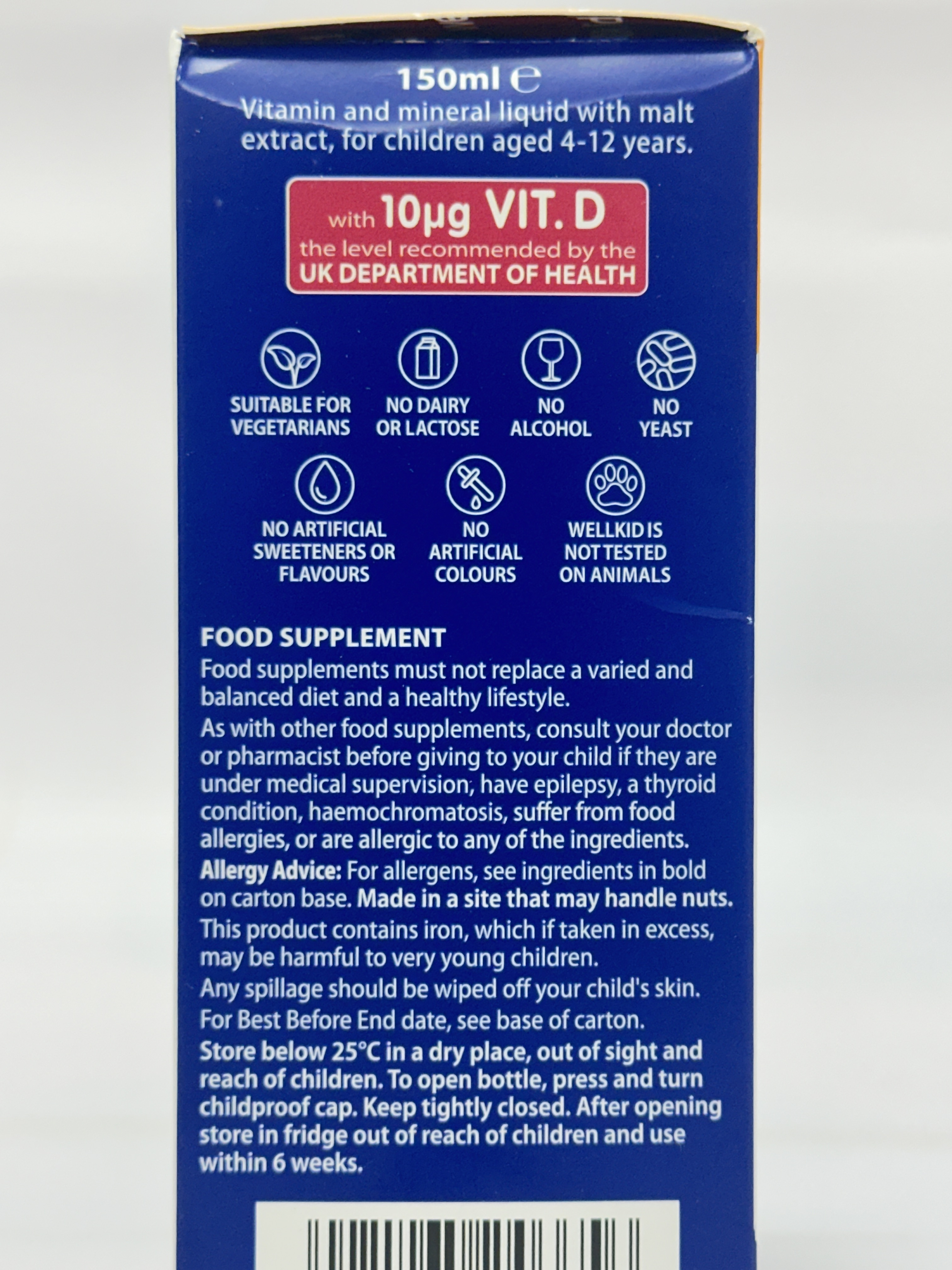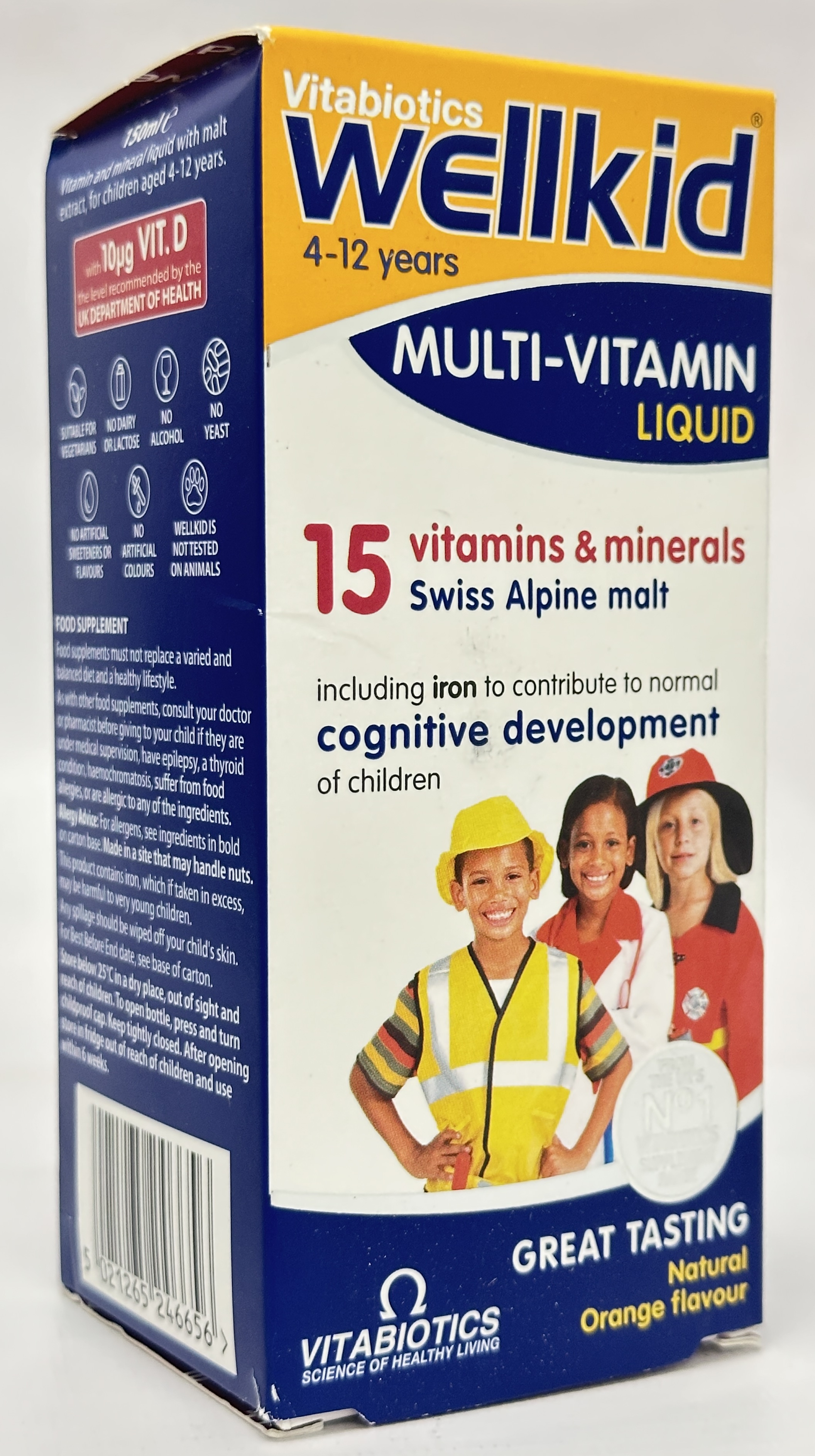 Vitabiotics Wellkid Multivitamin Liquid is a liquid food supplement designed for children aged 4 to 12 years, providing a balanced combination of 15 vitamins and minerals together with Swiss Alpine malt extract.