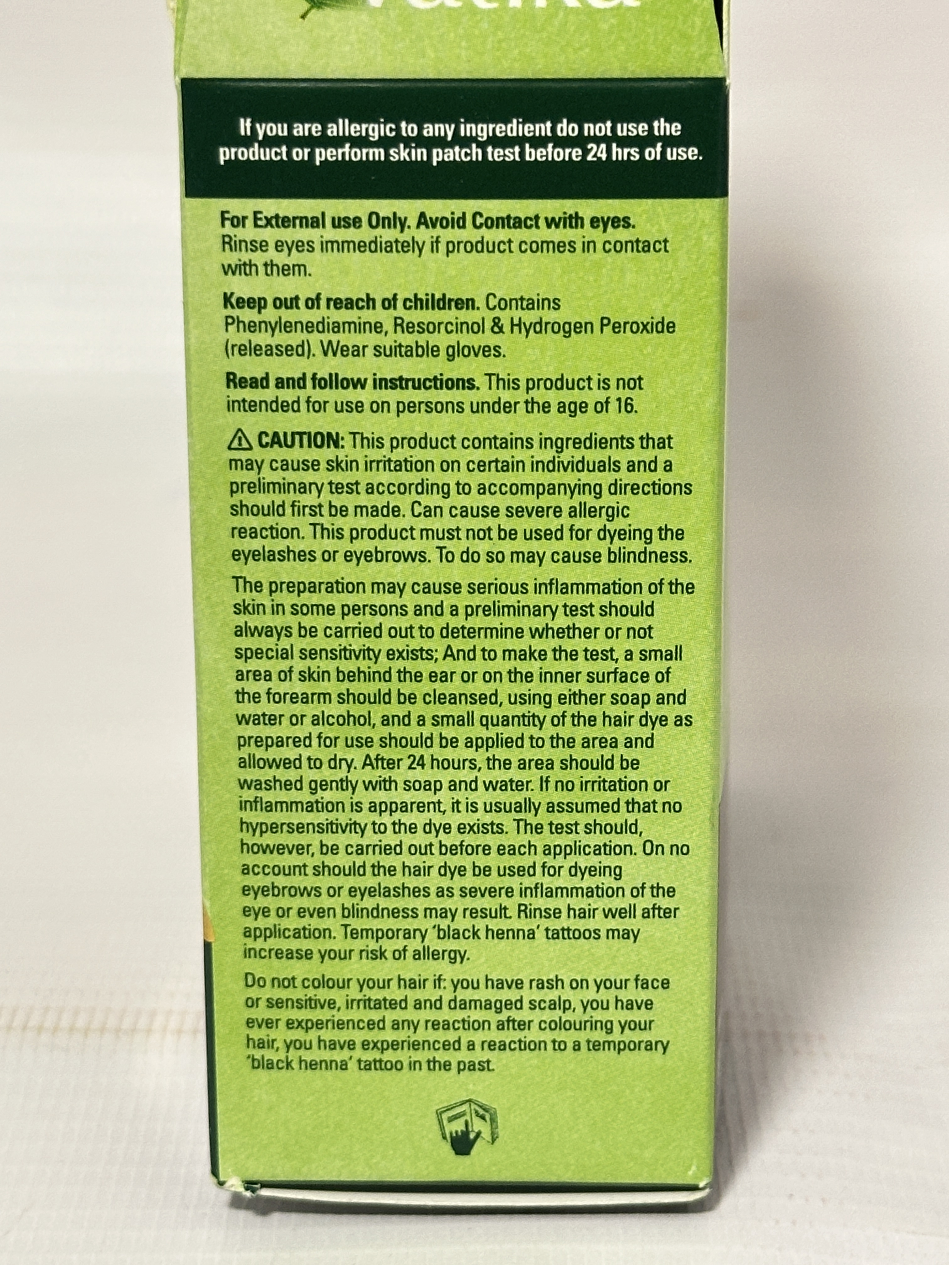 Contains Phenylene-diamine, Resorcinol, and Hydrogen Peroxide (released). Not suitable for use under 16 years. Wear gloves during application.