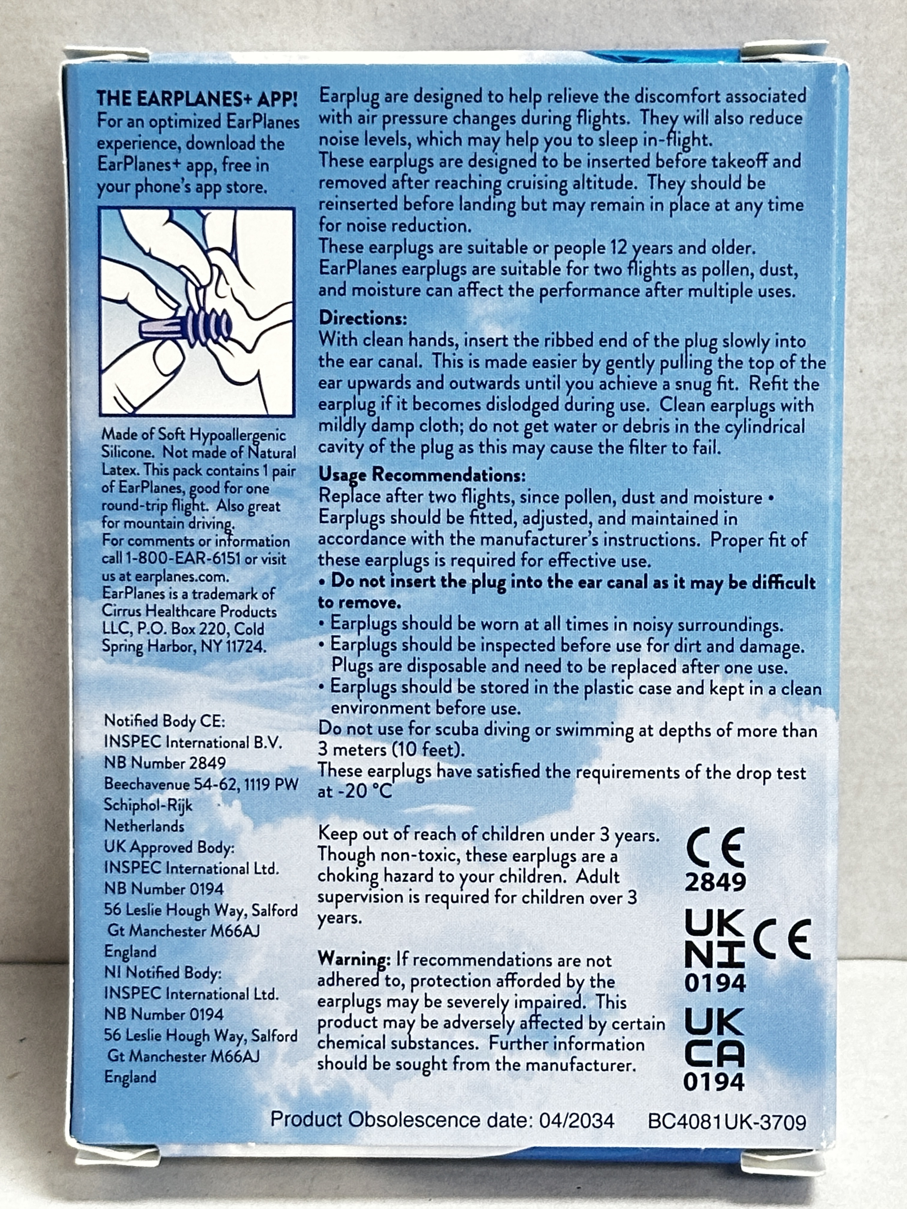 Travel more comfortably with EarPlanes Plus Adult Earplugs, designed for use during flights and changes in air pressure. This pack contains 3 pairs of adult-size earplugs made from soft hypoallergenic silicone, with a design intended to help relieve the discomfort associated with air pressure changes during air travel.
