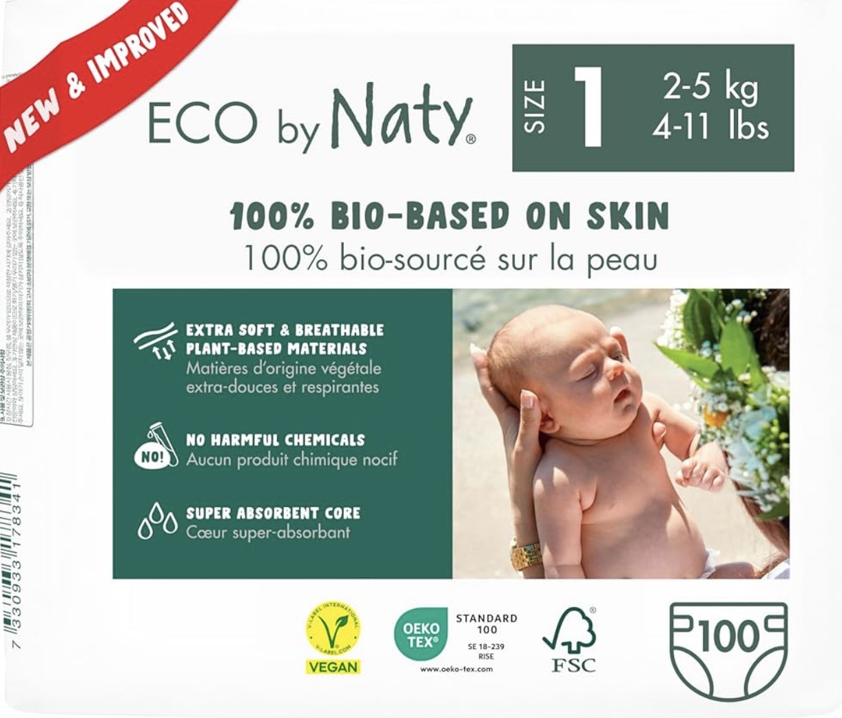 Eco by Naty Baby Nappies Size 1 (2–5 kg / 4–11 lbs) – 100 Count | 100% Bio-Based, Plant-Based, Vegan, Chemical-Free