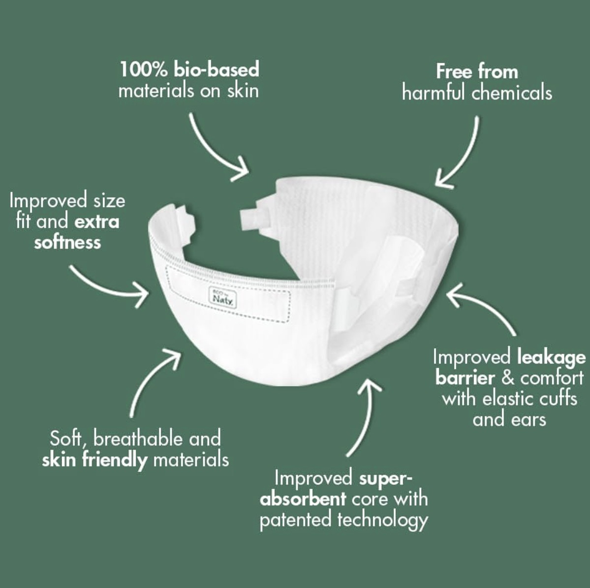 The plant-based outer and inner layers allow airflow to keep your baby’s skin dry and comfortable, while the patented super-absorbent core offers reliable protection against leaks. Certified vegan, free from harmful chemicals, and made with responsibly sourced materials, Eco by Naty nappies are a trusted, eco-friendly choice for your baby and the planet.