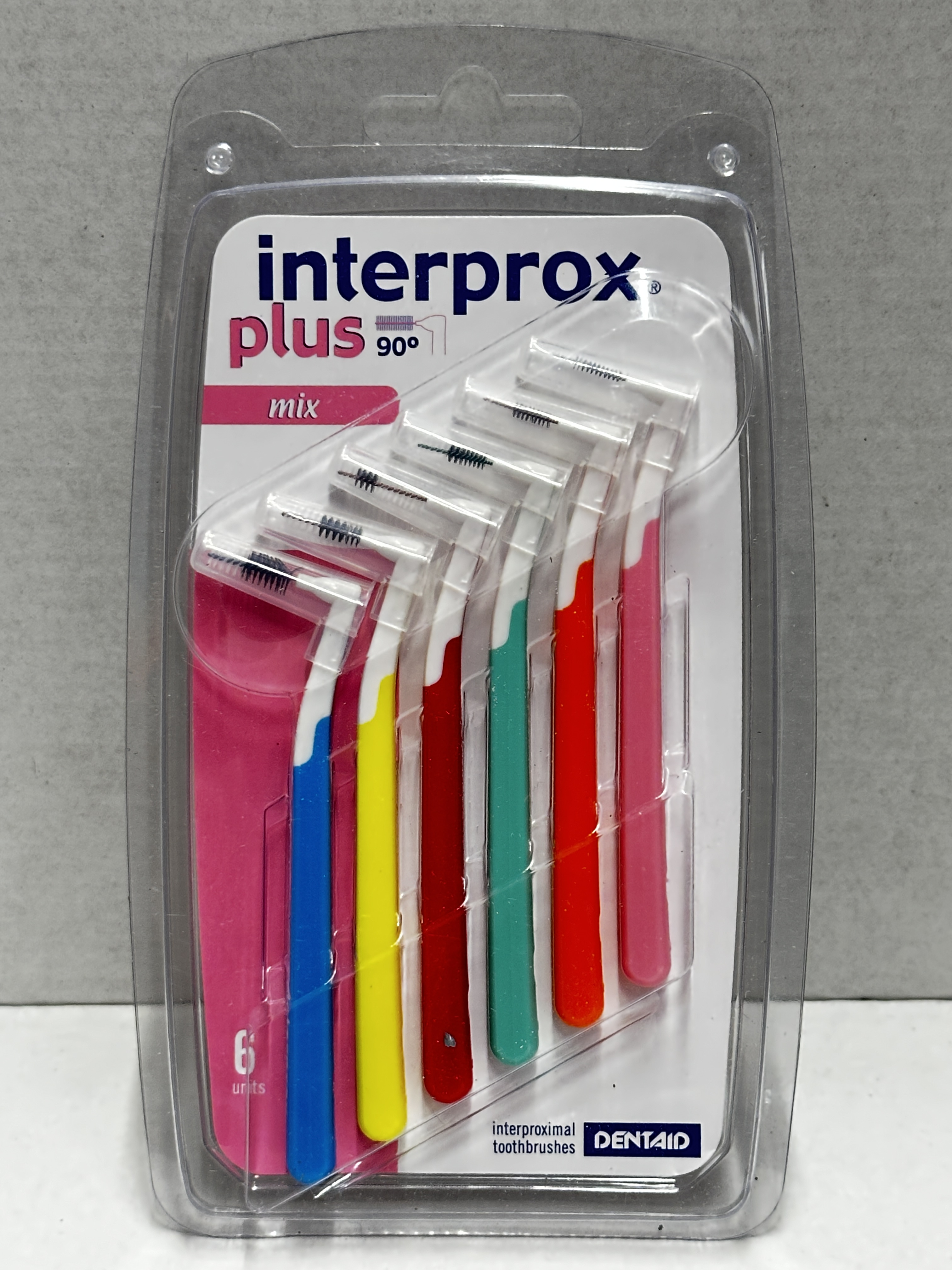 Keep daily oral care simple with Interprox Plus 90° Mix interdental toothbrushes. This handy pack contains 6 assorted interdental brushes with angled handles designed to help clean between teeth and around harder-to-reach areas.