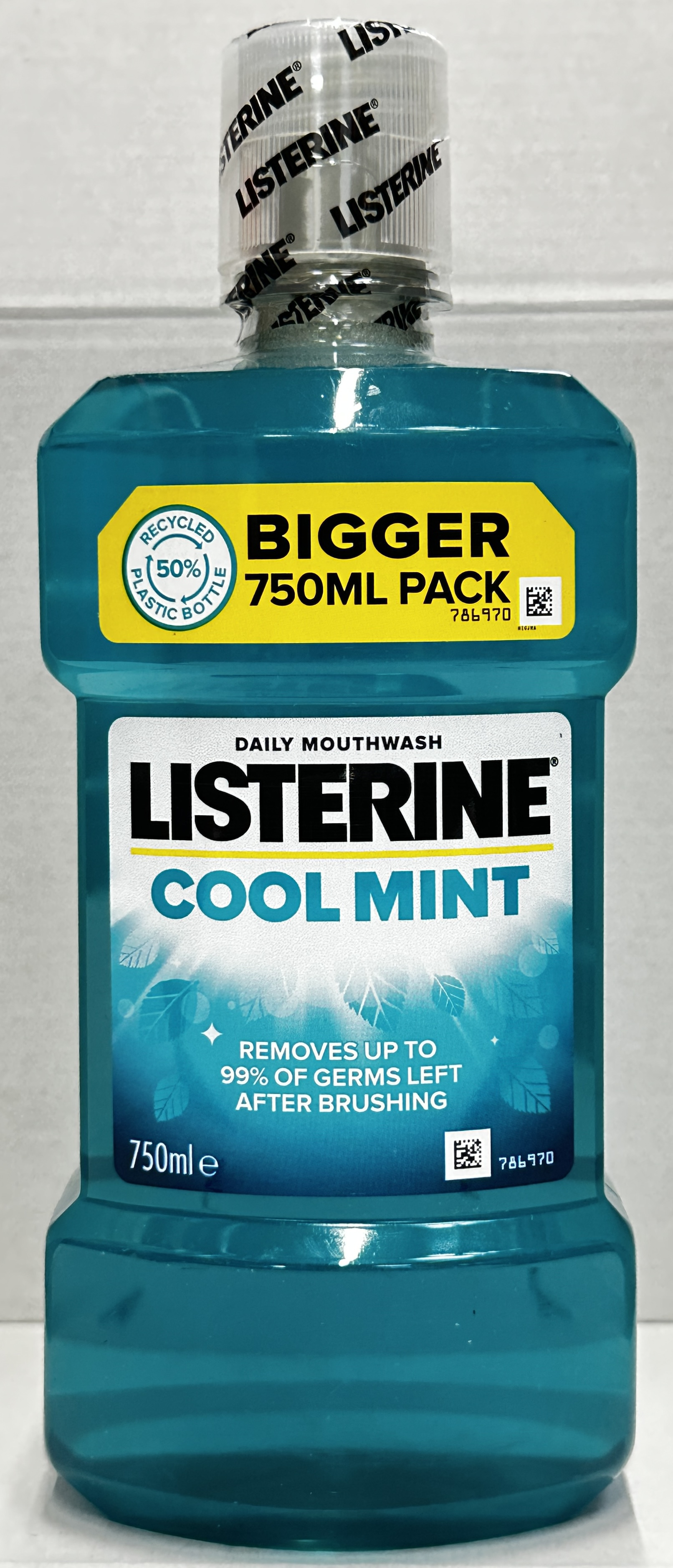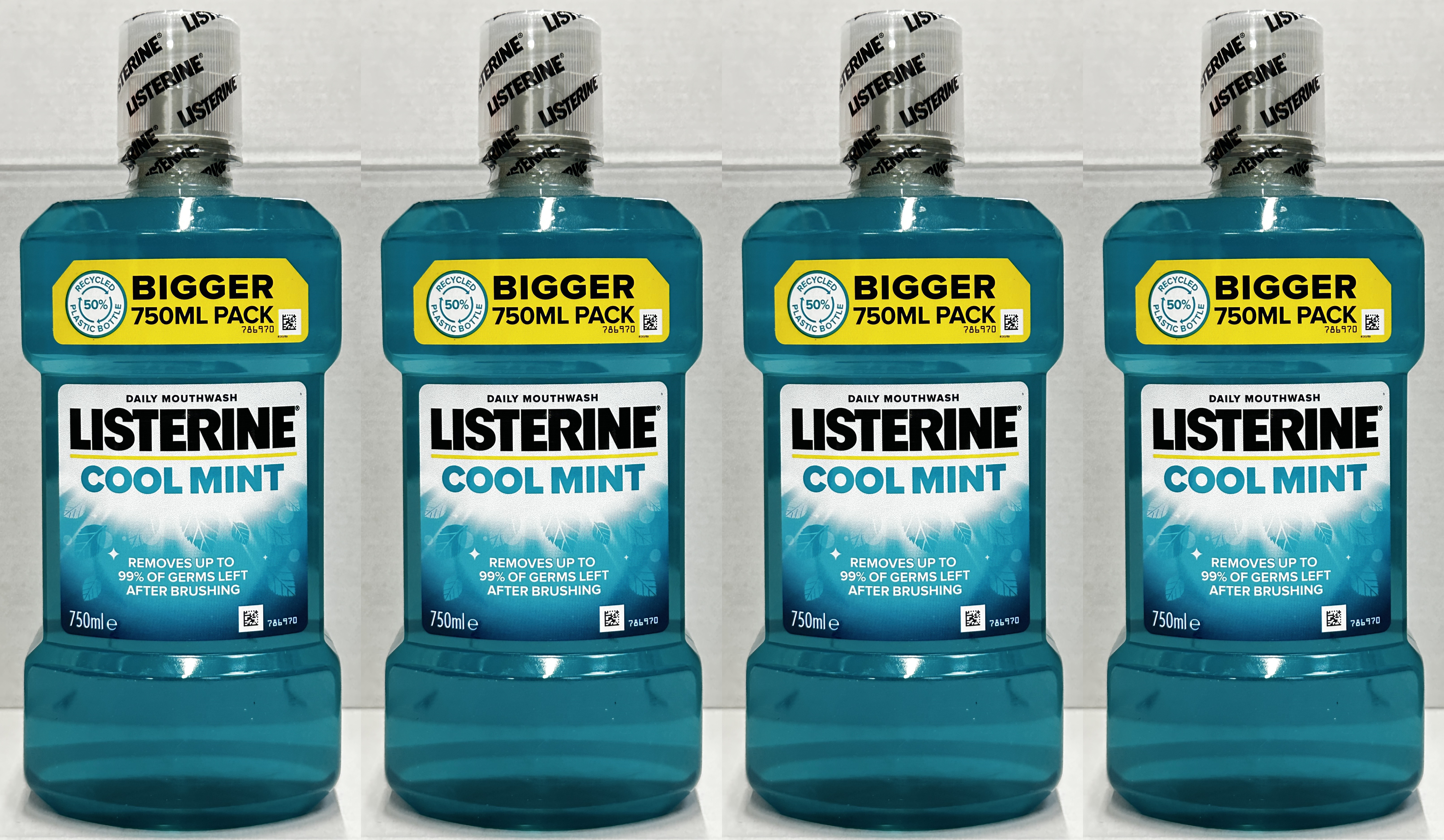 The front label highlights Cool Mint daily mouthwash and states it removes up to 99% of germs left after brushing. The larger 750ml bottle size and 4 pack format make this a convenient choice for shoppers who want to buy a household staple in a better value multipack.