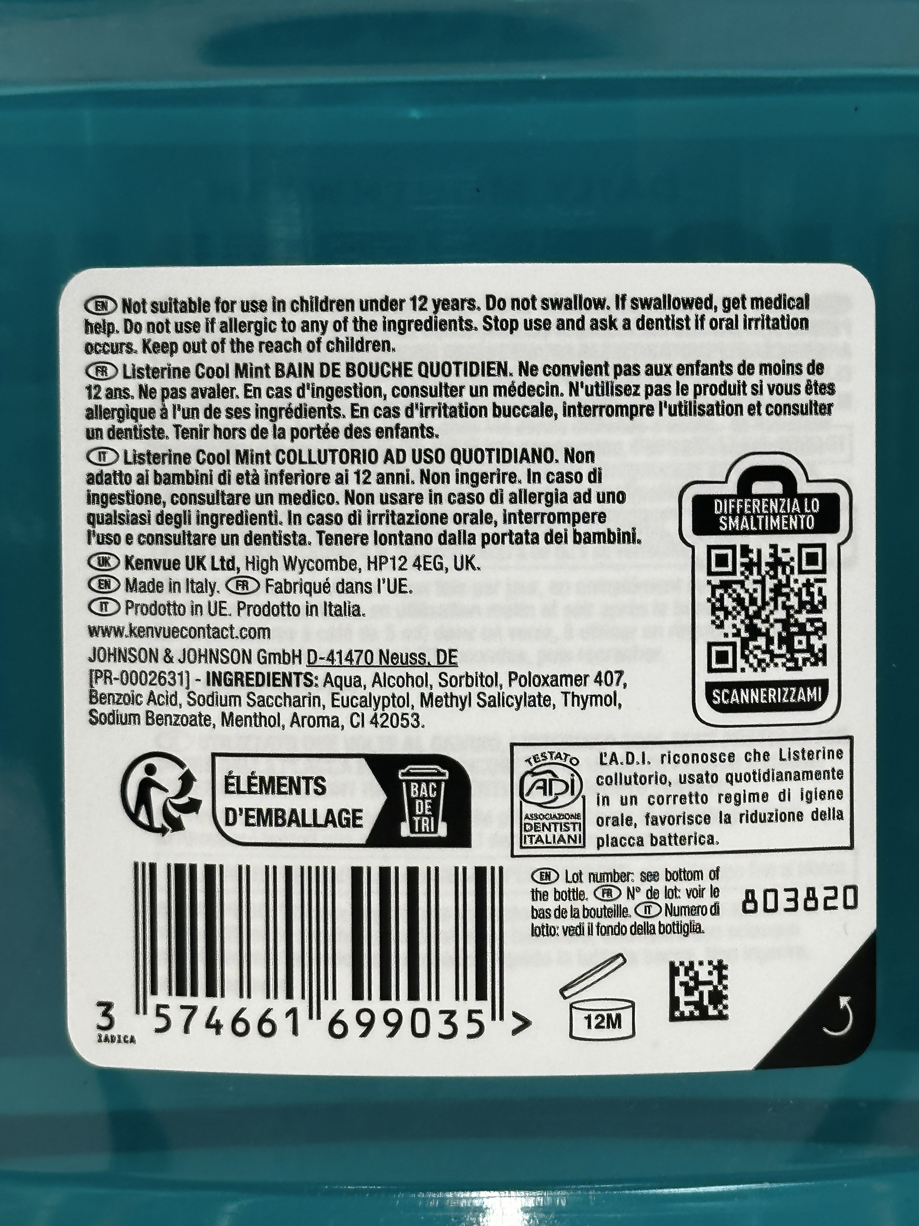 Aqua, Alcohol, Sorbitol, Poloxamer 407, Benzoic Acid, Sodium Saccharin, Eucalyptol, Methyl Salicylate, Thymol, Sodium Benzoate, Menthol, Aroma, CI 42053.