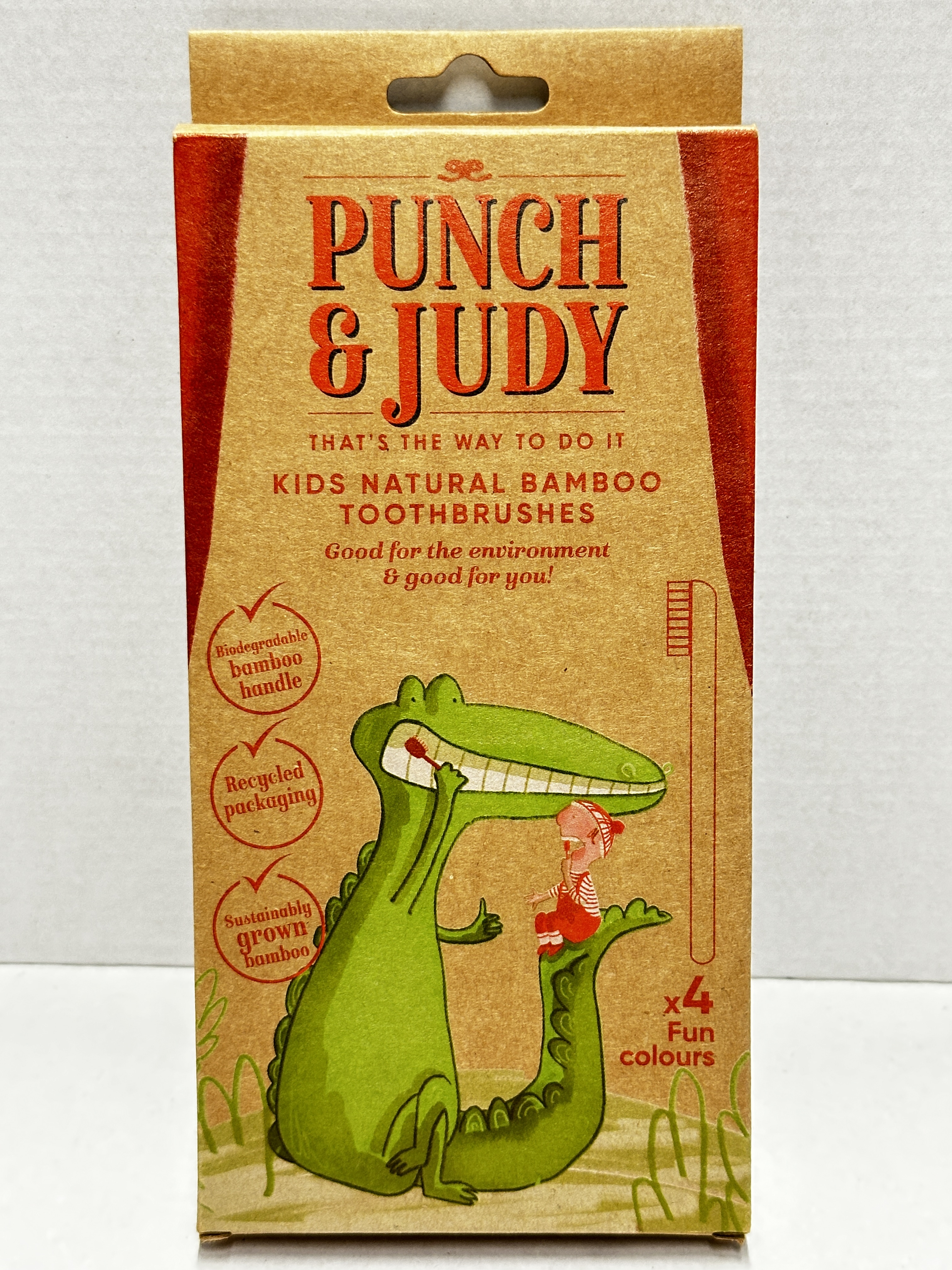 Make everyday brushing a little more fun with this Punch & Judy Kids Bamboo Toothbrushes 4 Pack. Designed for children, this multi-colour set includes 4 toothbrushes with bamboo handles and soft bristles for daily oral care.