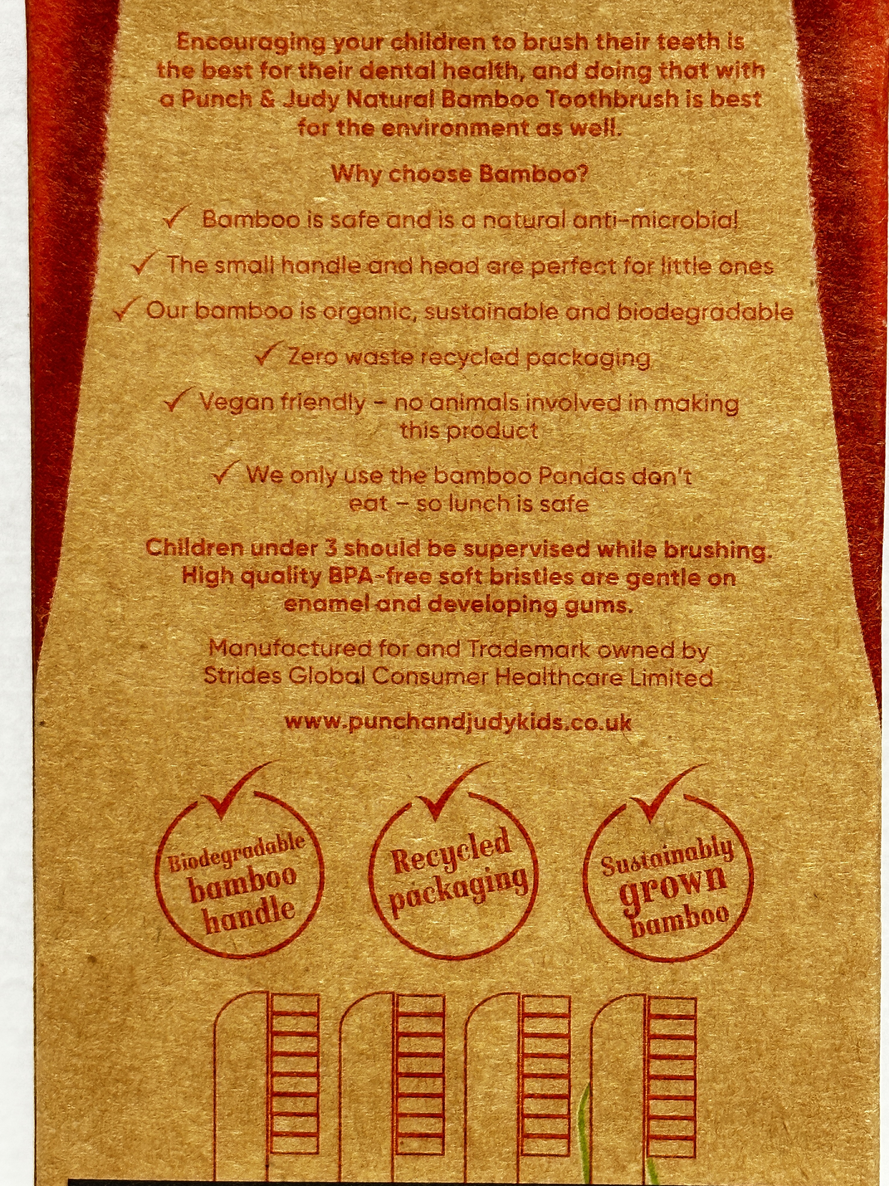 The packaging highlights biodegradable bamboo handles, recycled packaging and sustainably grown bamboo. This makes the set a practical choice for families who want a children’s toothbrush pack with an everyday use format and a more eco-conscious presentation.