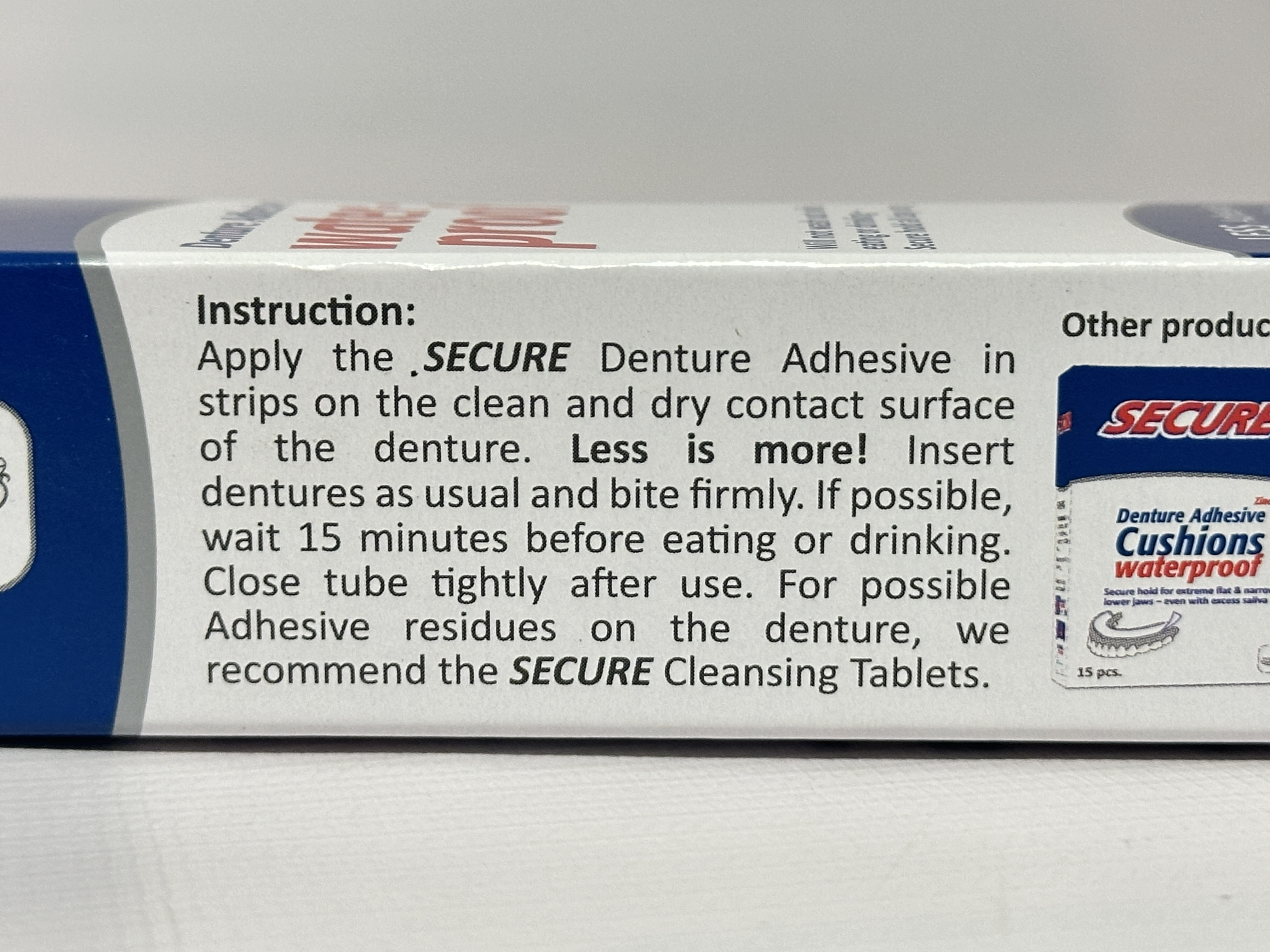 Apply Secure Denture Adhesive in thin strips to clean, dry denture contact surfaces. Insert dentures and bite firmly into place.