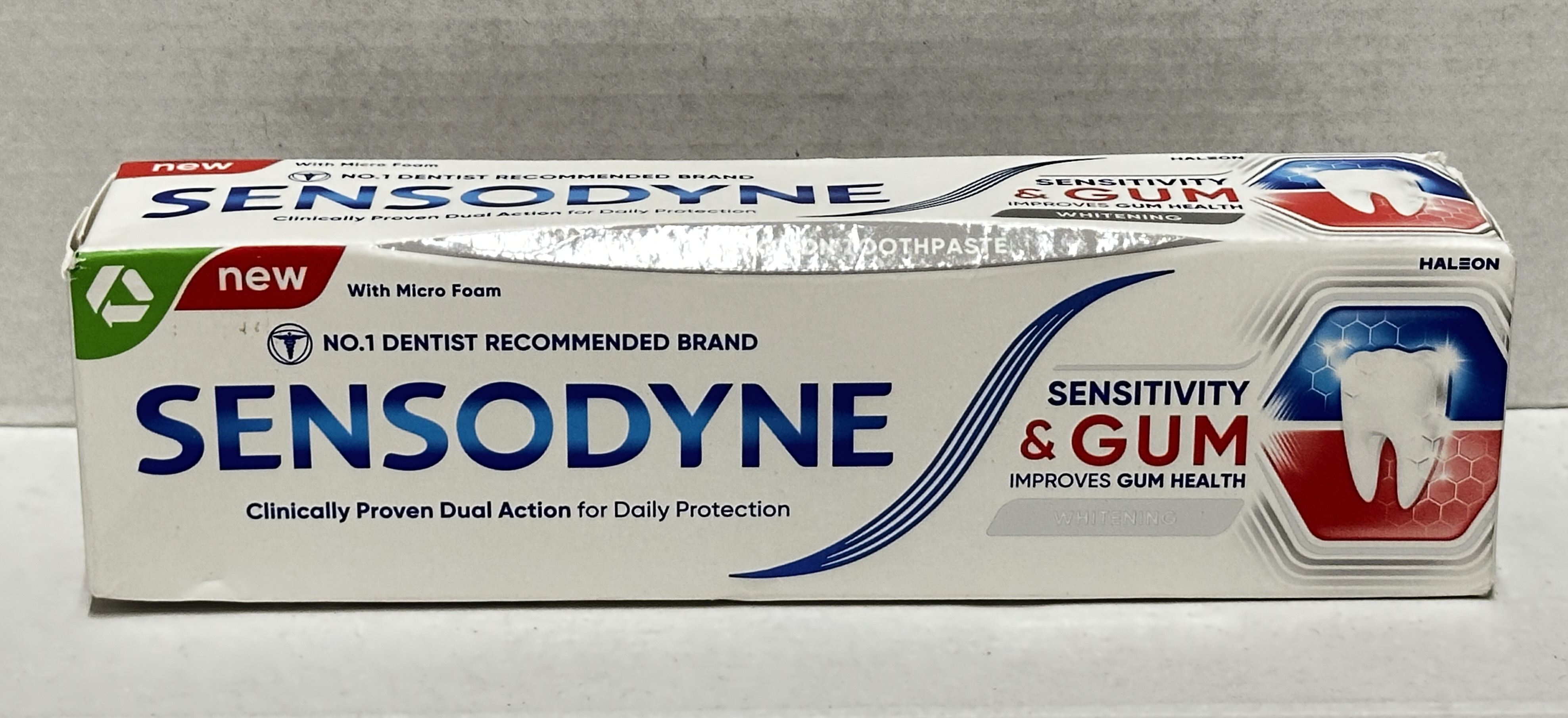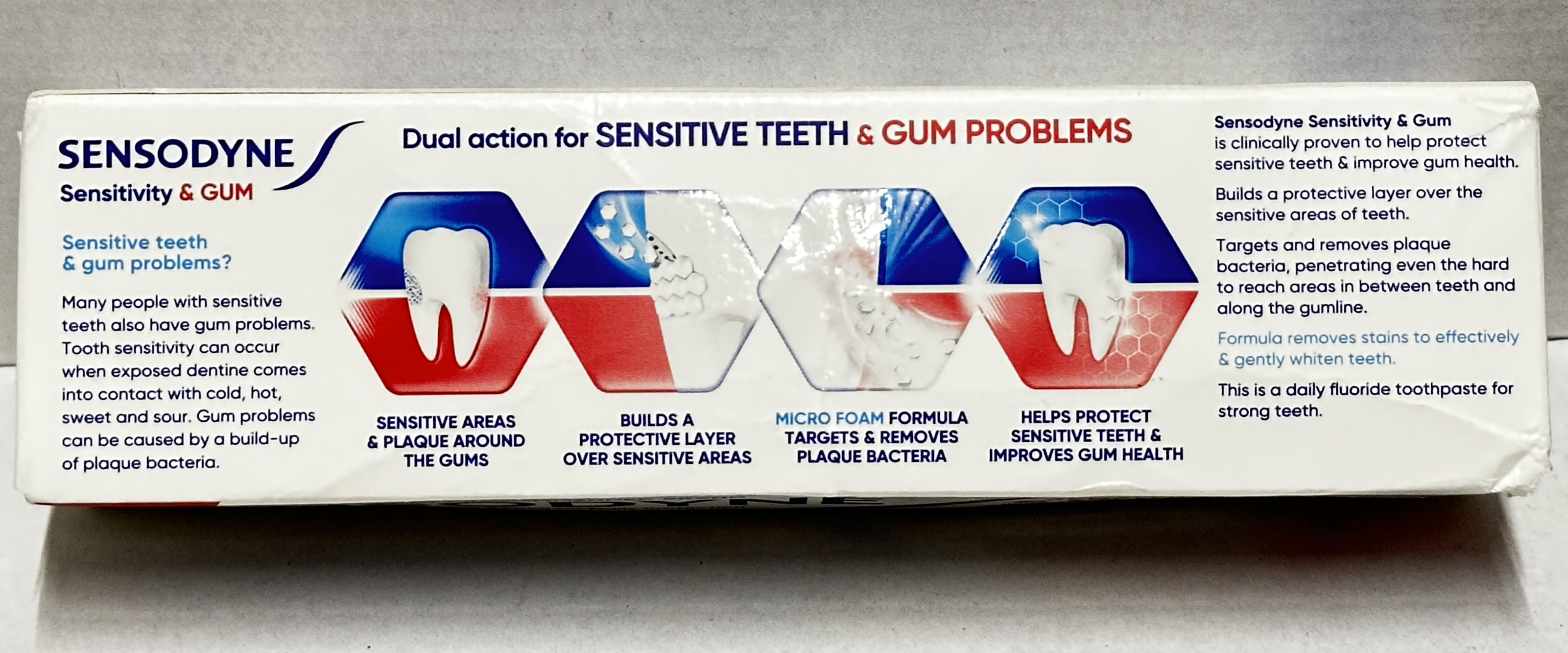 The packaging highlights dual action daily protection and states it helps improve gum health while gently whitening teeth. It is a useful everyday toothpaste option for people who want sensitive tooth protection alongside regular gum care and stain removal.