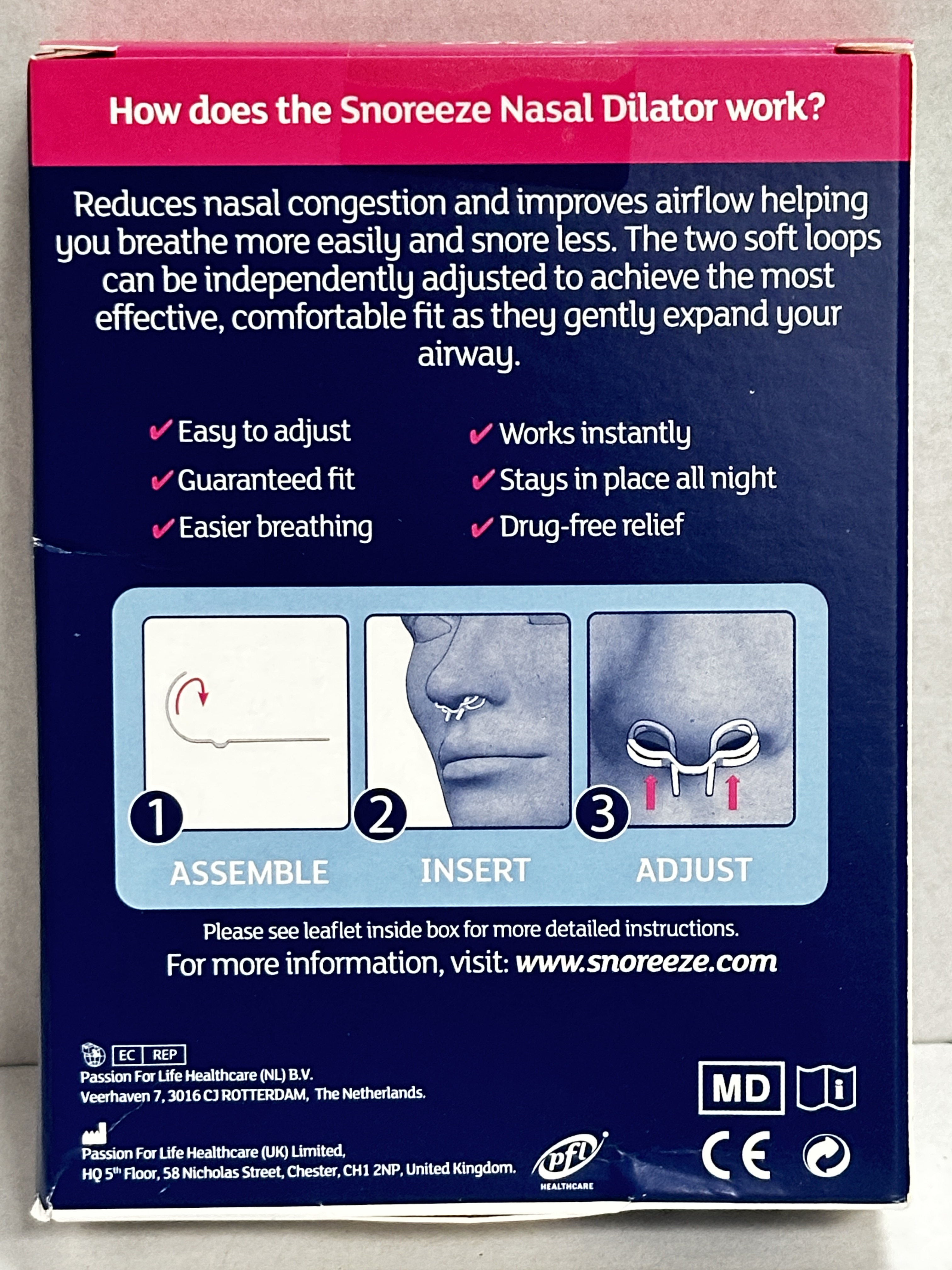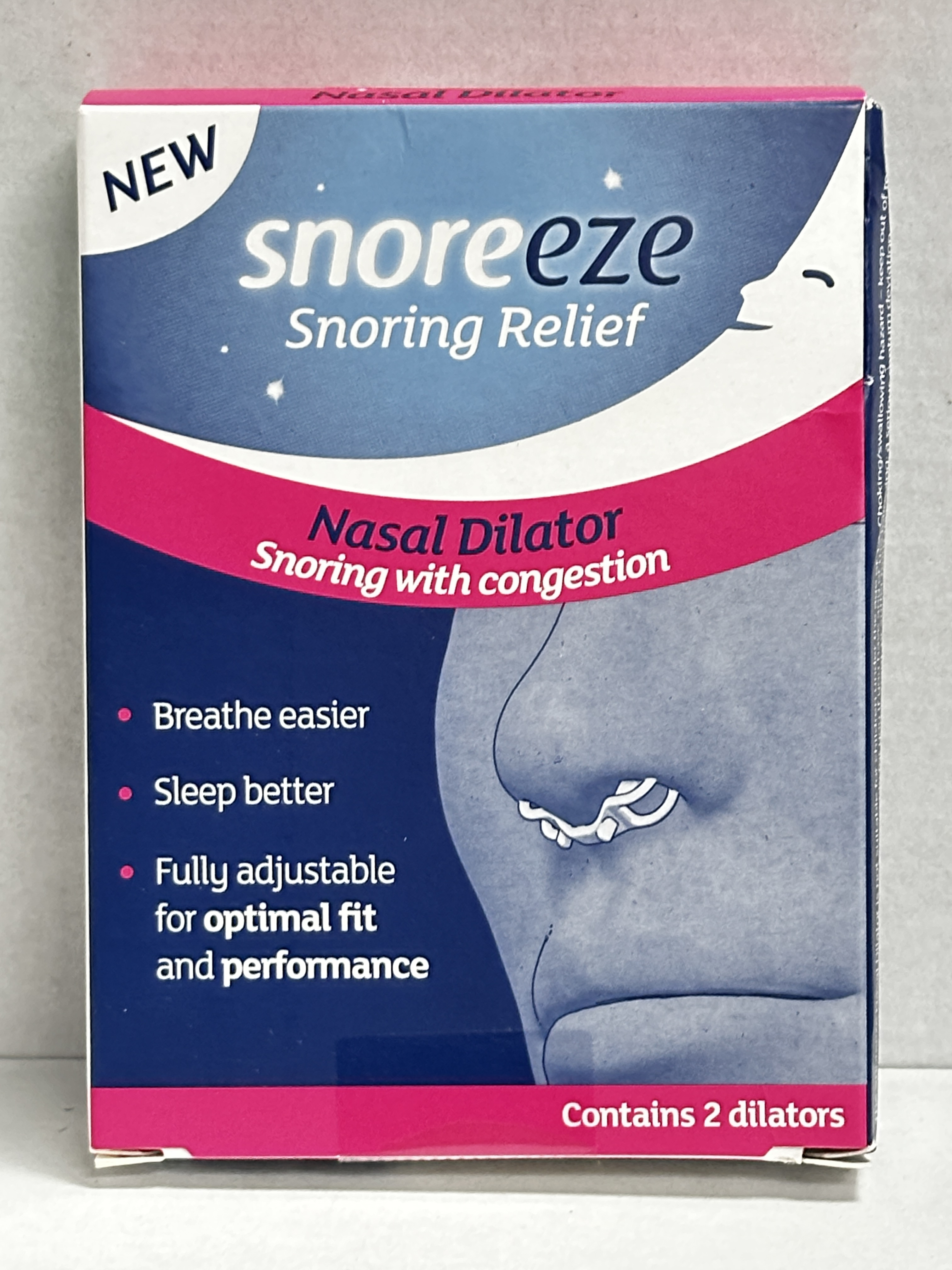 Snoreeze Nasal Dilators are designed for people whose snoring is linked to nasal congestion. This pack contains 2 soft, adjustable dilators that sit in the nose and can be adjusted for a more comfortable fit. The packaging highlights easier breathing, a secure fit through the night and simple use with assemble, insert and adjust steps.
