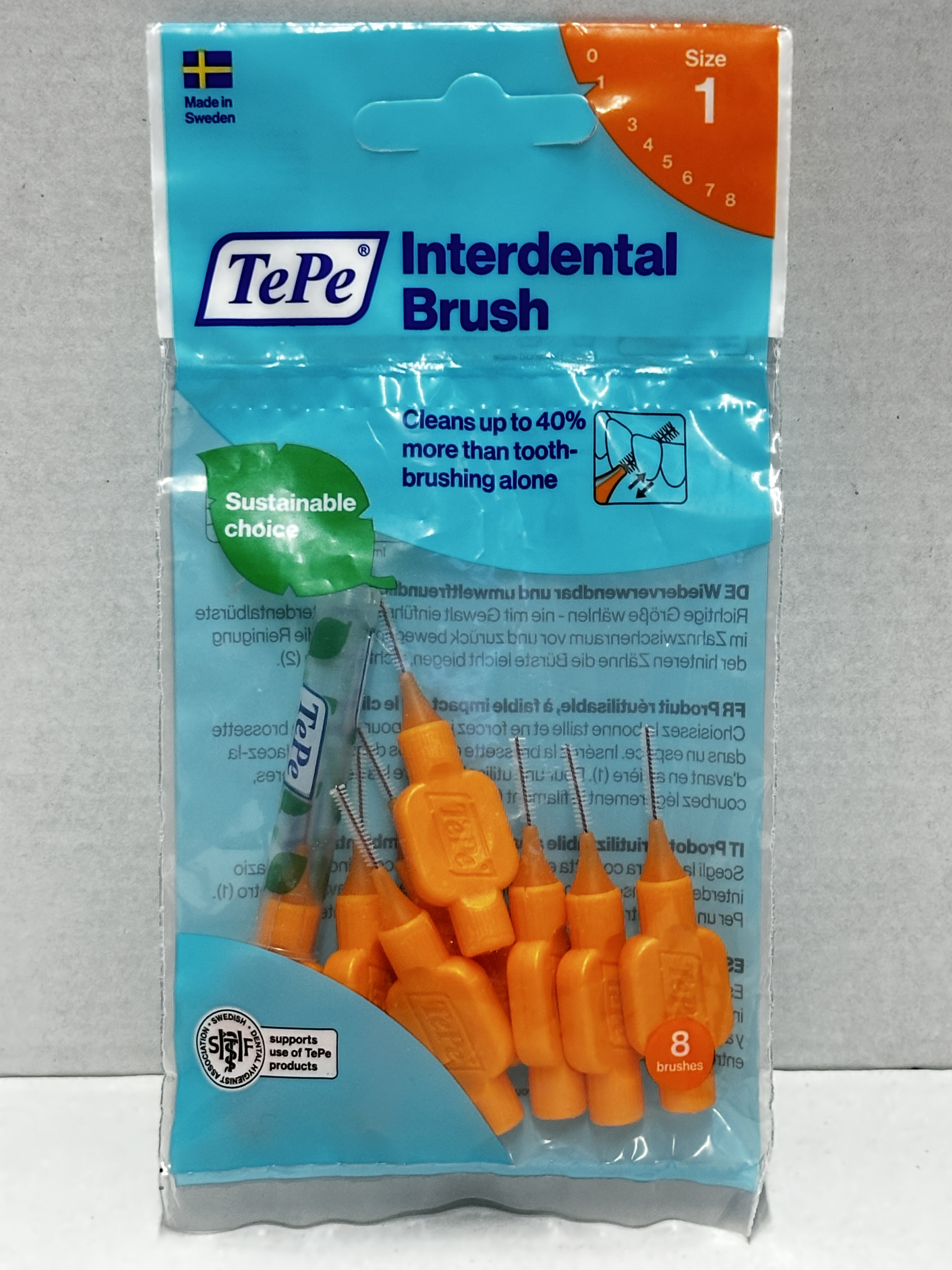 Keep daily oral care simple with TePe Interdental Brushes in orange, size 1. This pack contains 8 brushes designed for cleaning narrow gaps between teeth, helping reach areas that regular toothbrushing may miss.