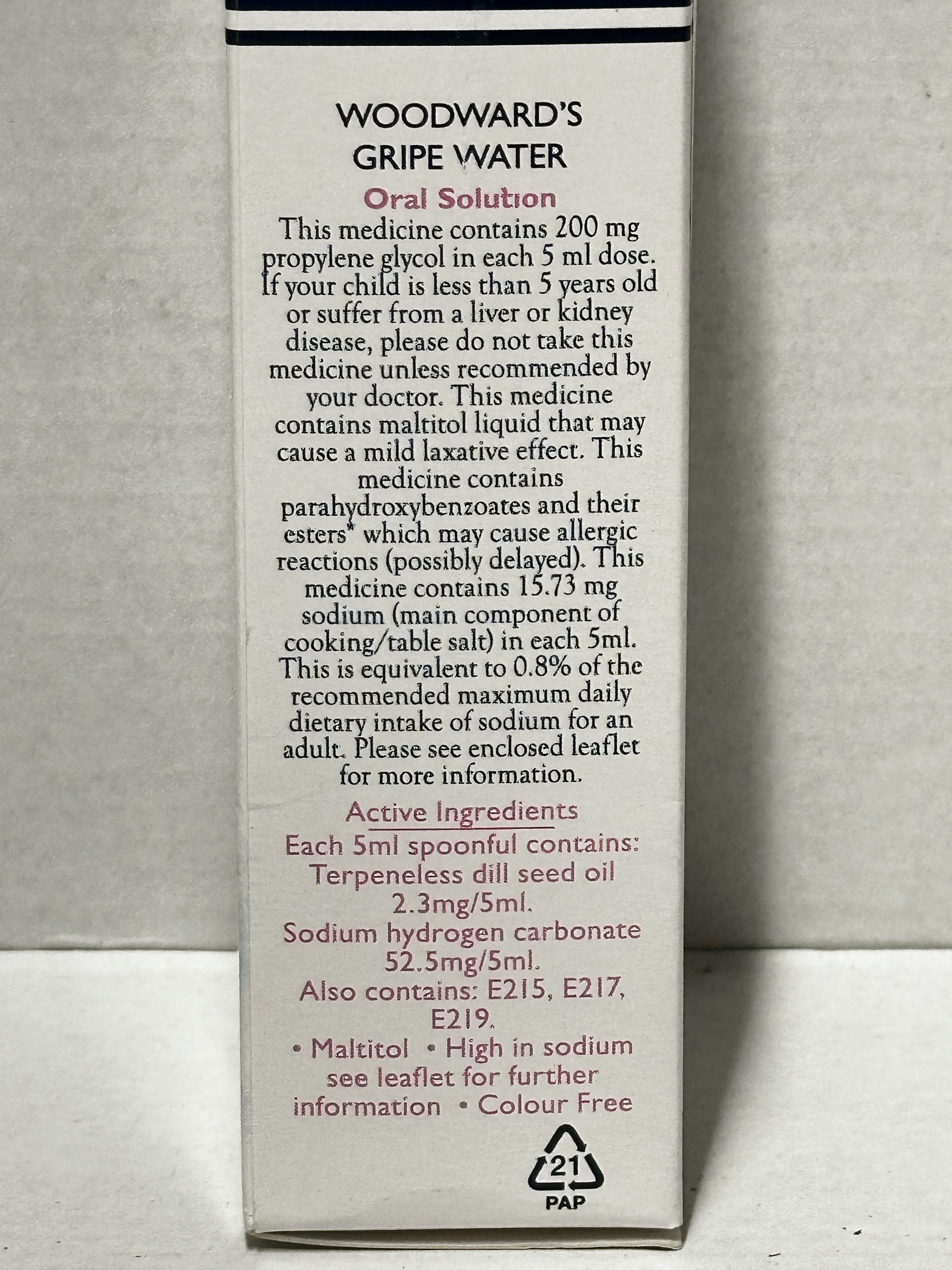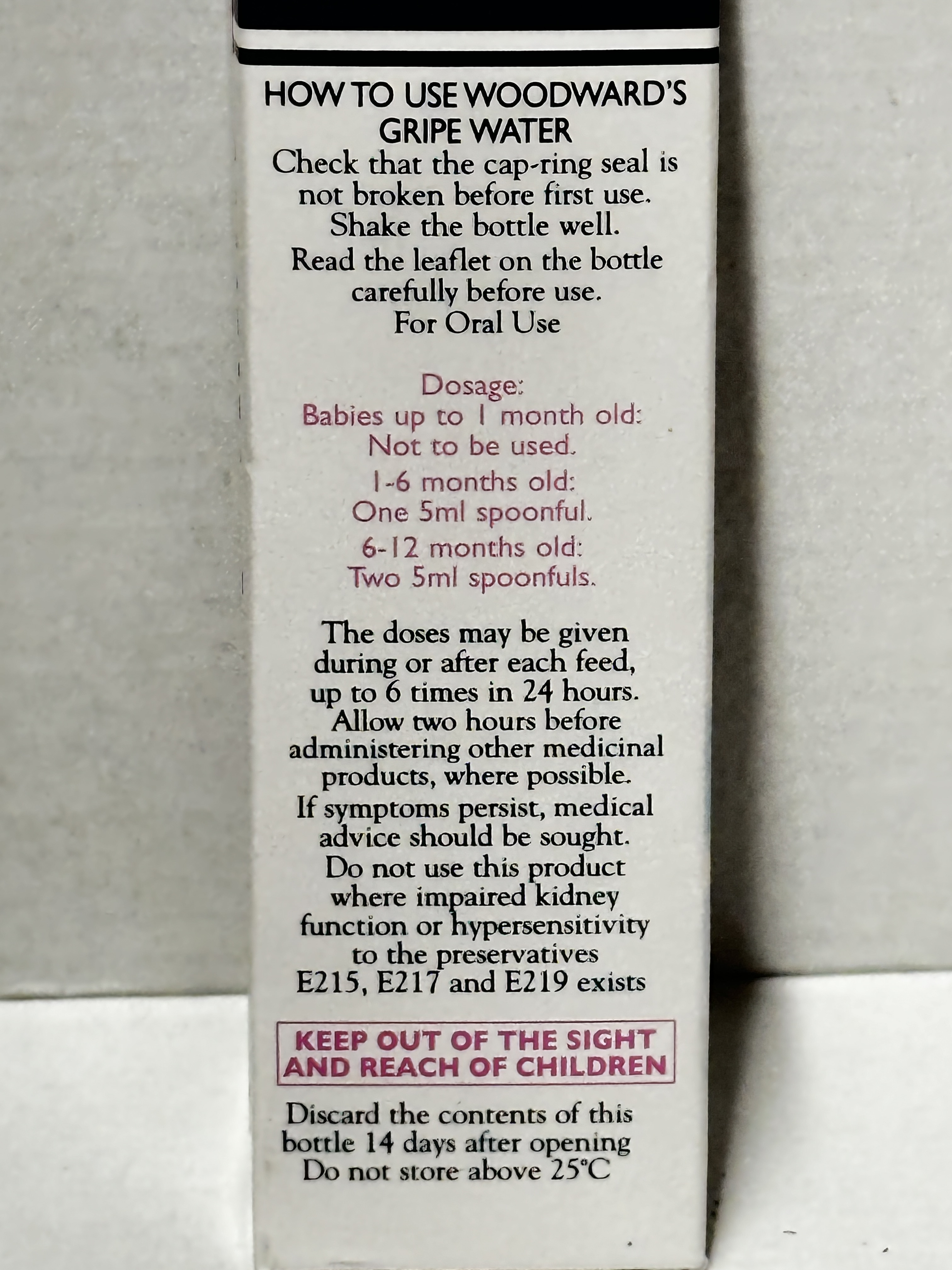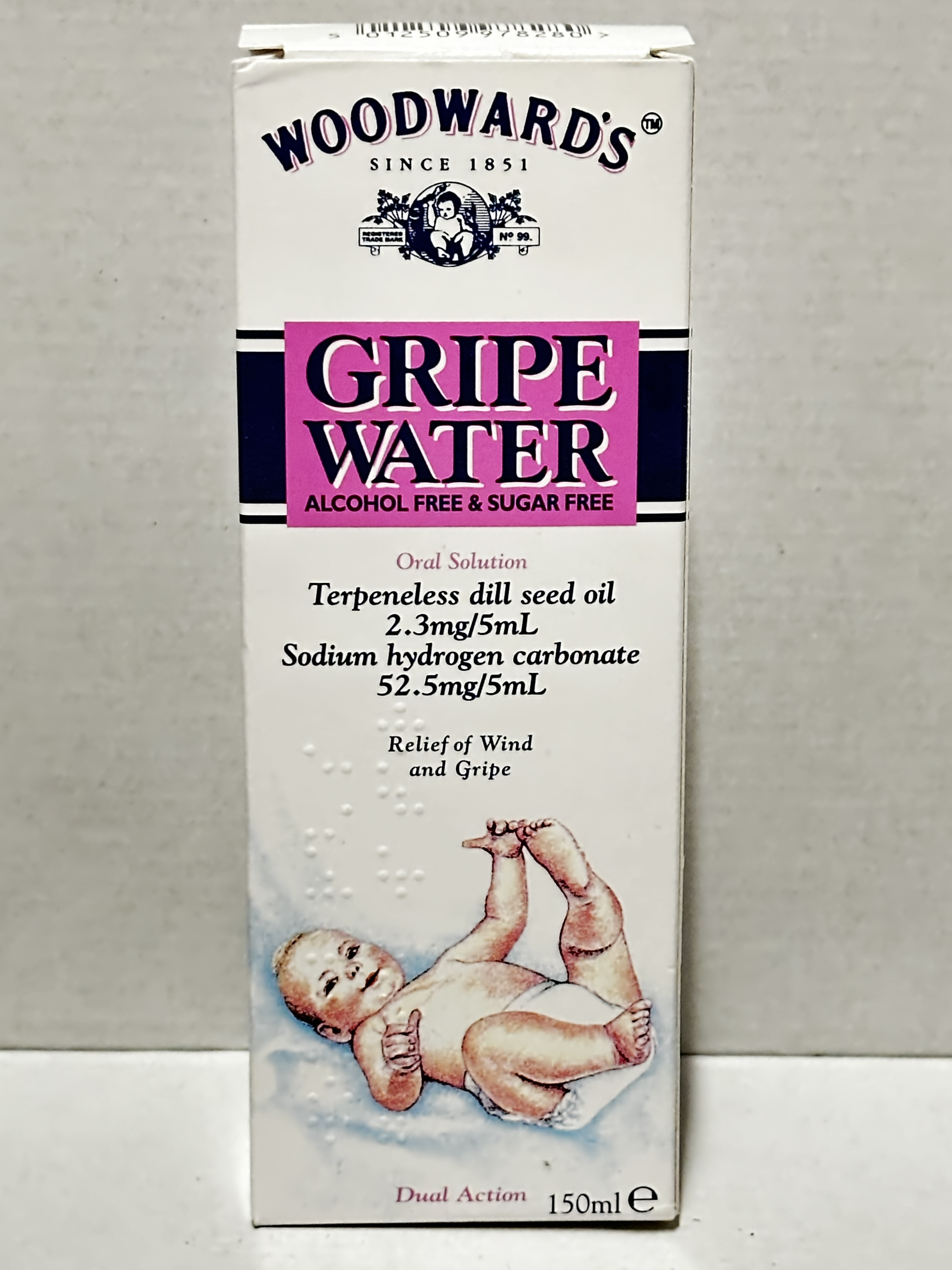Woodward’s Gripe Water is a 150ml oral solution in an alcohol free and sugar free formula. It contains terpeneless dill seed oil and sodium hydrogen carbonate in a dual action liquid format.