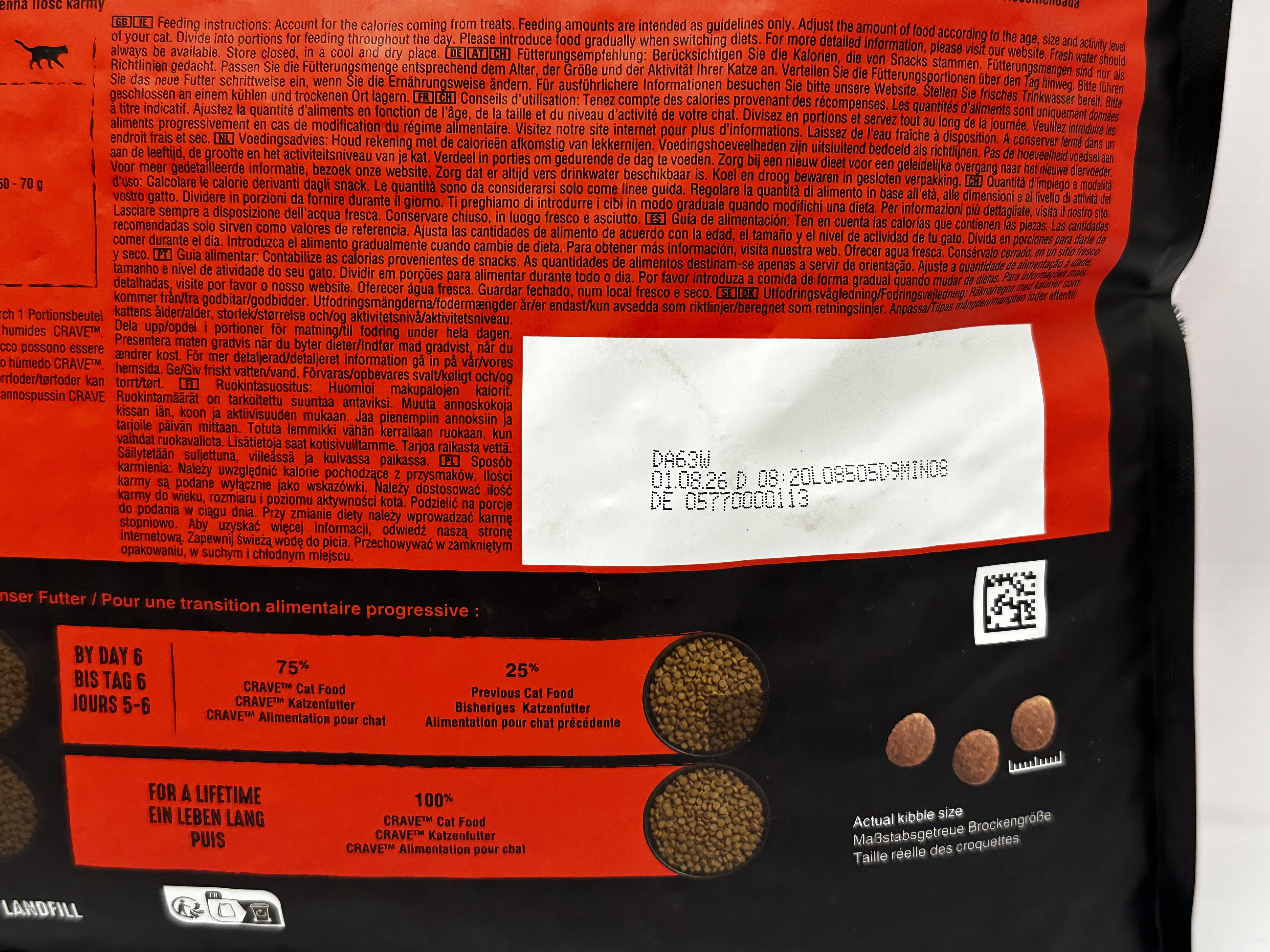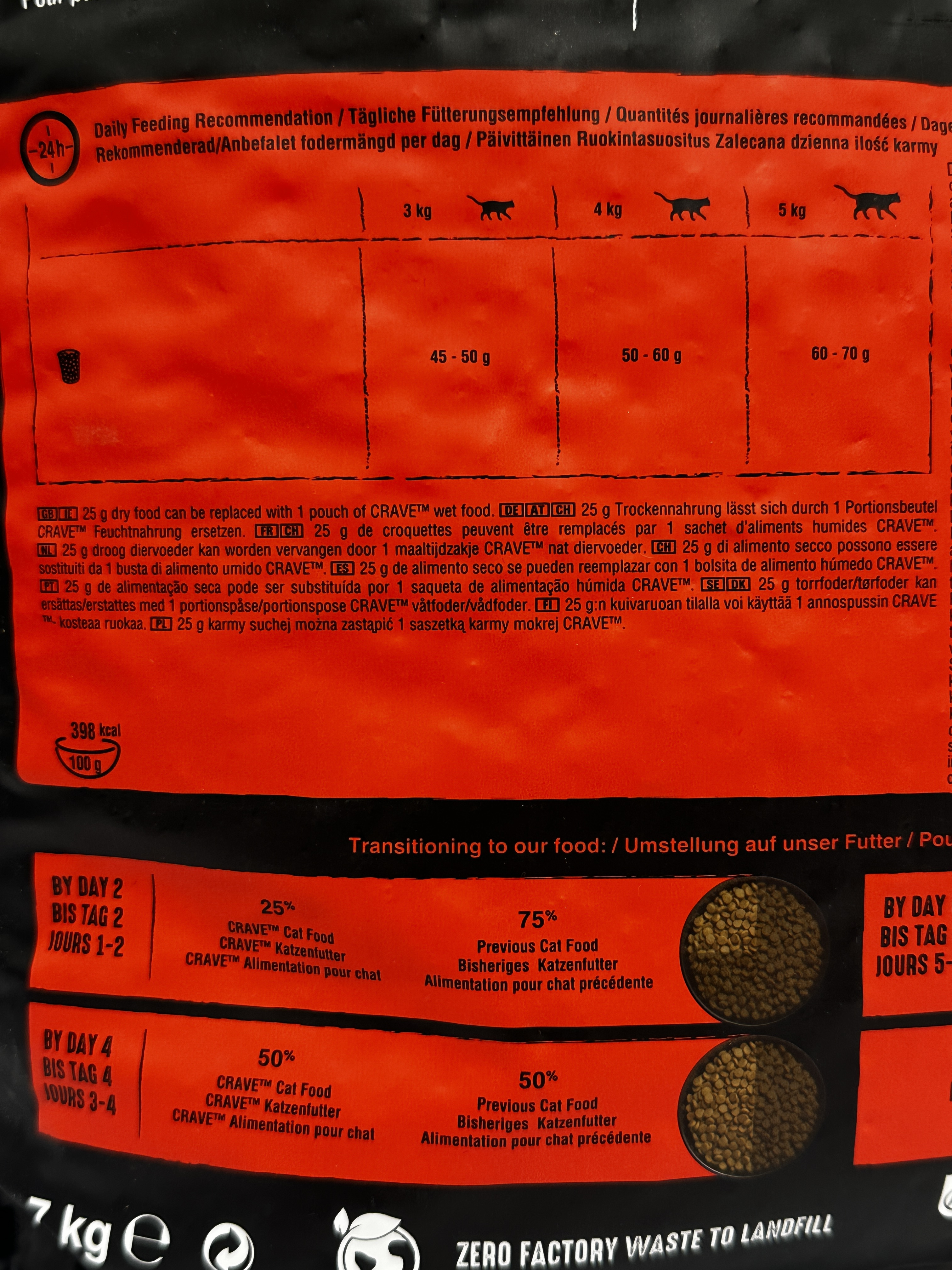 25g of dry food can be replaced with 1 pouch of CRAVE wet food. Please adjust feeding amounts to suit your cat’s age, size and activity level.