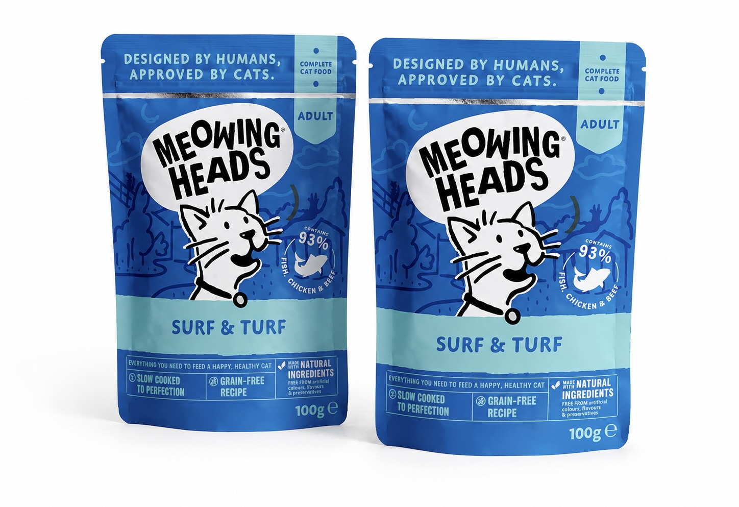 Meowing Heads Wet Cat Food - Surf & Turf - 93% Natural Fish Chicken & Beef 2 X 100g Pouches